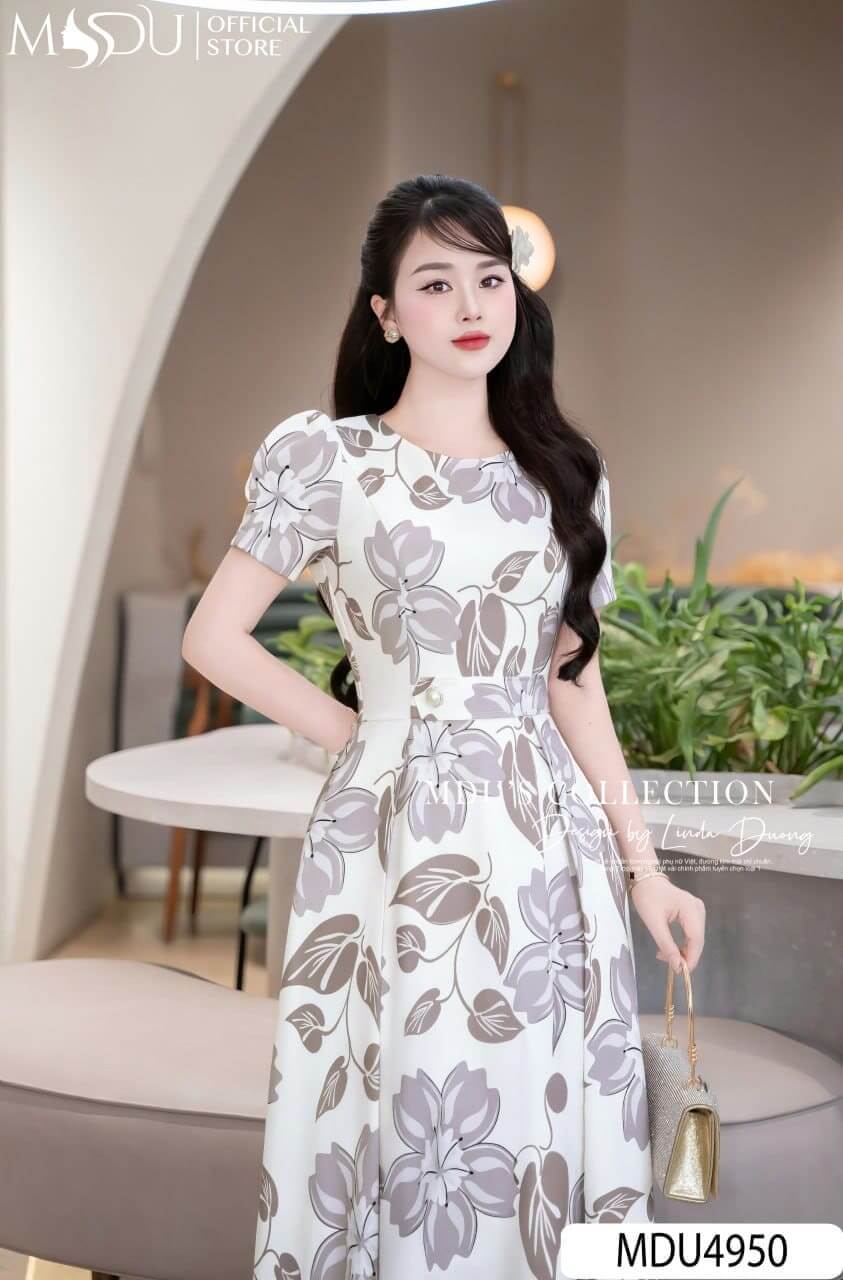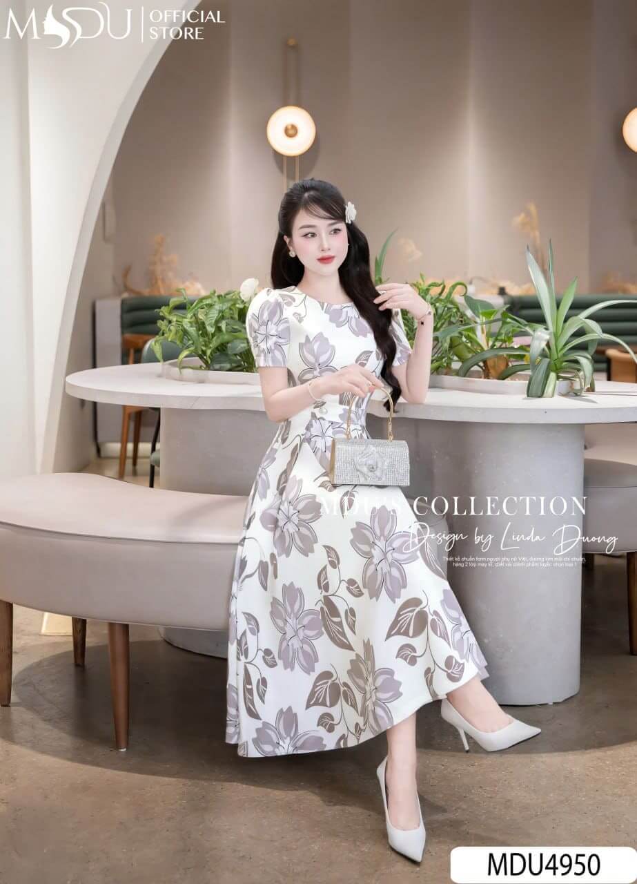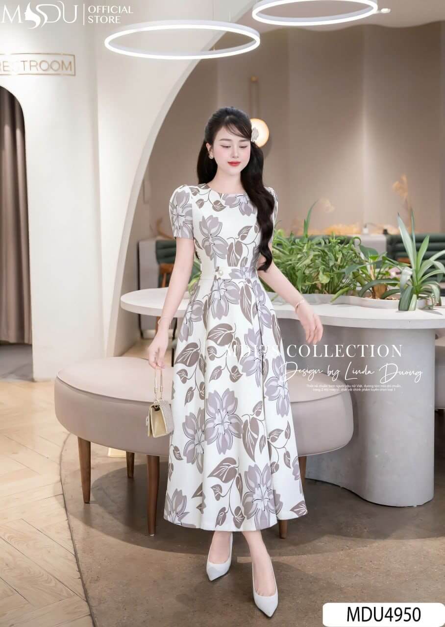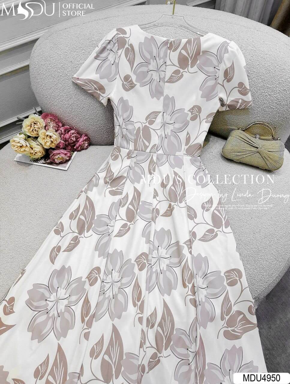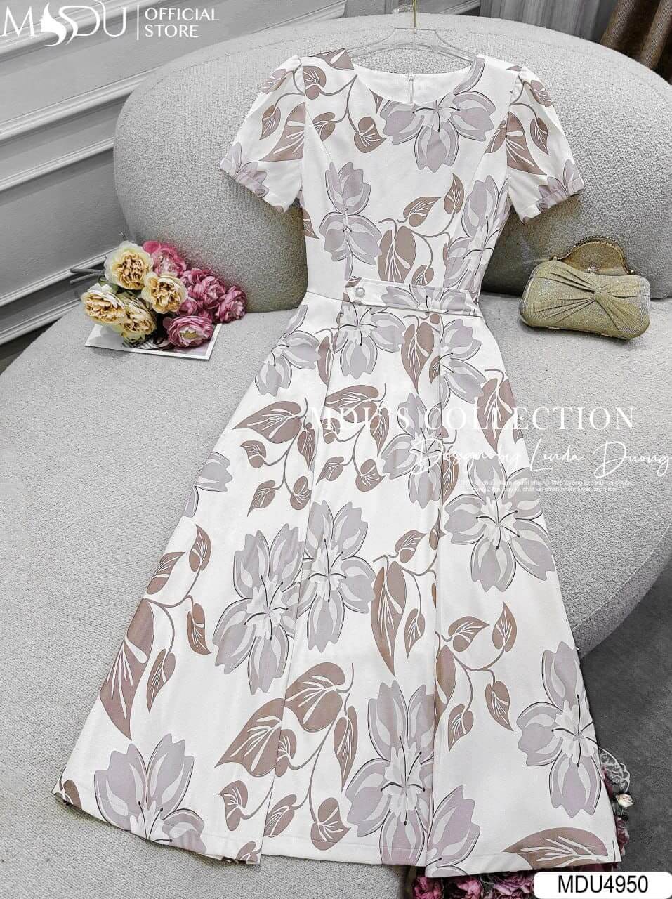 MDU Fashion giới thiệu MDU4950 – thiết kế tôn vinh vẻ đẹp nền nã và thanh lịch với chất liệu chéo Hàn cao cấp và họa tiết hoa lá phối màu trung tính gồm nâu, xám, be. Phom váy dài xòe nhẹ, tay bồng mềm mại và phần thân xếp ly tinh tế tạo nên một dáng váy chuẩn mực cho những quý cô yêu sự nhã nhặn và thanh thoát. Chi tiết đai eo liền phối cúc ngọc khéo léo nhấn vòng hai, kết hợp cùng lớp lụa Habutai mềm mịn lót trong – mang đến sự thoải mái và thẩm mỹ tuyệt đối.