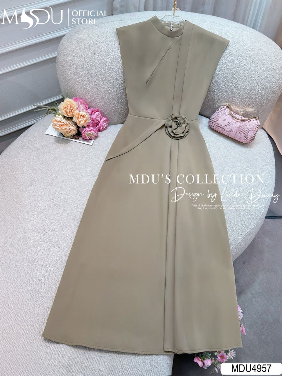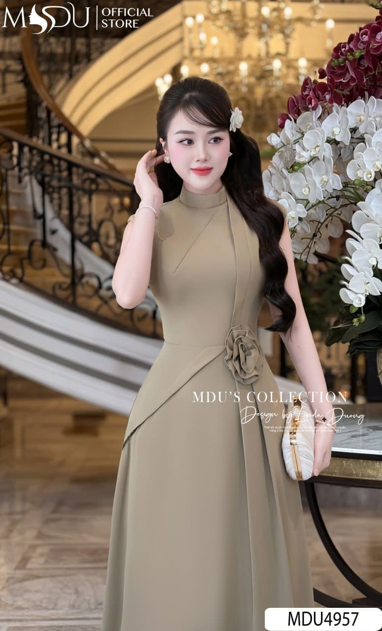Váy Thiết Kế MDU4957 Chất Chéo Nhật Mịn Lì – Dáng Dài Xòe Nhẹ – Cổ Trụ Thanh Lịch – Hoa Đính Eo Thủ Công Trang Nhã