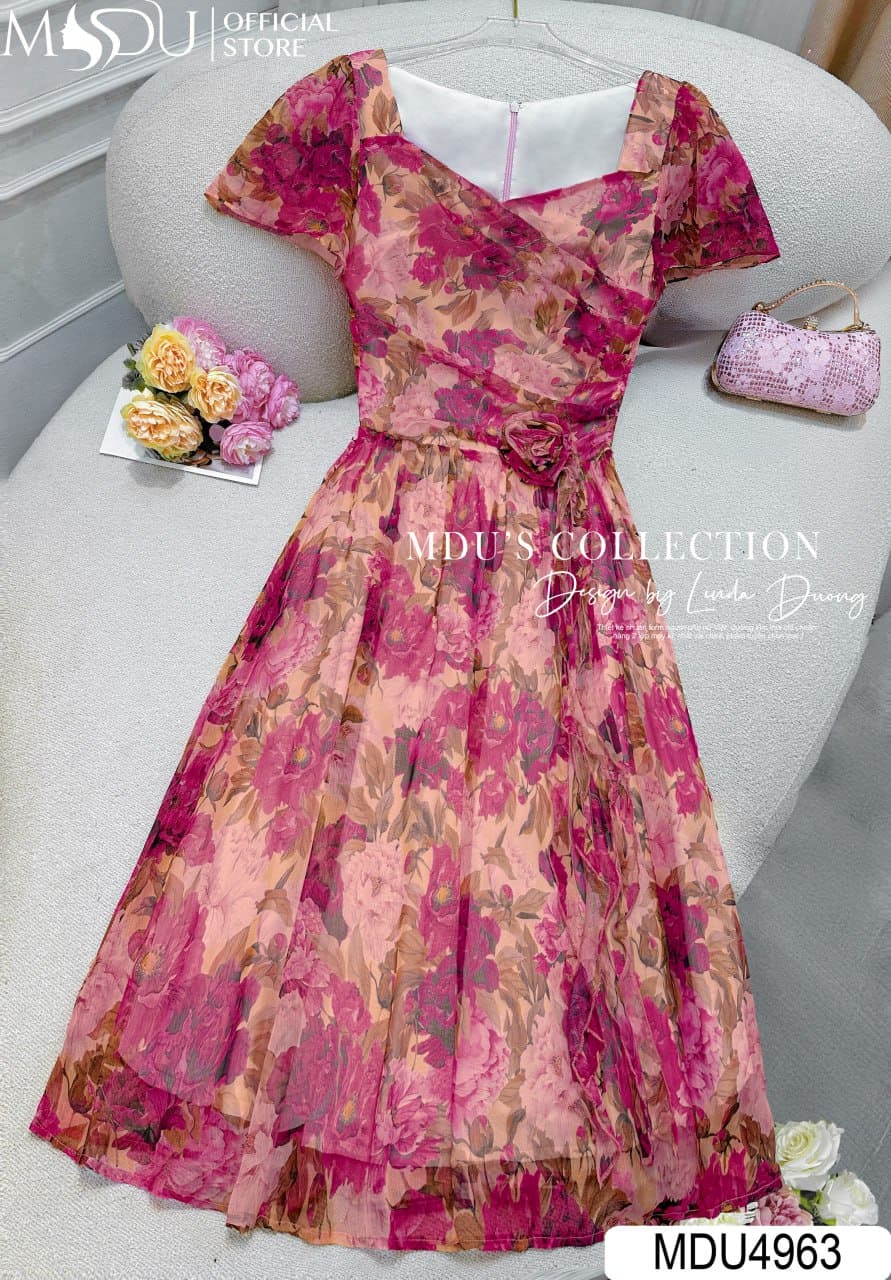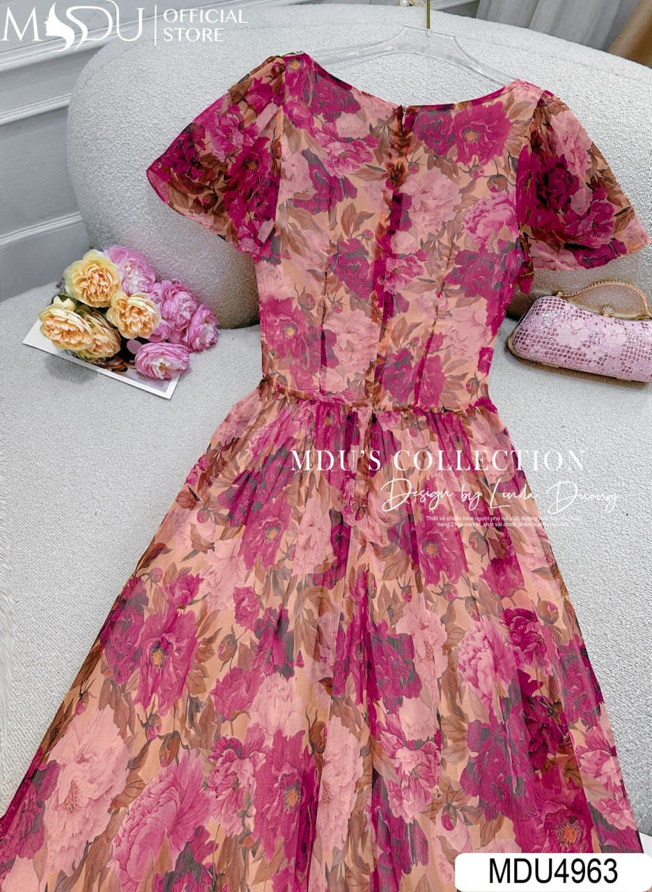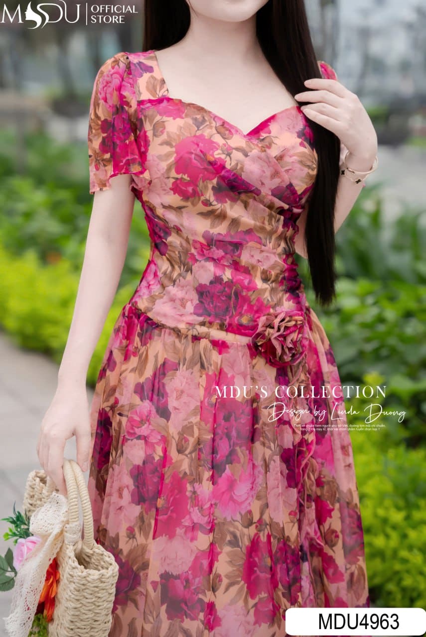 MDU4963 sử dụng cổ vuông cách điệu đầy thanh thoát, kết hợp tay cánh dơi mềm mại giúp tôn lên bờ vai nữ tính. Phần thân váy được nhấn nhá bằng dải bèo uốn lượn mềm mại và chi tiết hoa đính nổi tinh xảo – như một điểm dừng ánh nhìn tinh tế, nâng tầm toàn bộ thiết kế. Dáng xòe nhẹ, phối màu hoa nghệ thuật cùng sự chỉn chu trong từng chi tiết khiến chiếc váy trở thành lựa chọn lý tưởng cho nàng trong những khoảnh khắc cần tỏa sáng theo cách nhẹ nhàng nhất.