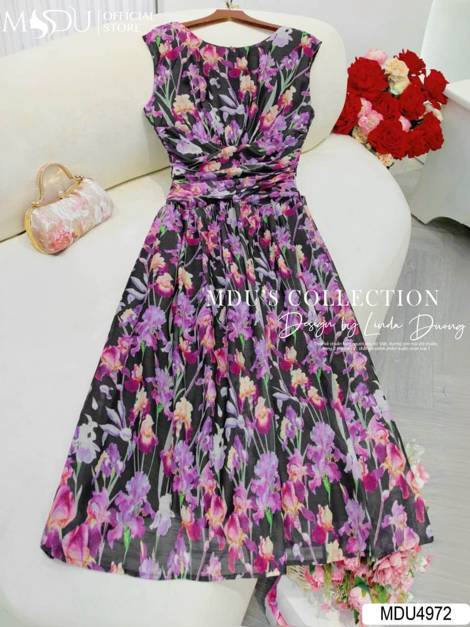 Váy Thiết Kế MDU4972 – Tơ Gân Xước Hoa Hồng Tím, Xếp Nếp Eo Tôn Dáng, Chân Váy Xếp Ly Duyên Dáng