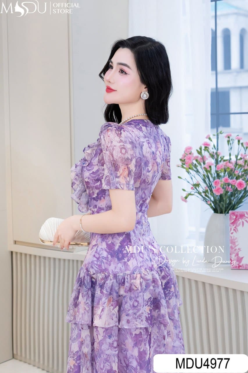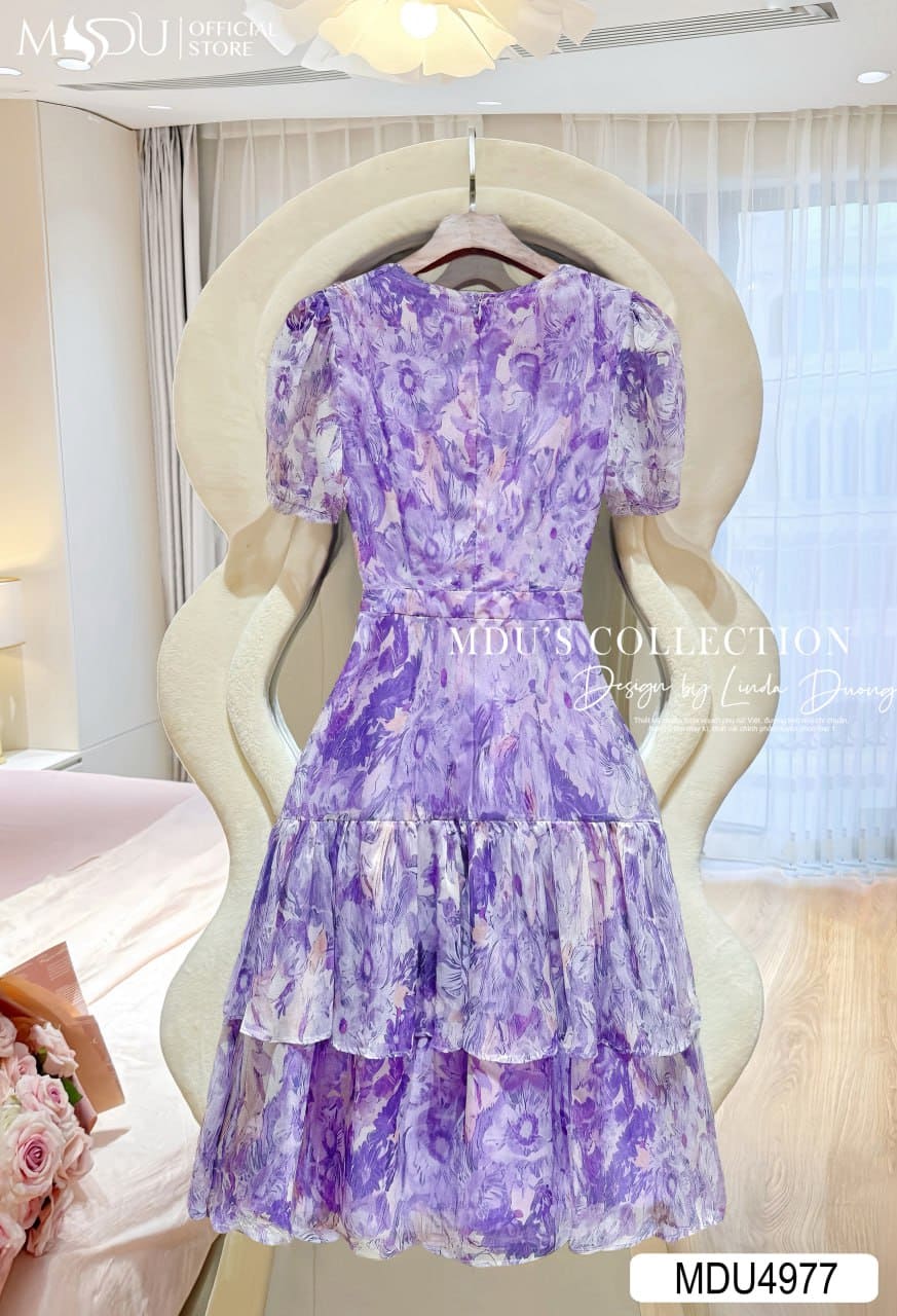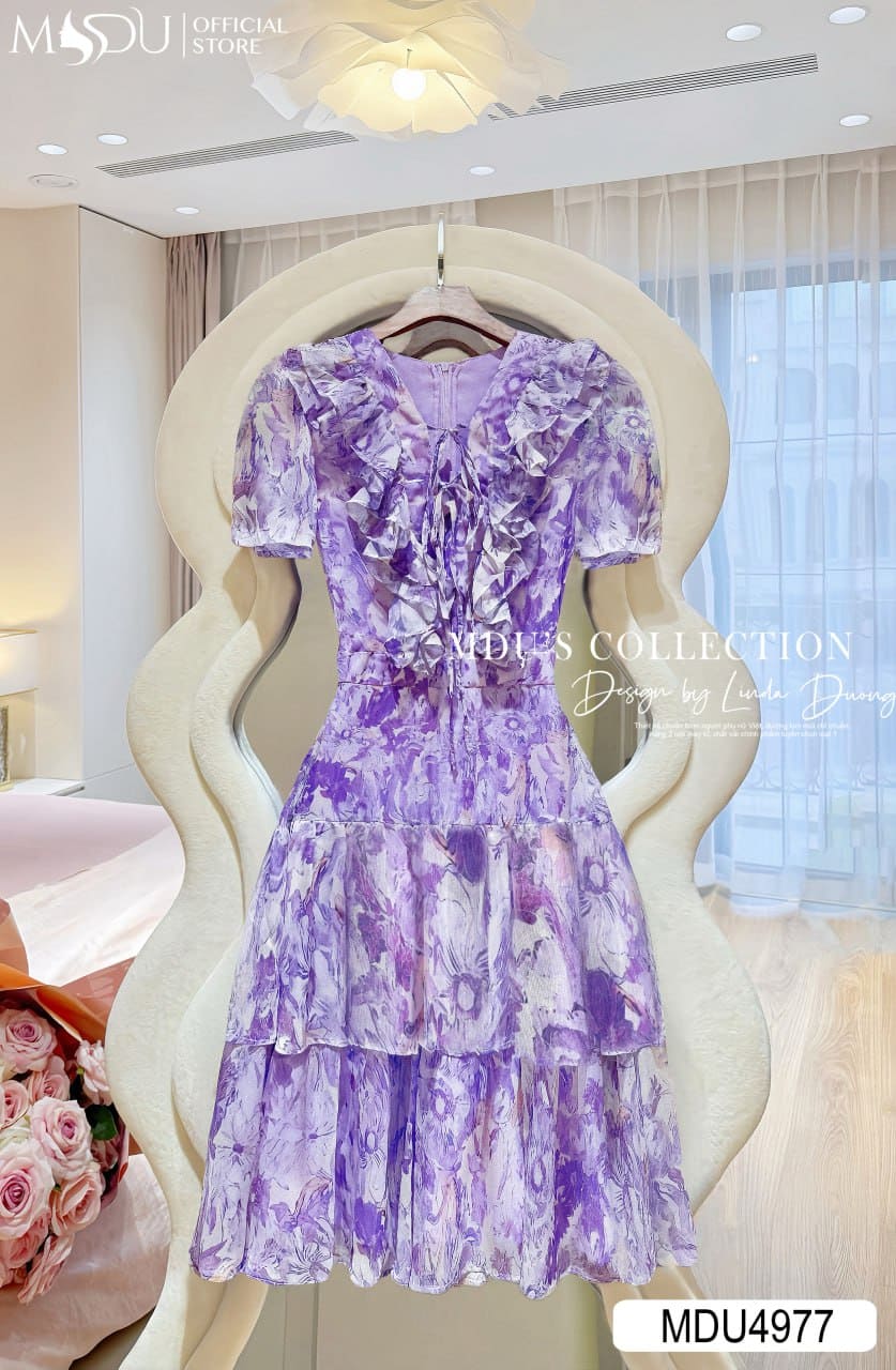 Váy Thiết Kế MDU4977 Tơ Xước Hoa Loang Tím Dáng Xòe Tầng Bèo Nhún Cổ Dây Rút