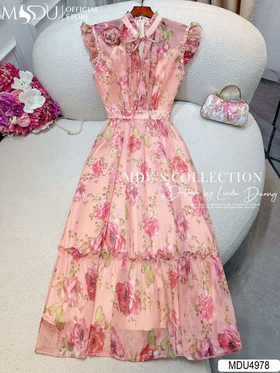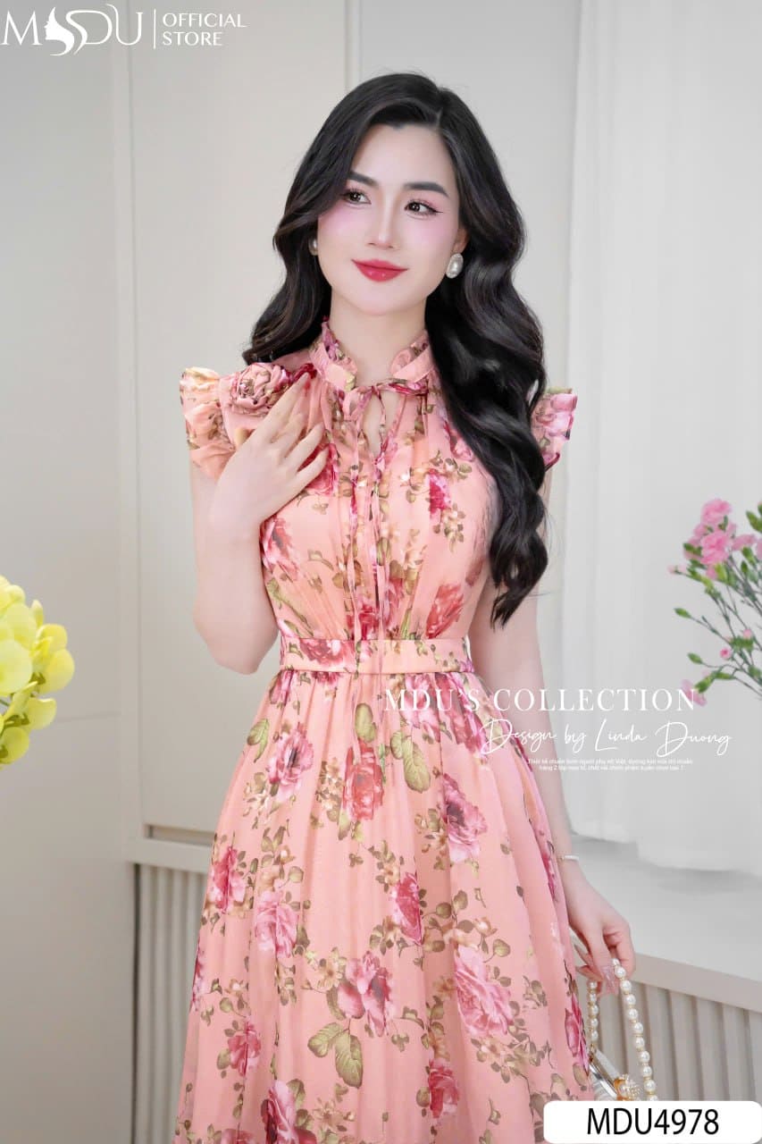 Váy Thiết Kế MDU4978 Tơ Xước Cao Cấp Họa Tiết Hoa Nhí Cổ Buộc Nơ Chiết Eo Dáng Xòe Nhẹ Nhàng