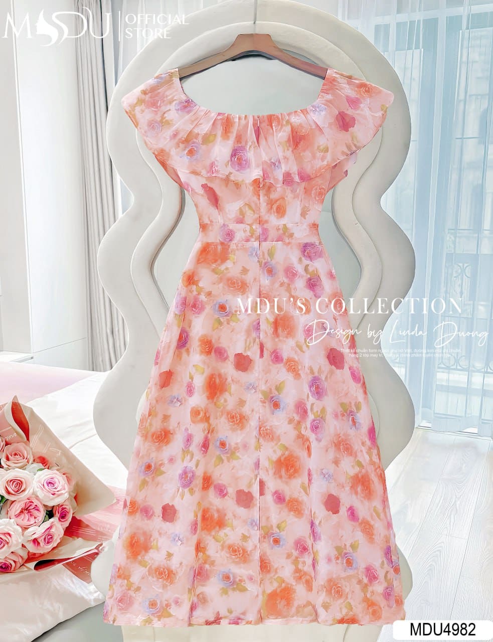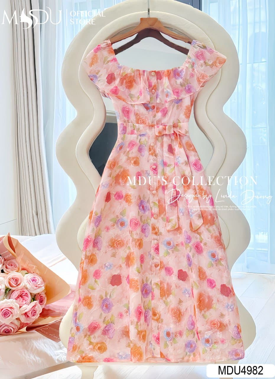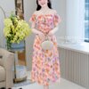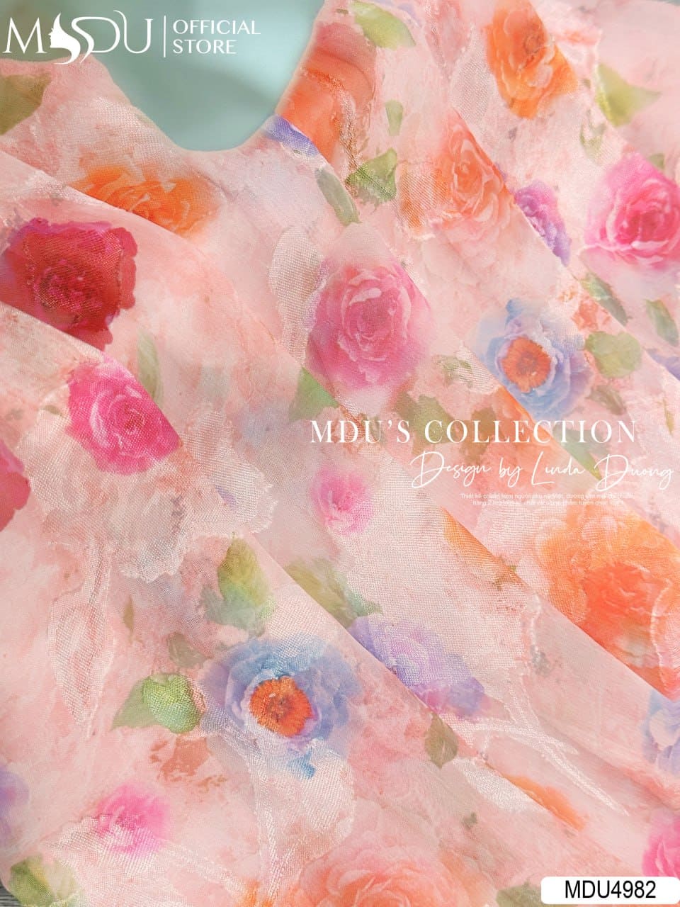 Váy Thiết Kế MDU4982 Tằm Ép Vân Hoa Cao Cấp Họa Tiết Hồng Đa Sắc Tay Bồng Biến Tấu