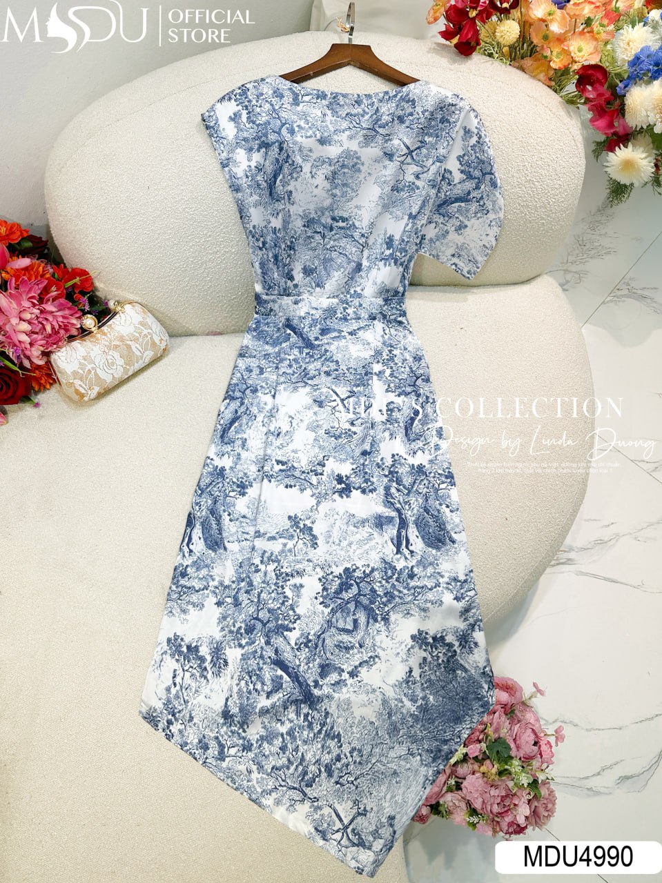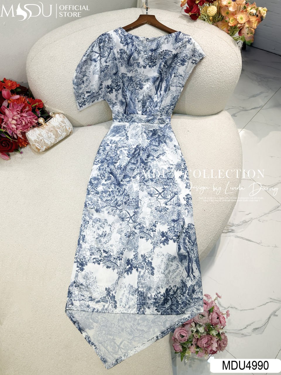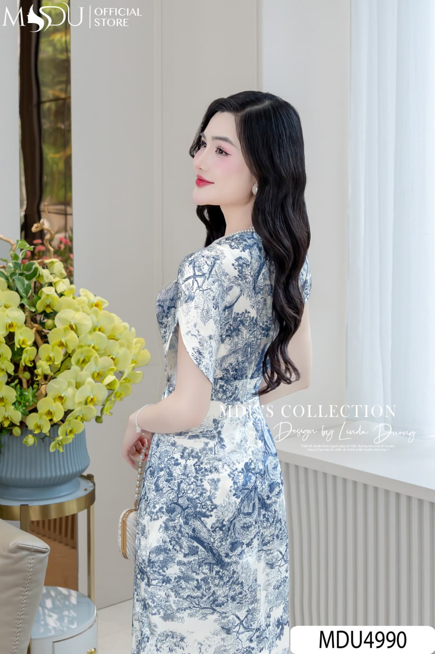 Váy Thiết Kế MDU4990 Lụa Satin In Họa Tiết – Cổ Thuyền Tay Xẻ Cách Điệu – Dáng Ôm Nhẹ Chiết Eo Tinh Tế