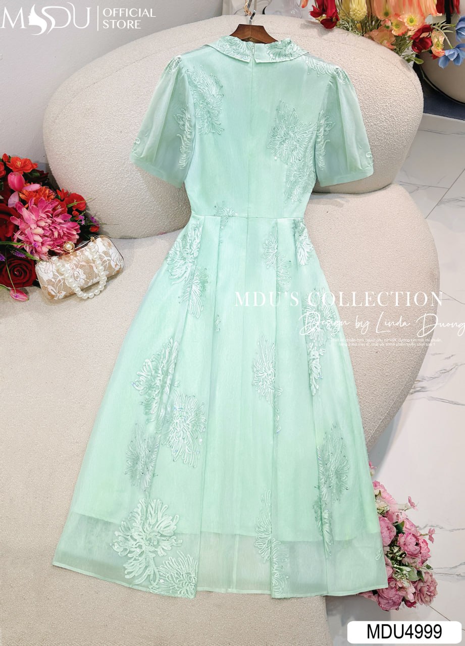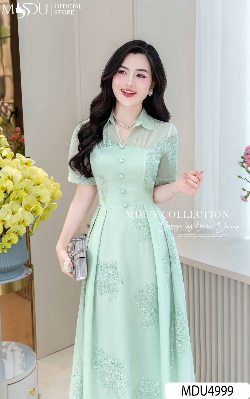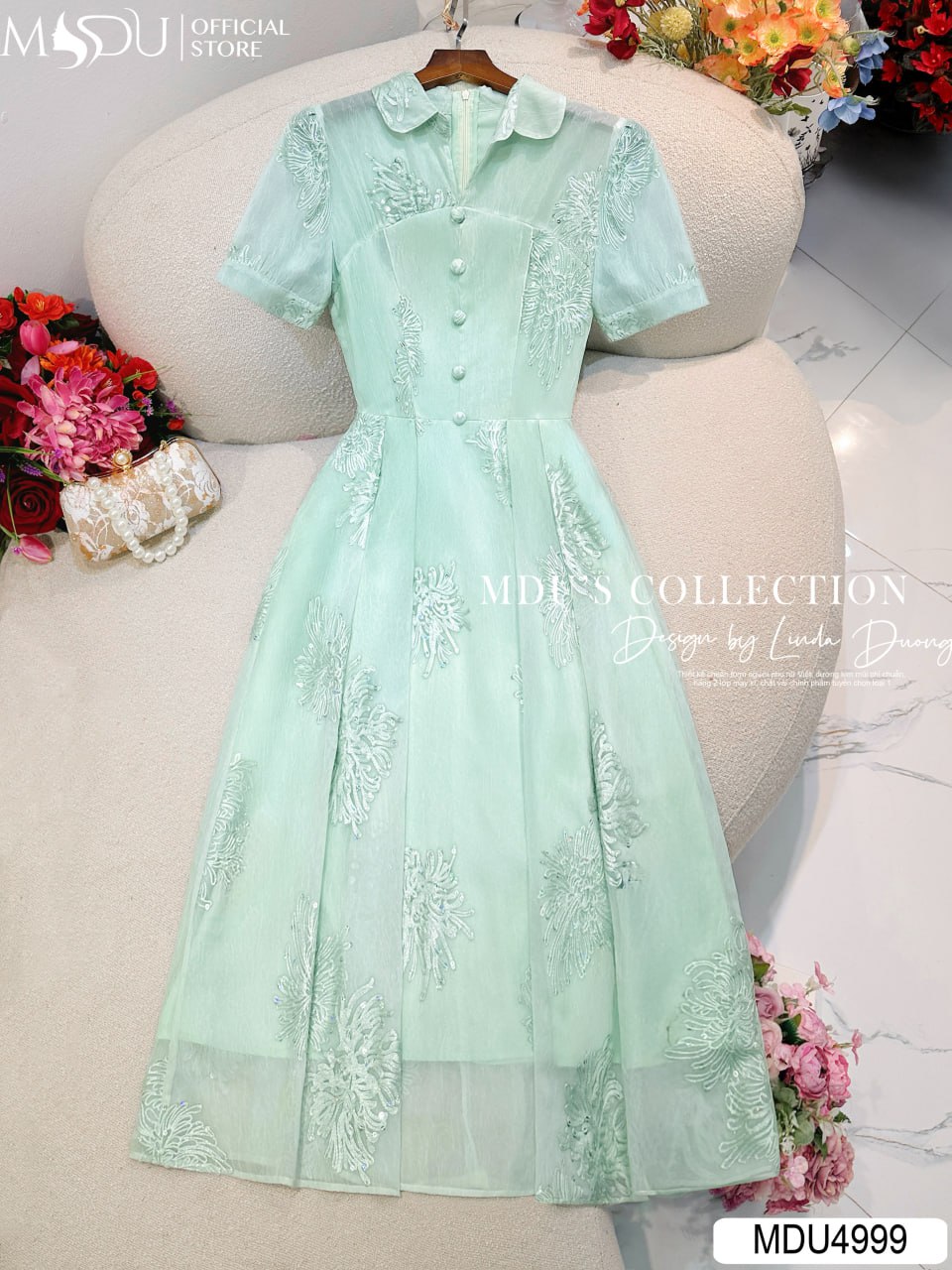 Váy Thiết Kế MDU4999 Tơ Hoa Thêu Nổi Sang Trọng – Cổ Sơ Mi Cúc Bọc – Dáng Xòe Ly Thướt Tha
