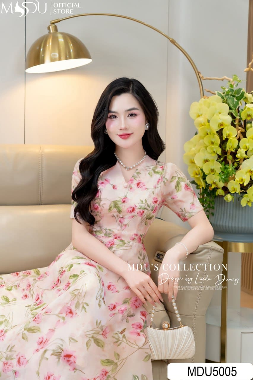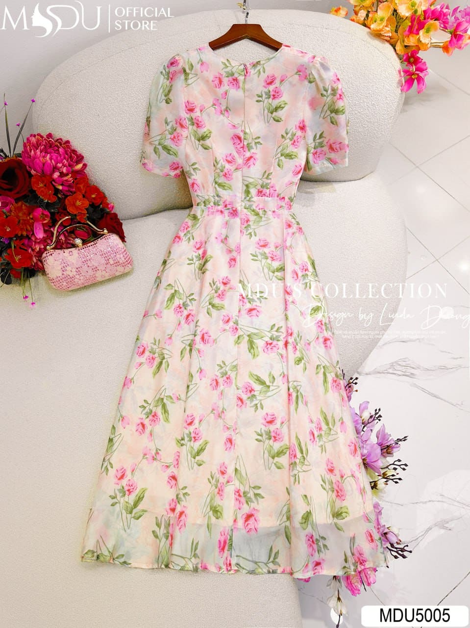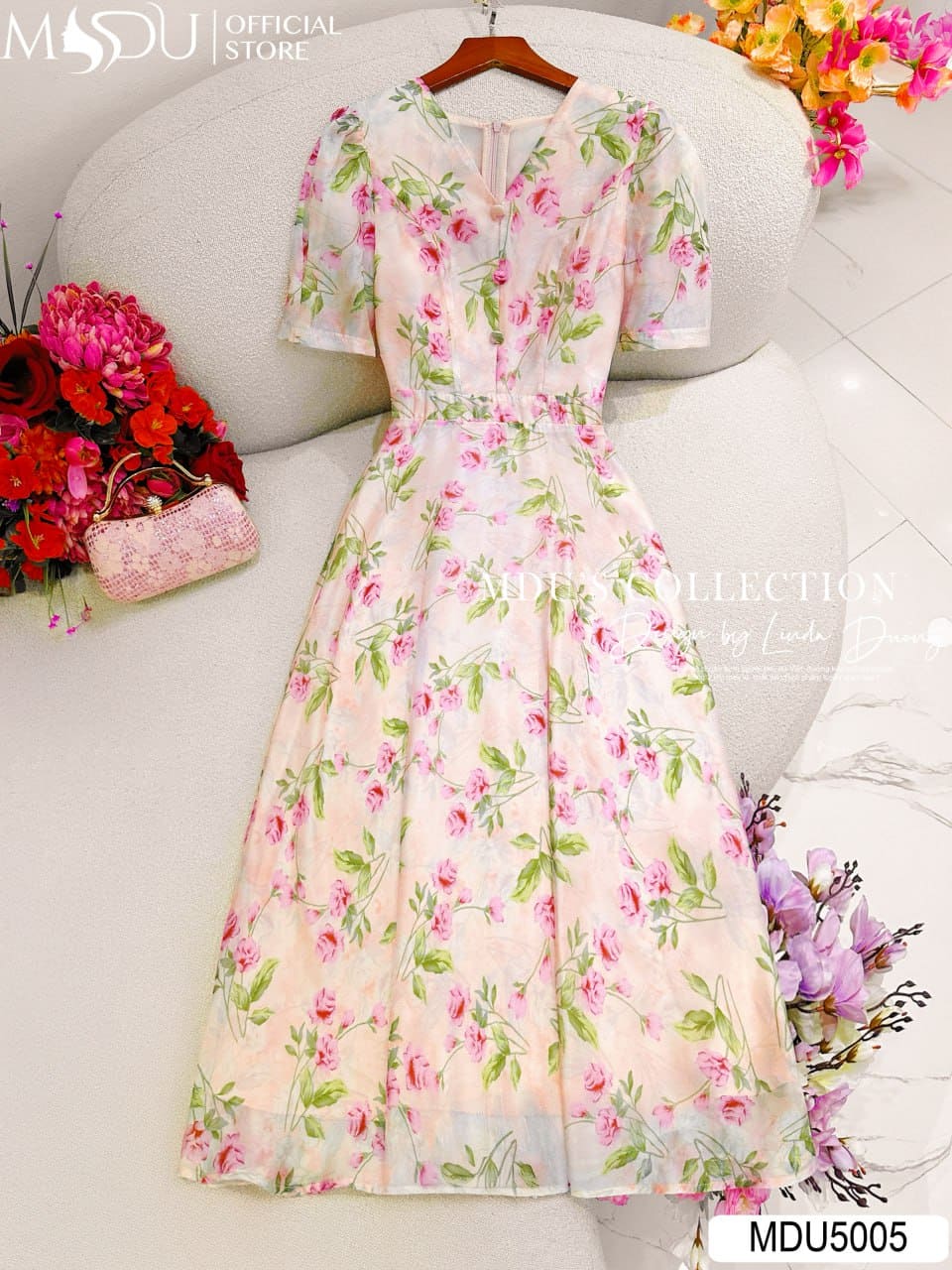 Váy Thiết Kế MDU5005 Tơ Óng Ngọc Trai In Hoa Hồng Cổ V Cúc Bọc Tay Bồng Dáng Dài Xòe Nhẹ
