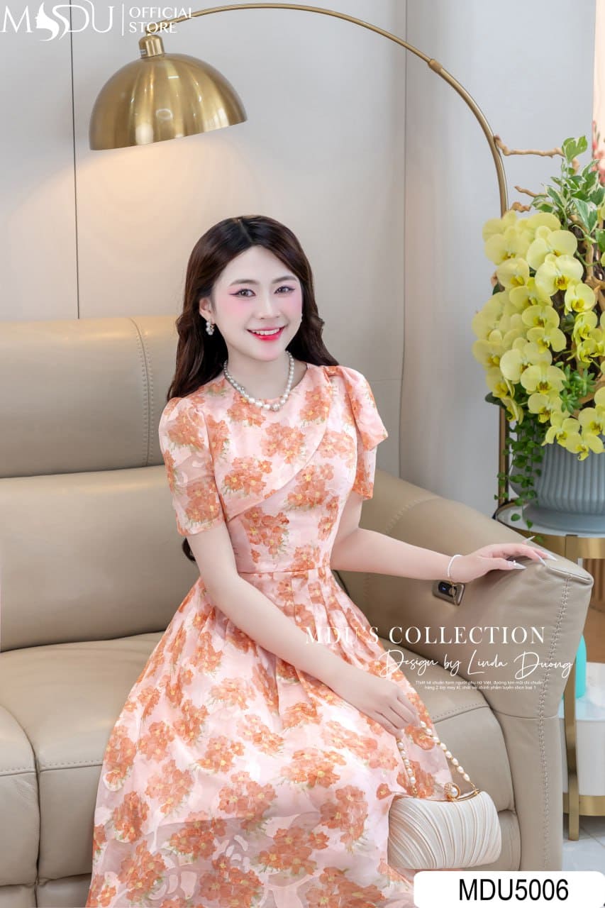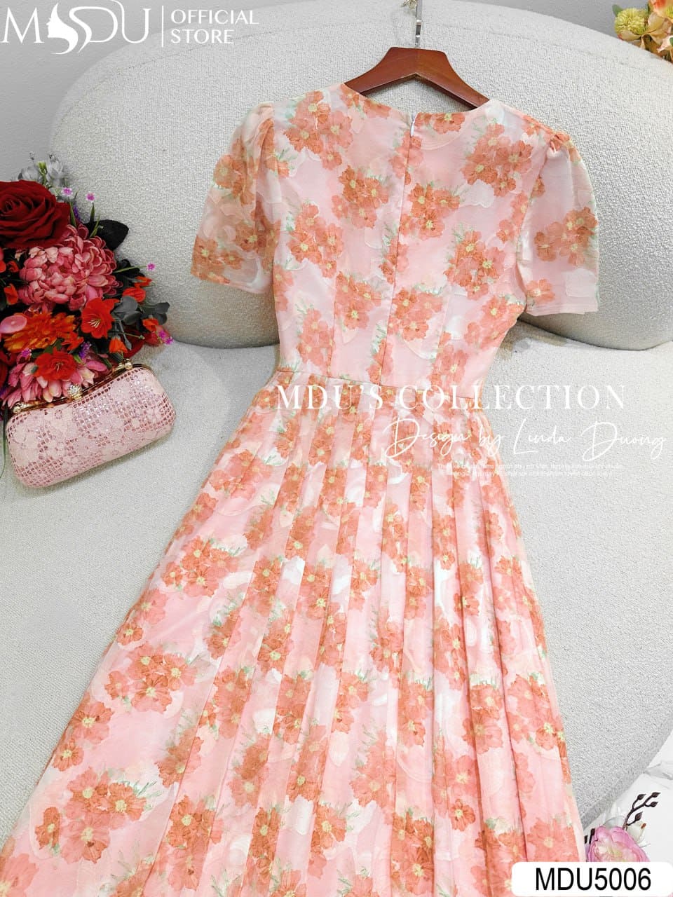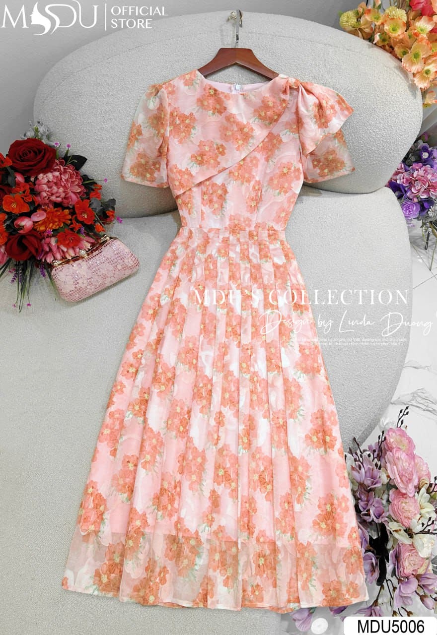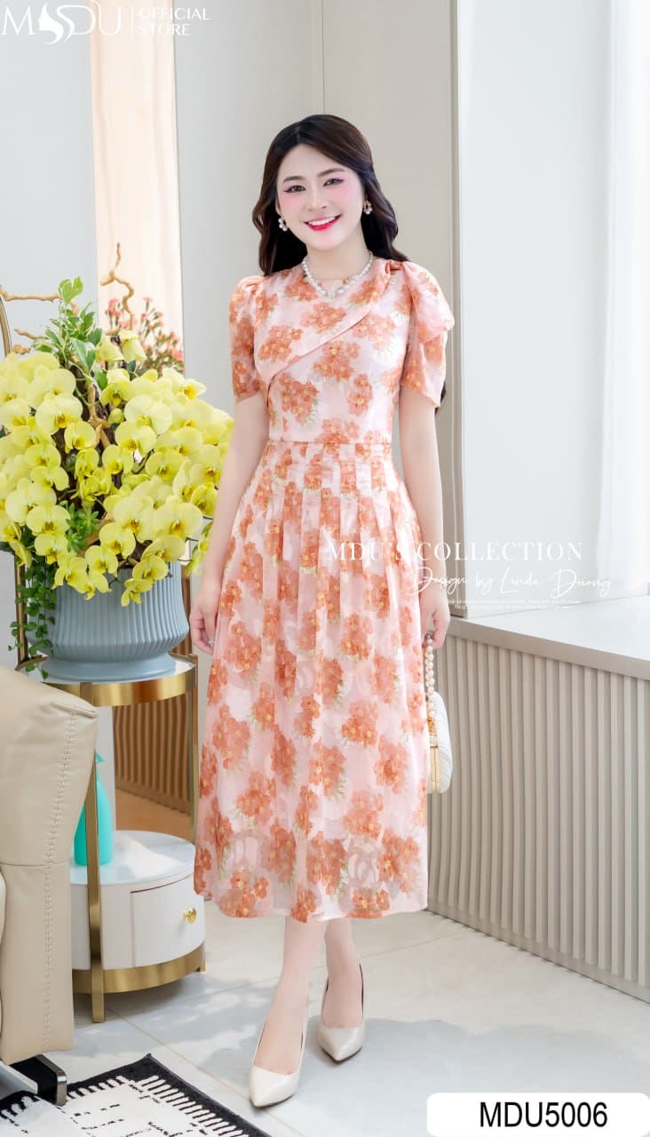 Váy Thiết Kế MDU5006 Tơ Ép Hoa Nổi Cam Đào Ngọt Ngào Vai Xếp Tầng Bất Đối Xứng Dáng Xòe Nhẹ