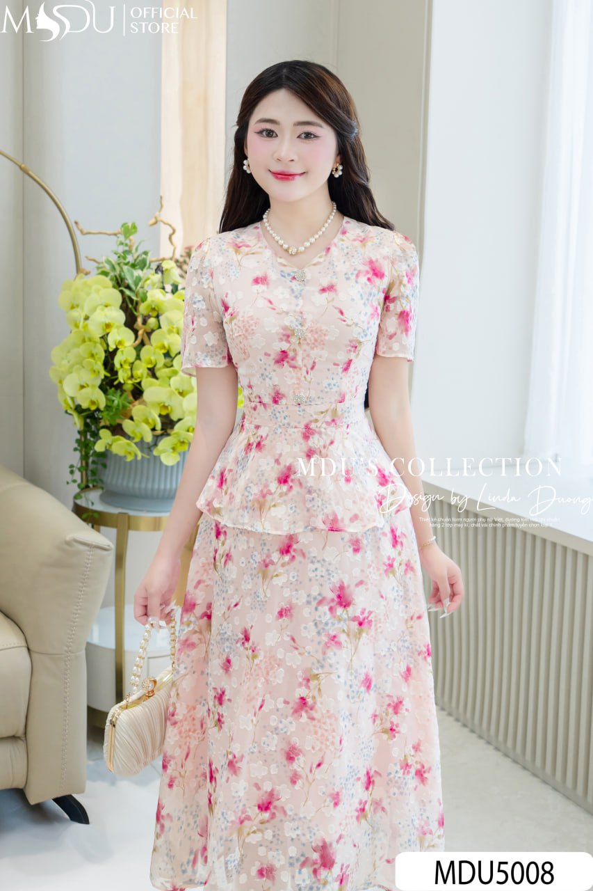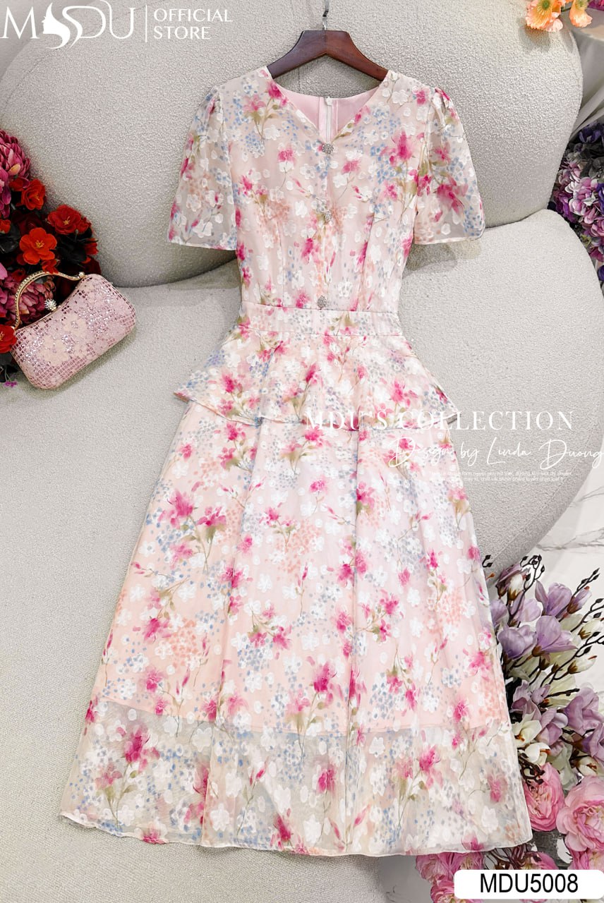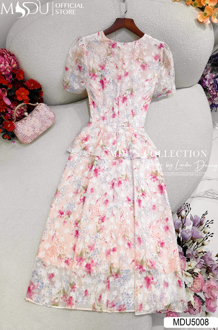 Váy Thiết Kế MDU5008 Tơ Ép Hoa Nhí Hồng Dáng Peplum Cổ V Chiết Eo Tôn Dáng