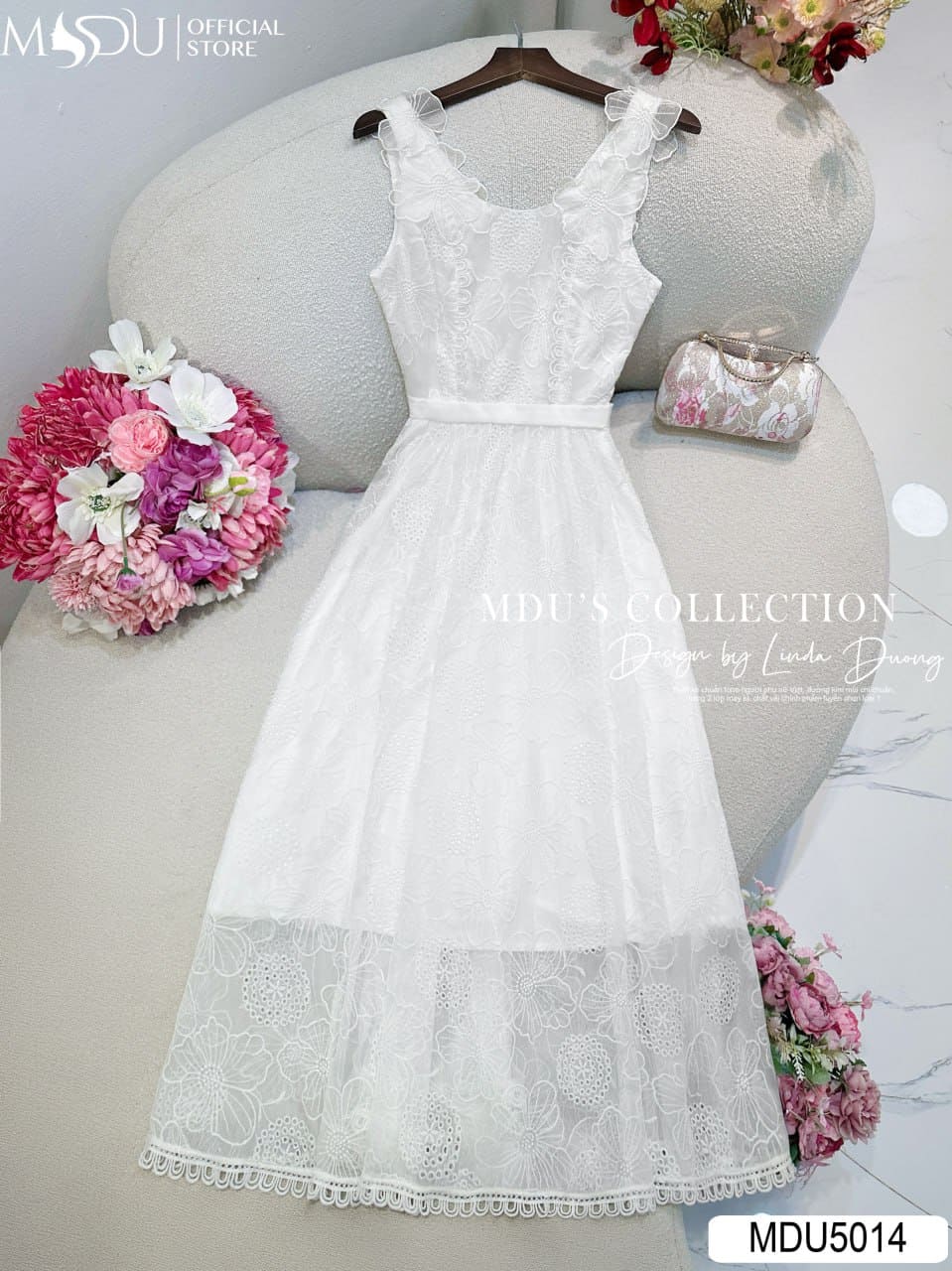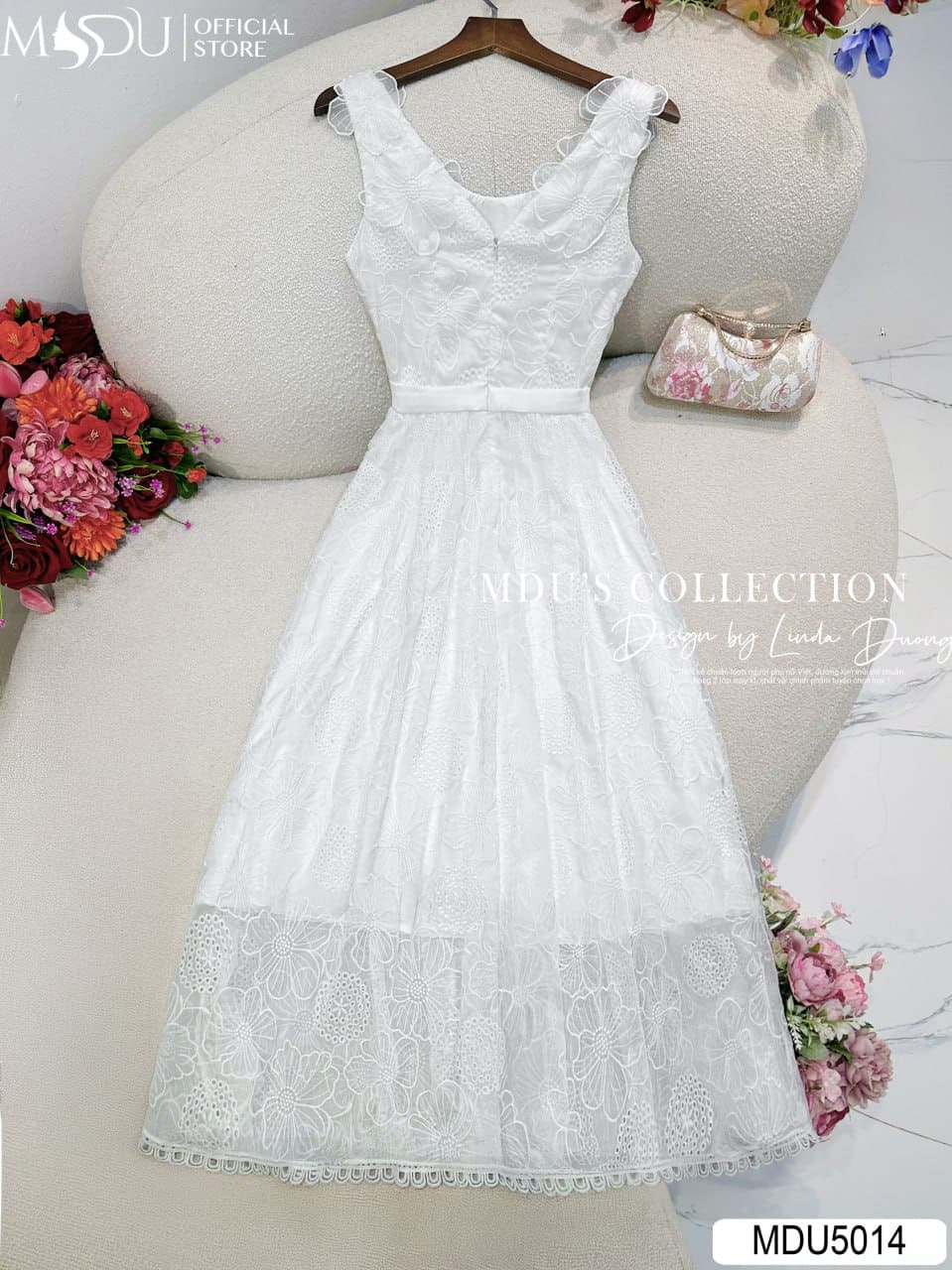 Váy Thiết Kế MDU5014 Ren Hoa Nổi Trắng Tinh Khôi Dáng Xòe Dây Hoa Vai – Nữ Tính & Thanh Lịch