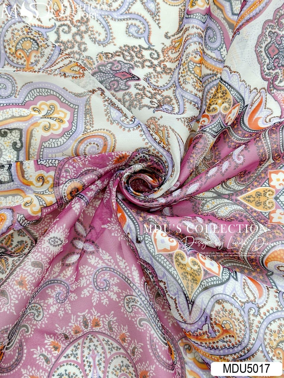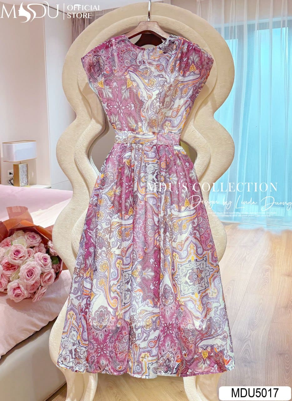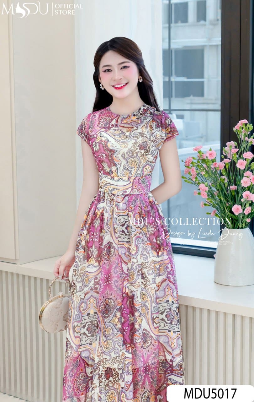 Váy Thiết Kế MDU5017 Tơ Xước Paisley Hồng Tím Kem Dáng Dài Xòe Nhẹ – Bay Bổng & Duyên Dáng