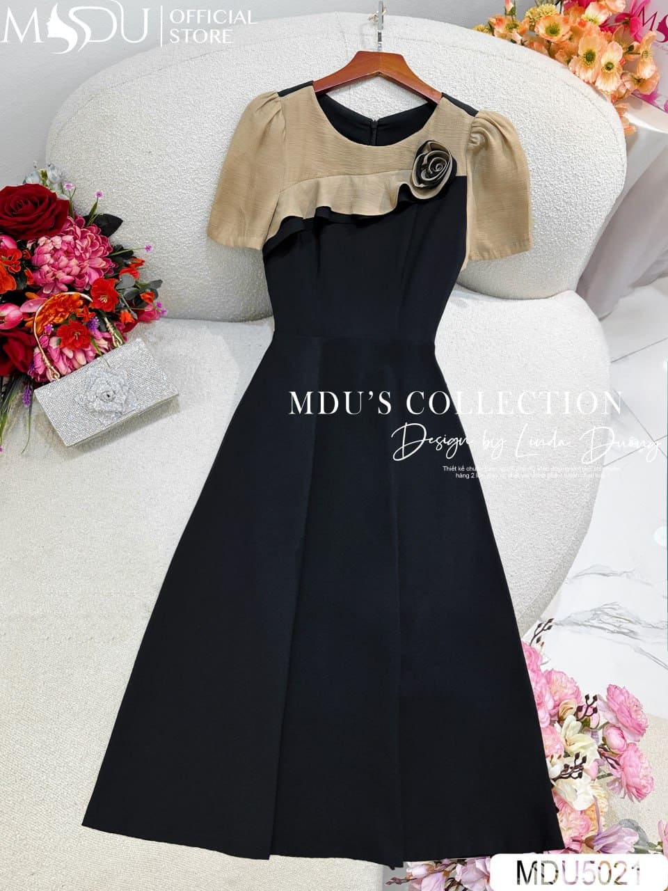 Váy Thiết Kế MDU5021 Chéo Hàn Phối Tơ Nhăn Dáng Xòe Dài Cổ Bèo Đính Hoa Thanh Lịch