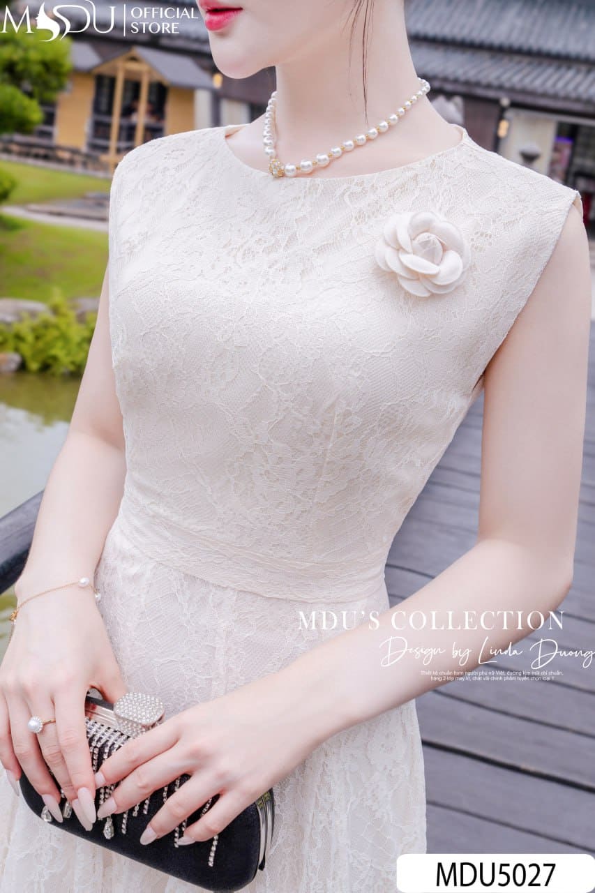 Váy Thiết Kế MDU5027 Ren Cao Cấp Dáng Xòe Dài Cổ Tròn Hoa Trang Trí Ngực Màu Kem Thanh Lịch