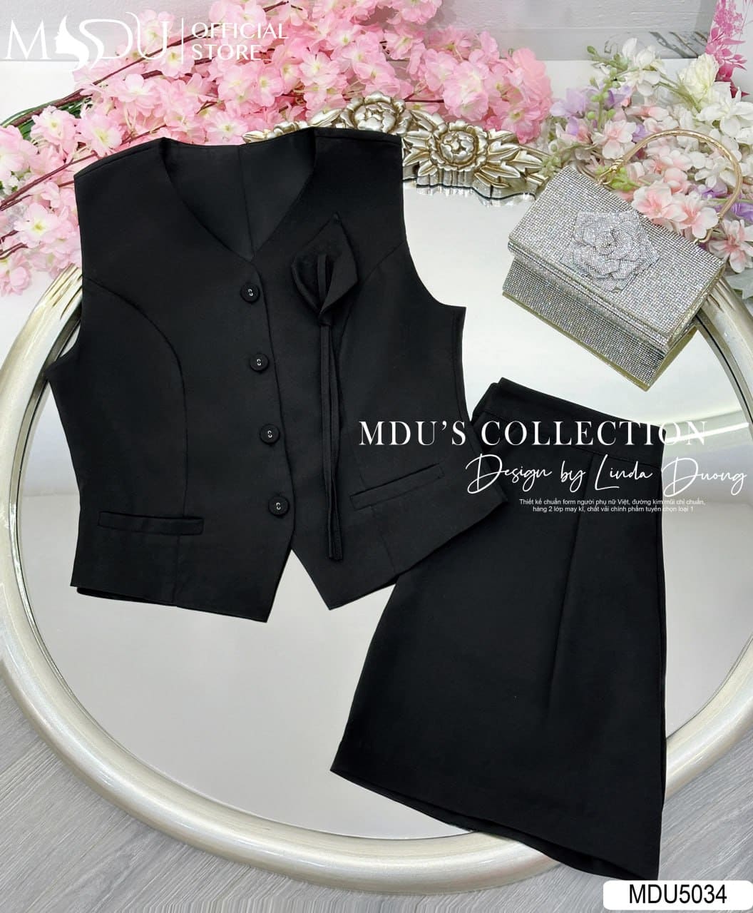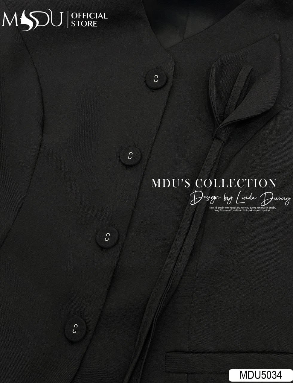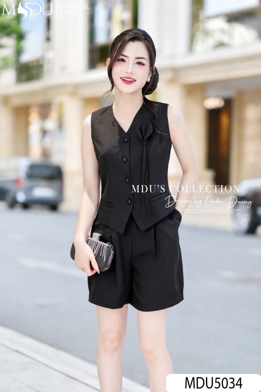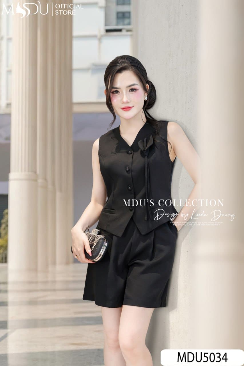 Váy Thiết Kế MDU5034 – Set Vest Đen Không Tay & Quần Short Xước Thái Trẻ Trung, Cá Tính Mà Vẫn Thanh Lịch