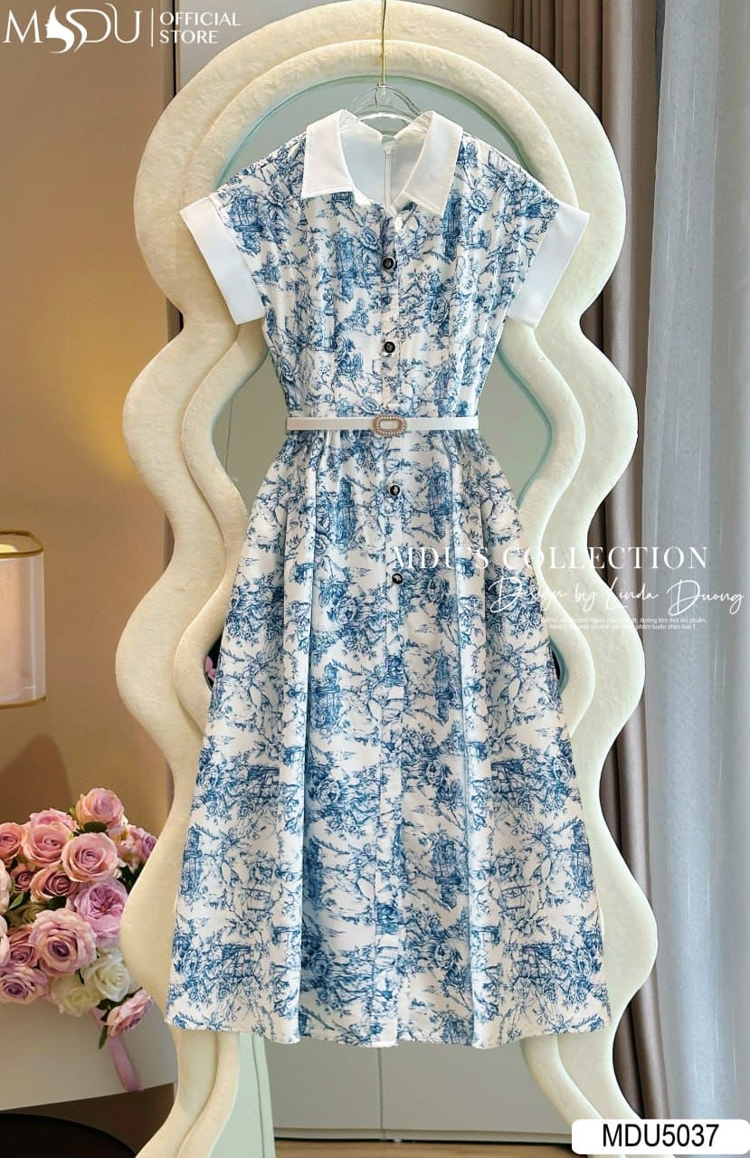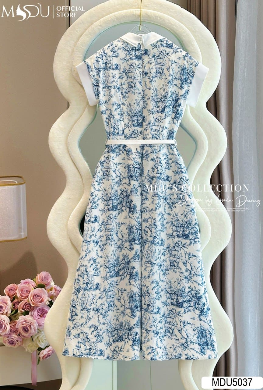 Váy Thiết Kế MDU5037 Lụa Mango Dáng Xòe Cổ Sơ Mi Tay Lật Lai Đai Eo Họa Tiết Xanh Trắng Thanh Lịch