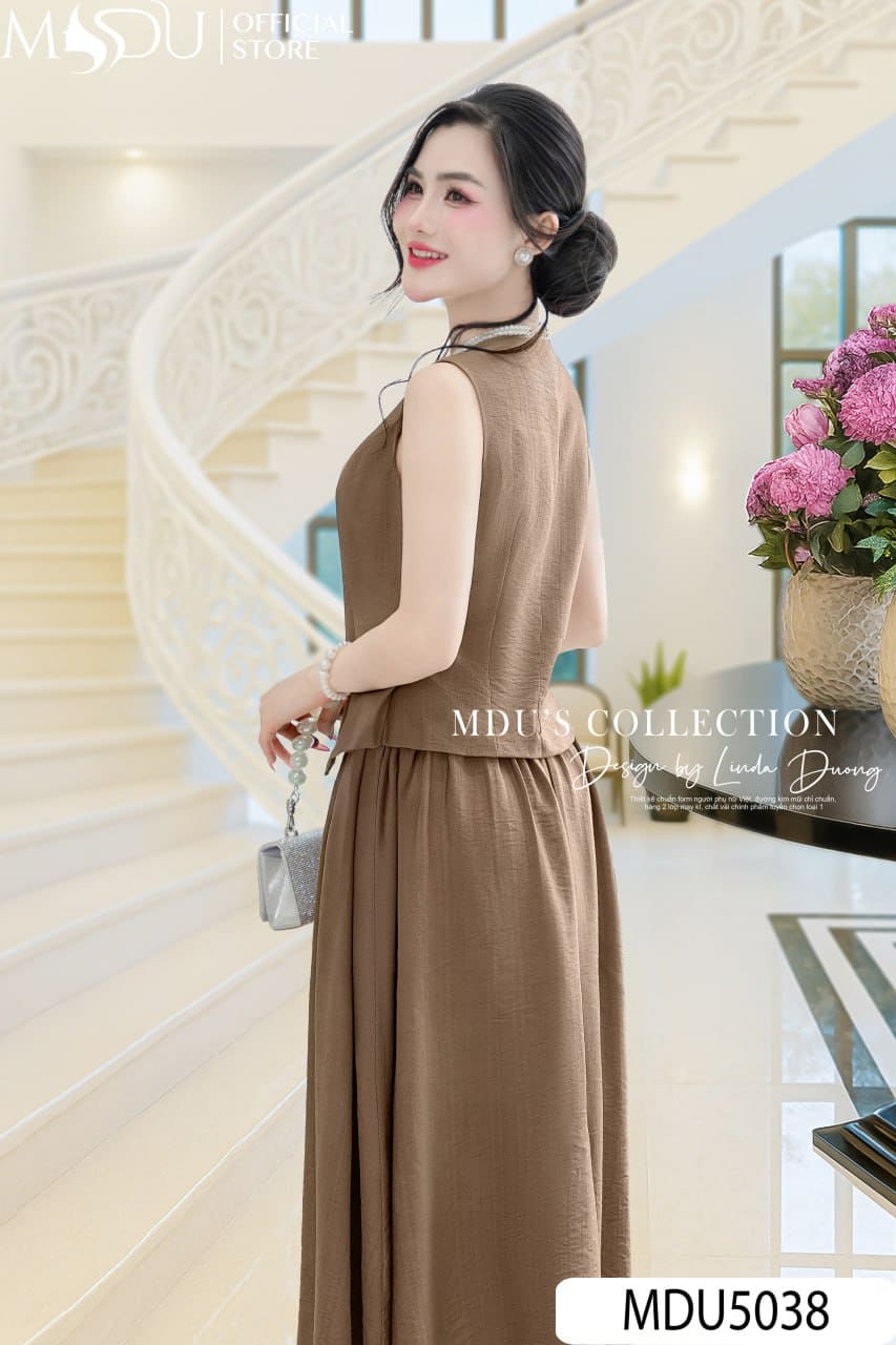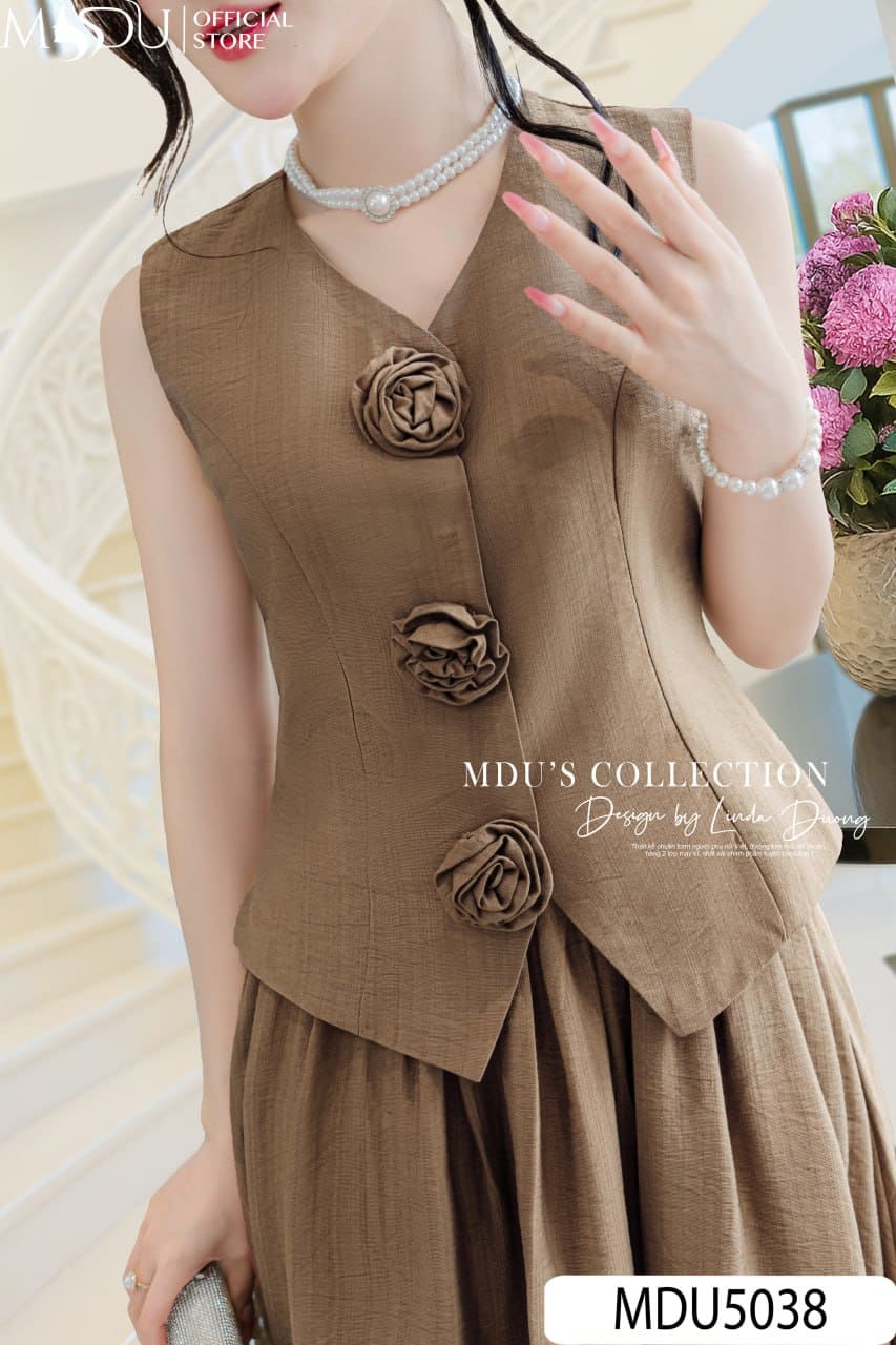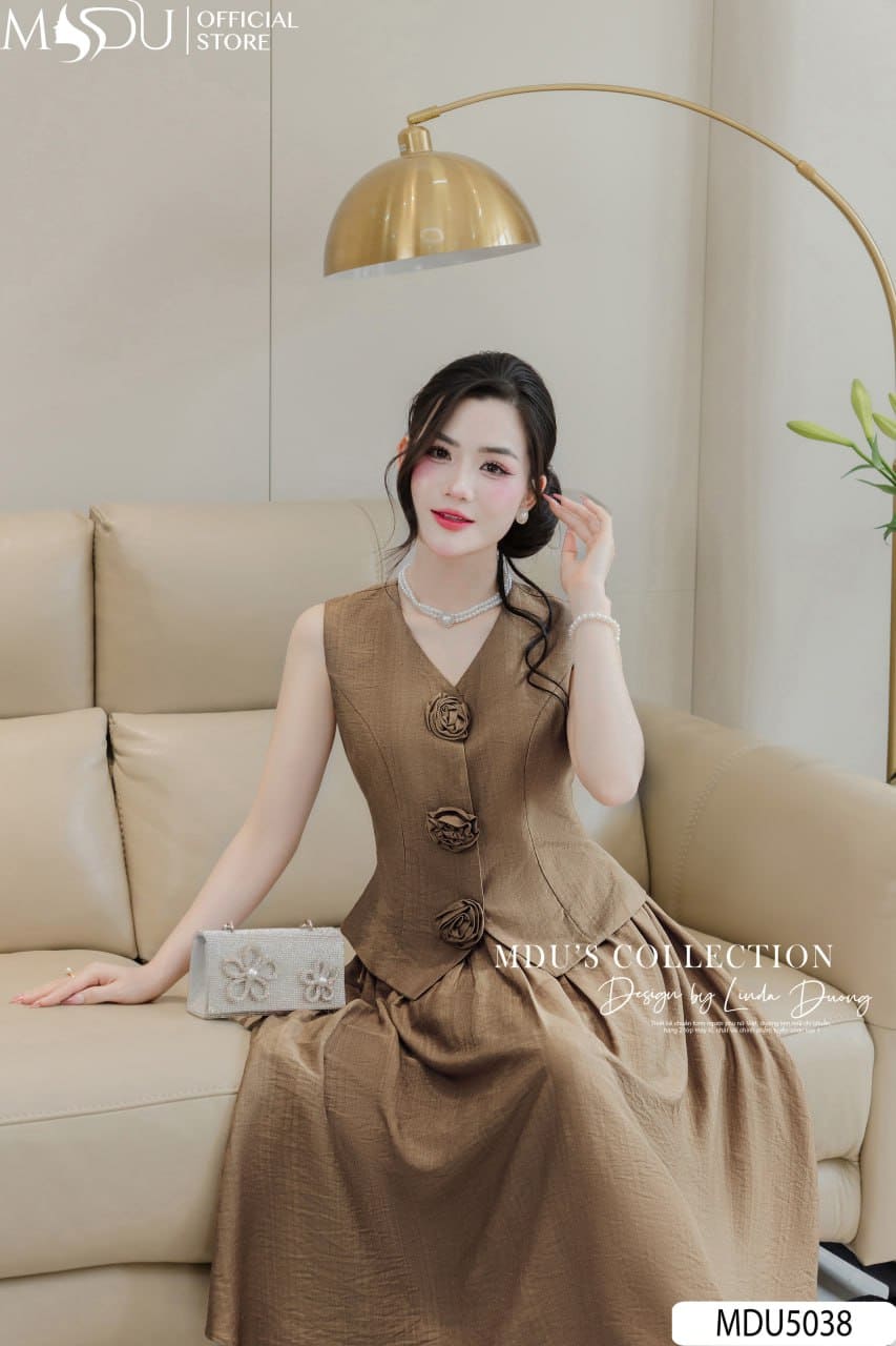 Set Thiết Kế MDU5038 Đũi Nhăn Cao Cấp Áo Cổ V Hoa Thủ Công Chân Váy Dài Xòe Nâu Đất Thanh Lịch