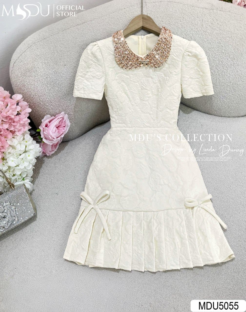 Váy Thiết Kế MDU5055 Gấm Xốp Hoa Nổi Dáng Xòe Ngắn Cổ Tròn Đính Đá Nơ Chân Váy Thanh Lịch