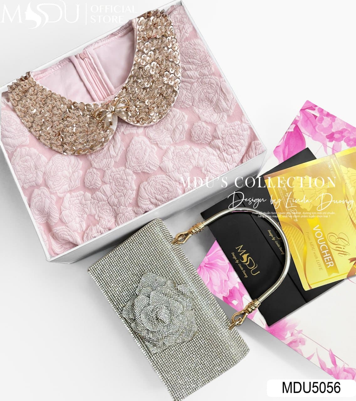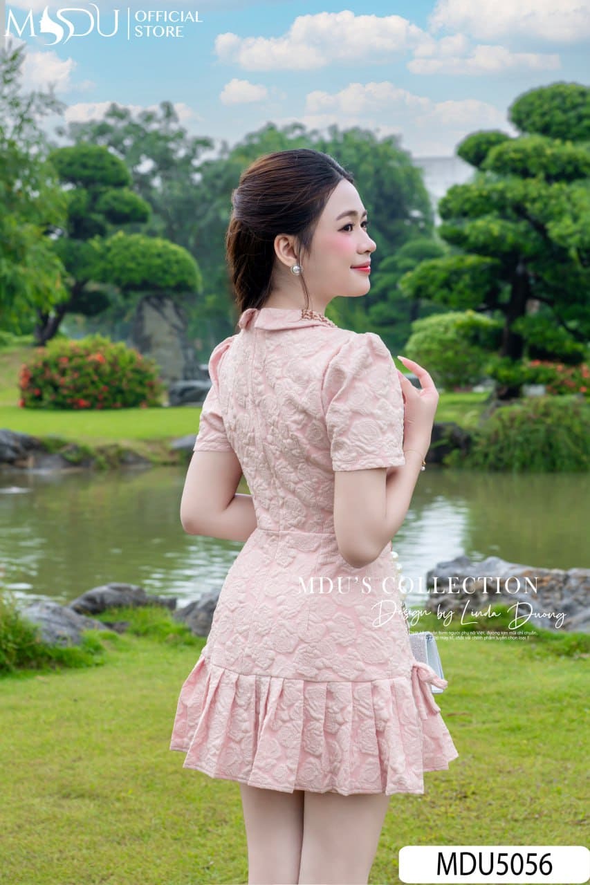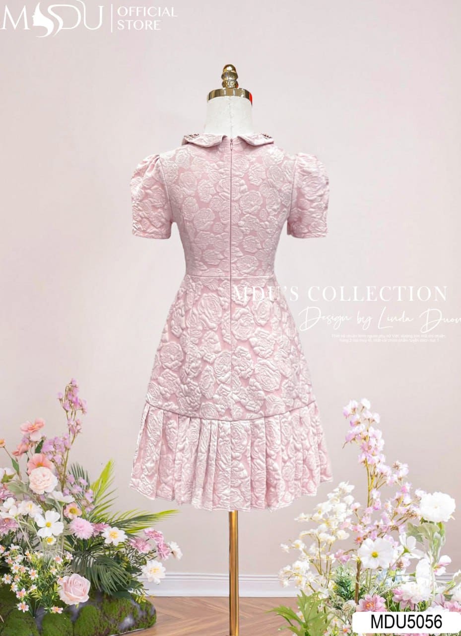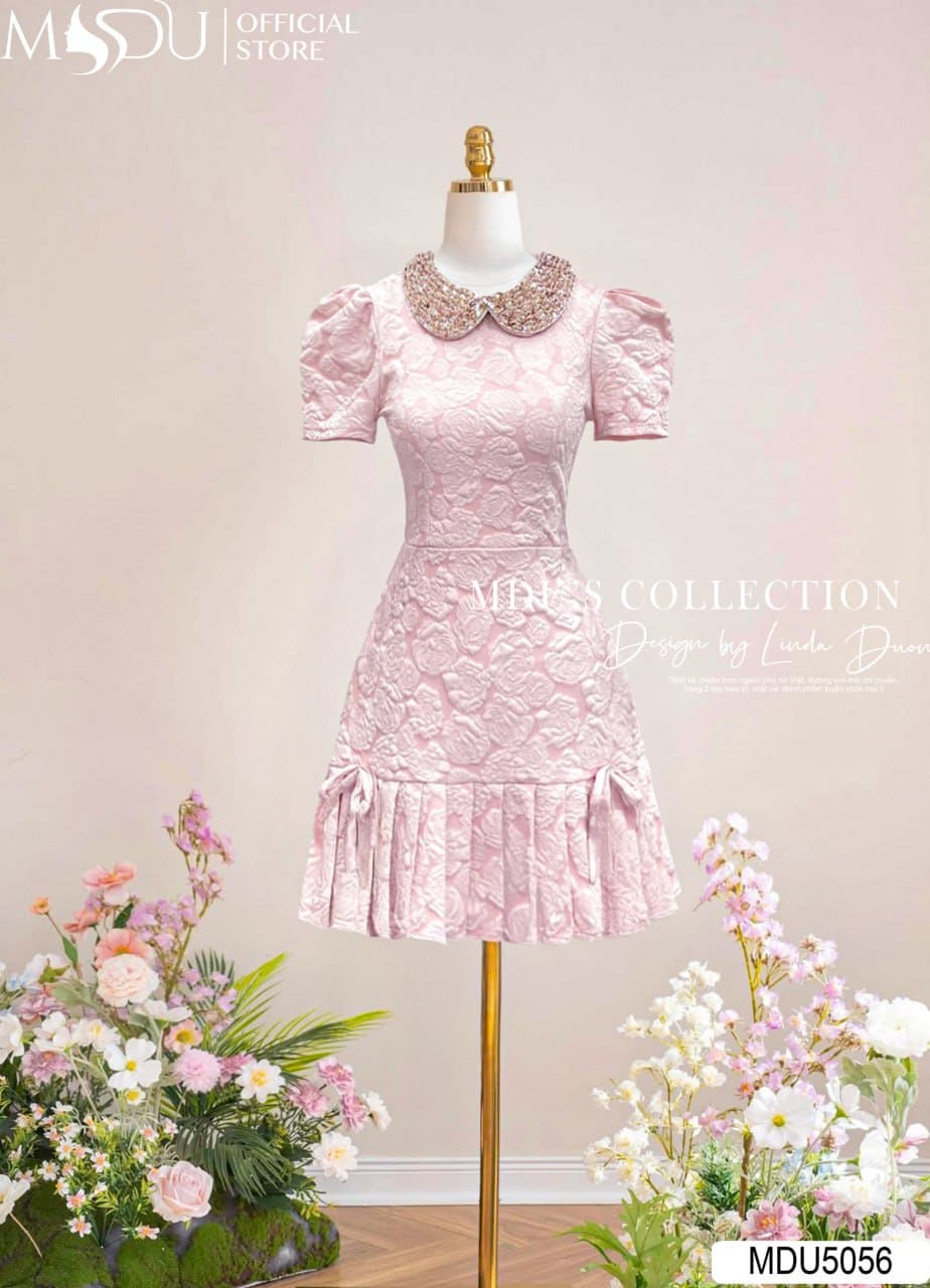 Váy Thiết Kế MDU5056 Gấm Xốp Hoa Nổi Dáng Ngắn Cổ Tròn Đính Đá Nơ Chân Váy Hồng Nhạt Duyên Dáng