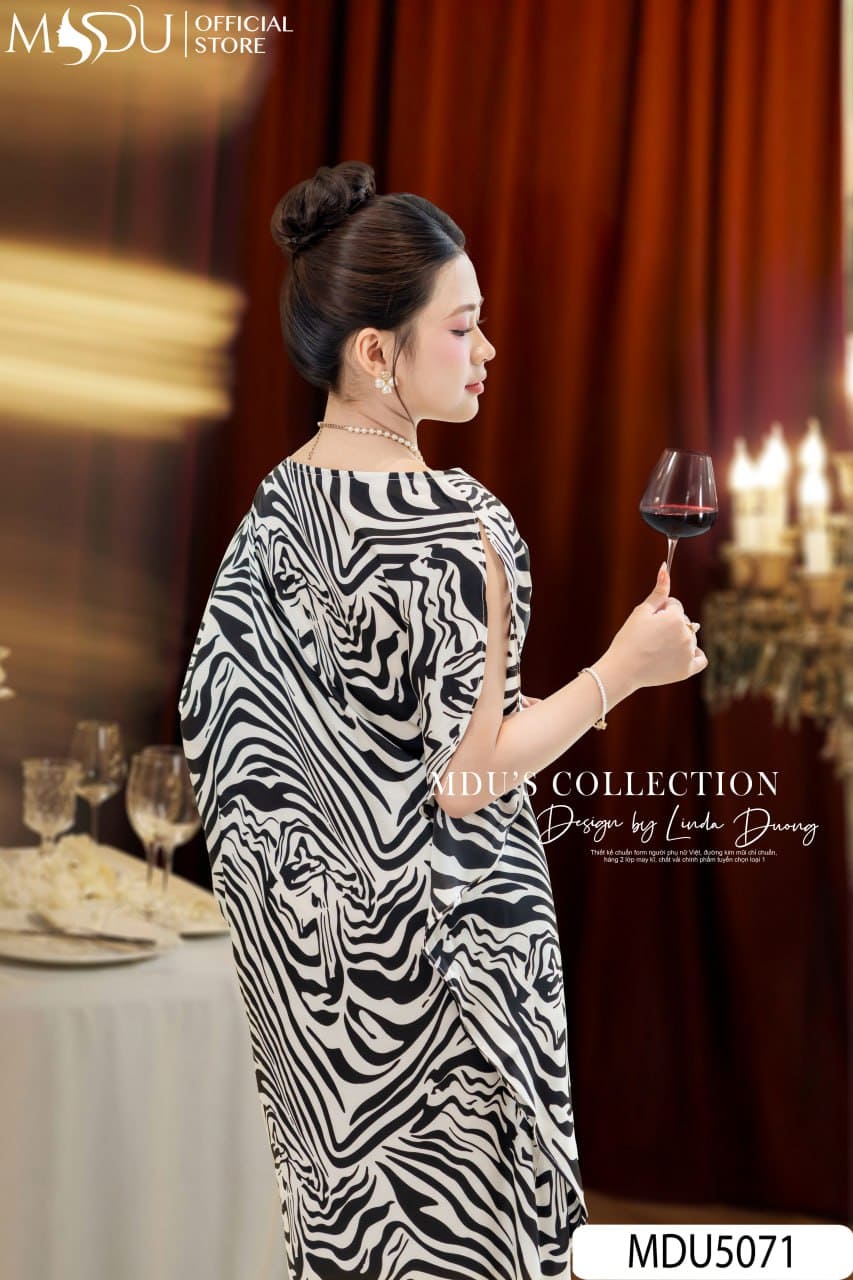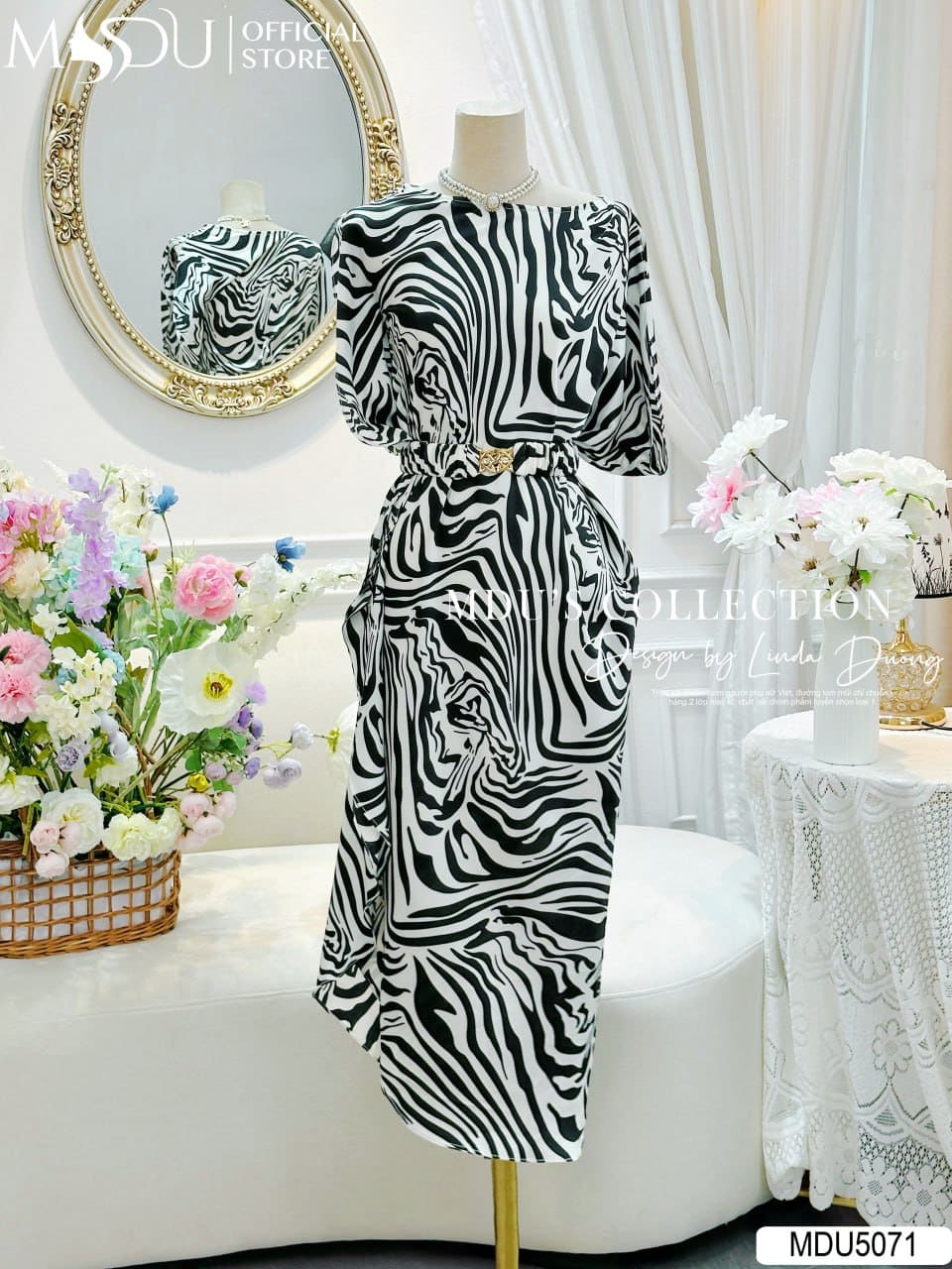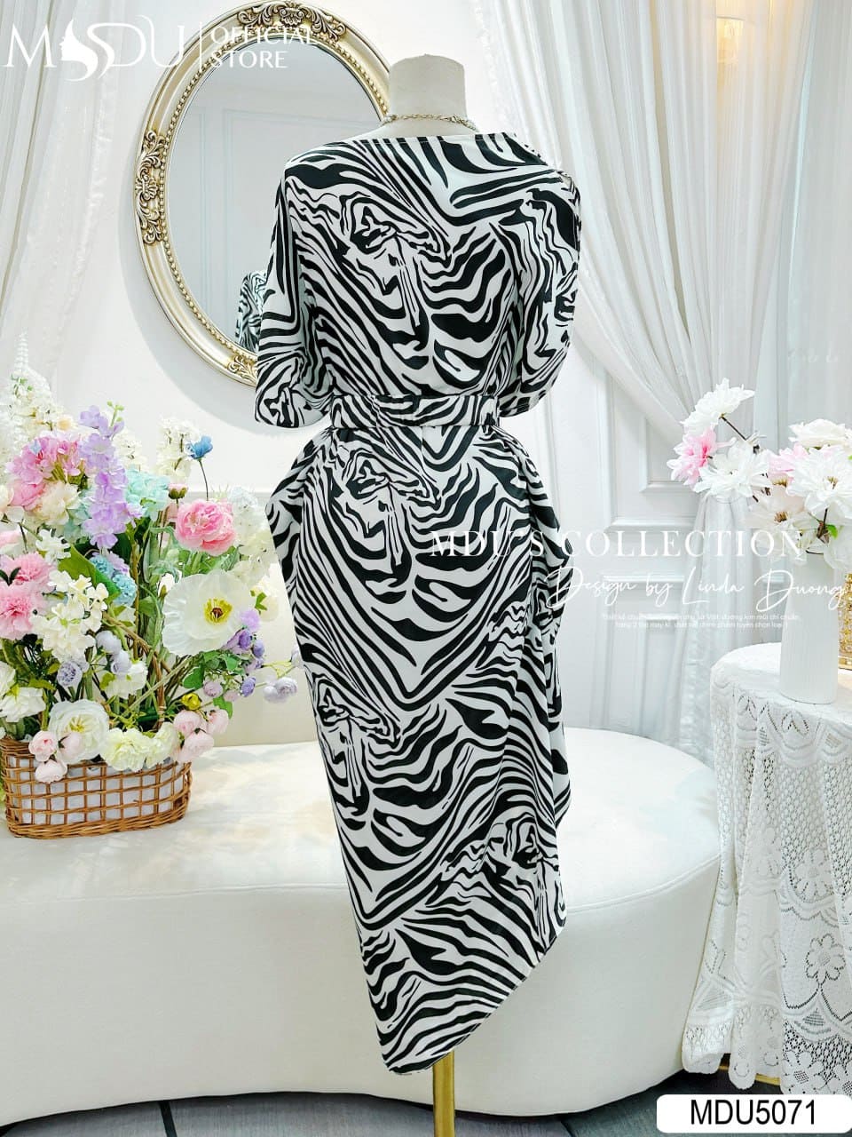 Váy Thiết Kế MDU5071 Lụa Latin Cao Cấp Họa Tiết Ngựa Vằn Dáng Suông Lệch Xếp Nhún Sang Trọng
