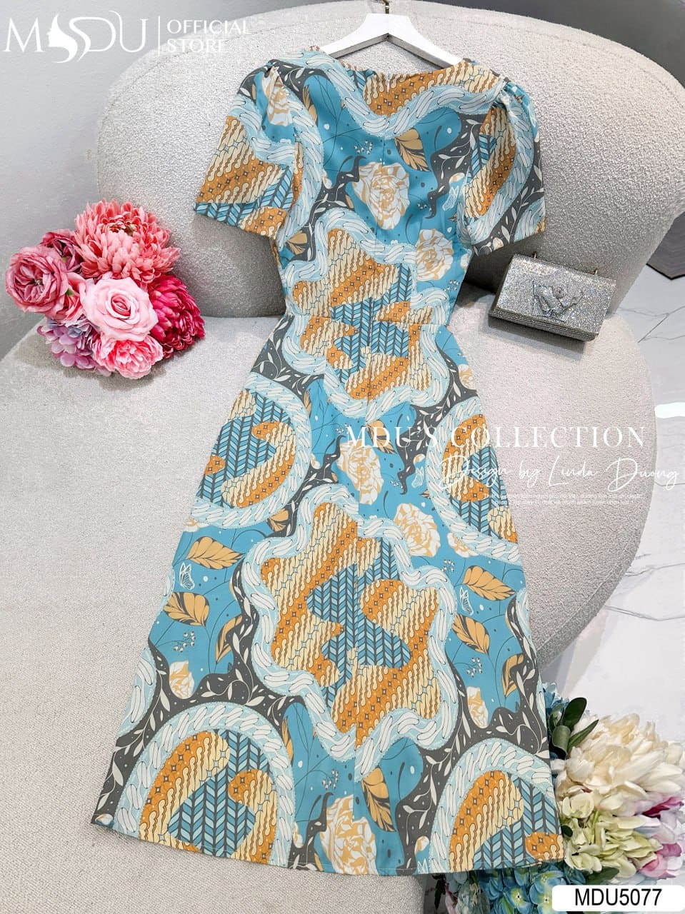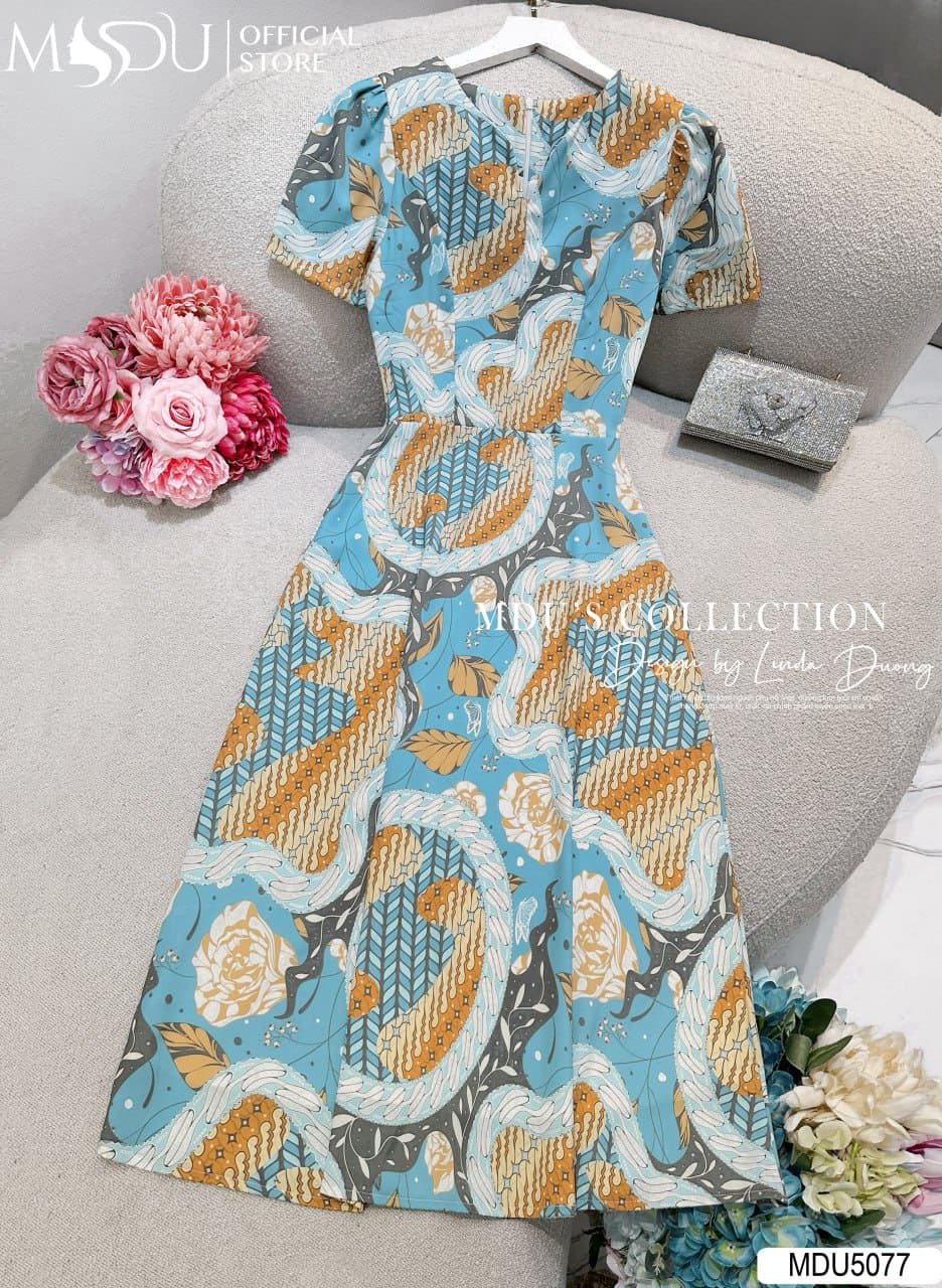 Váy Thiết Kế MDU5077 Lụa Mango Cao Cấp Dáng Xòe Nhẹ Họa Tiết Hoa Xanh Chiết Eo Thanh Thoát