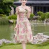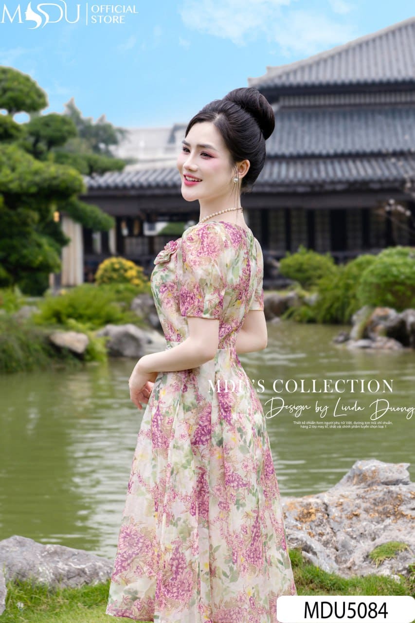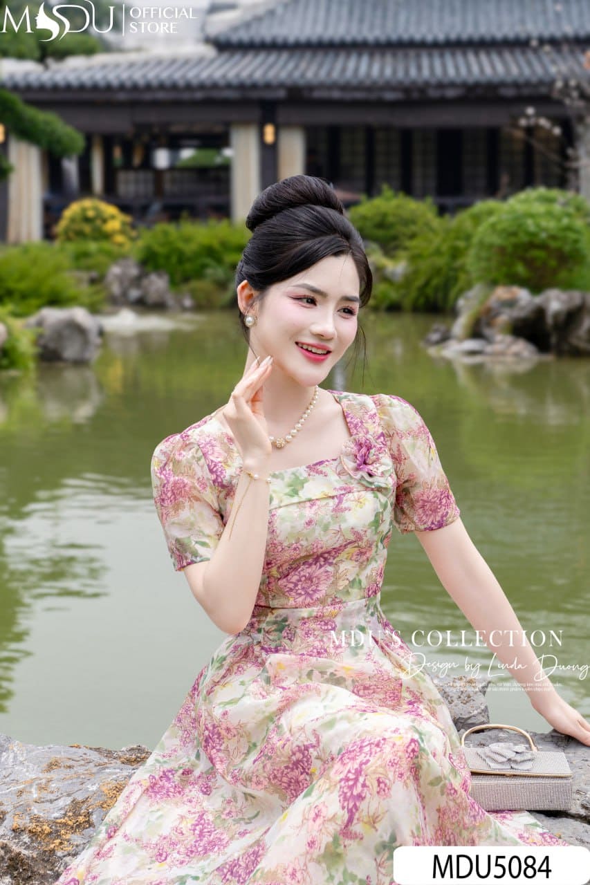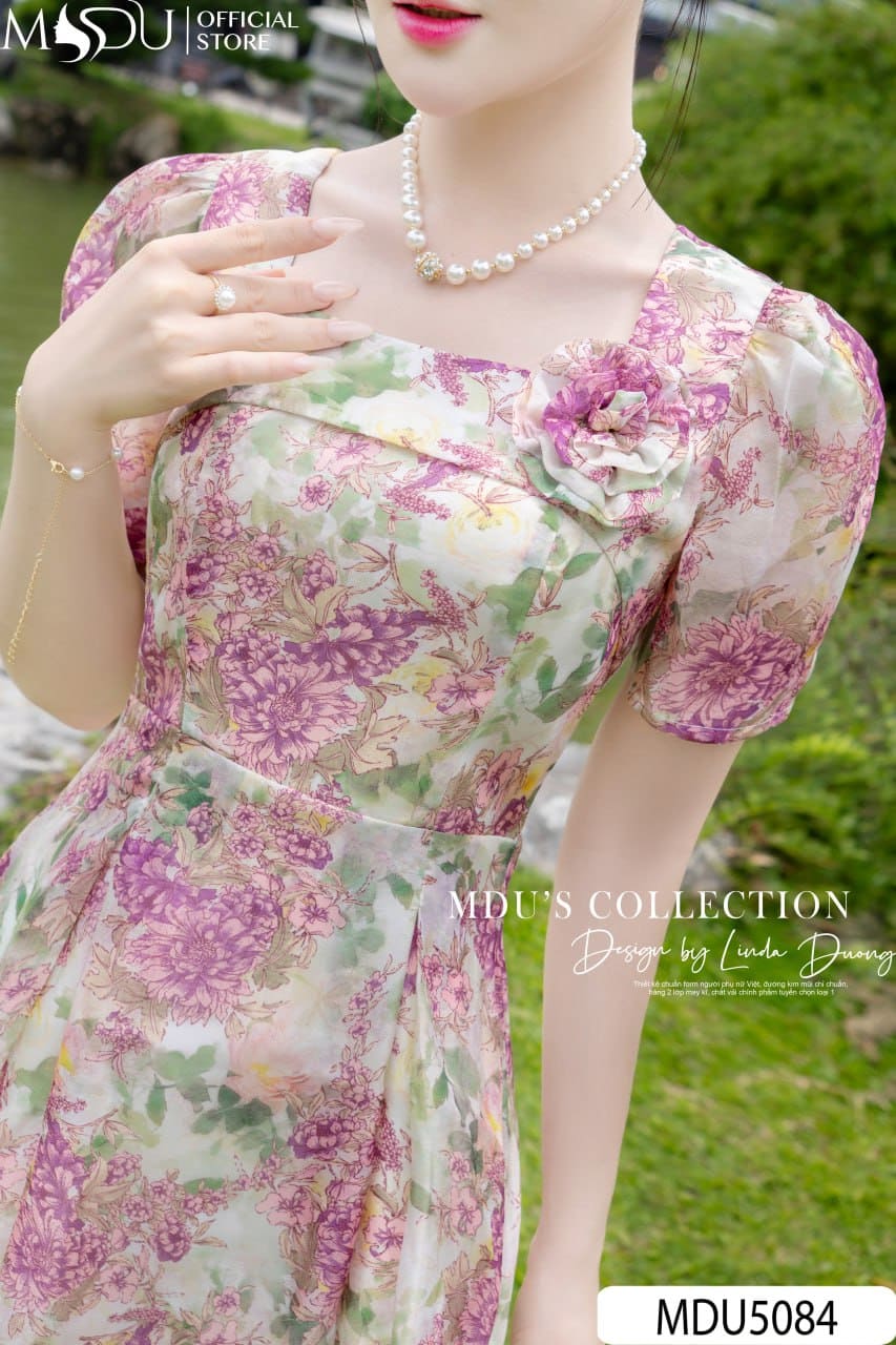 Váy Thiết Kế MDU5084 Tơ Óng Ngọc Trai Dáng Xòe Cổ Vuông Hoa Nổi Ngực Họa Tiết Cẩm Tú Cầu Pastel