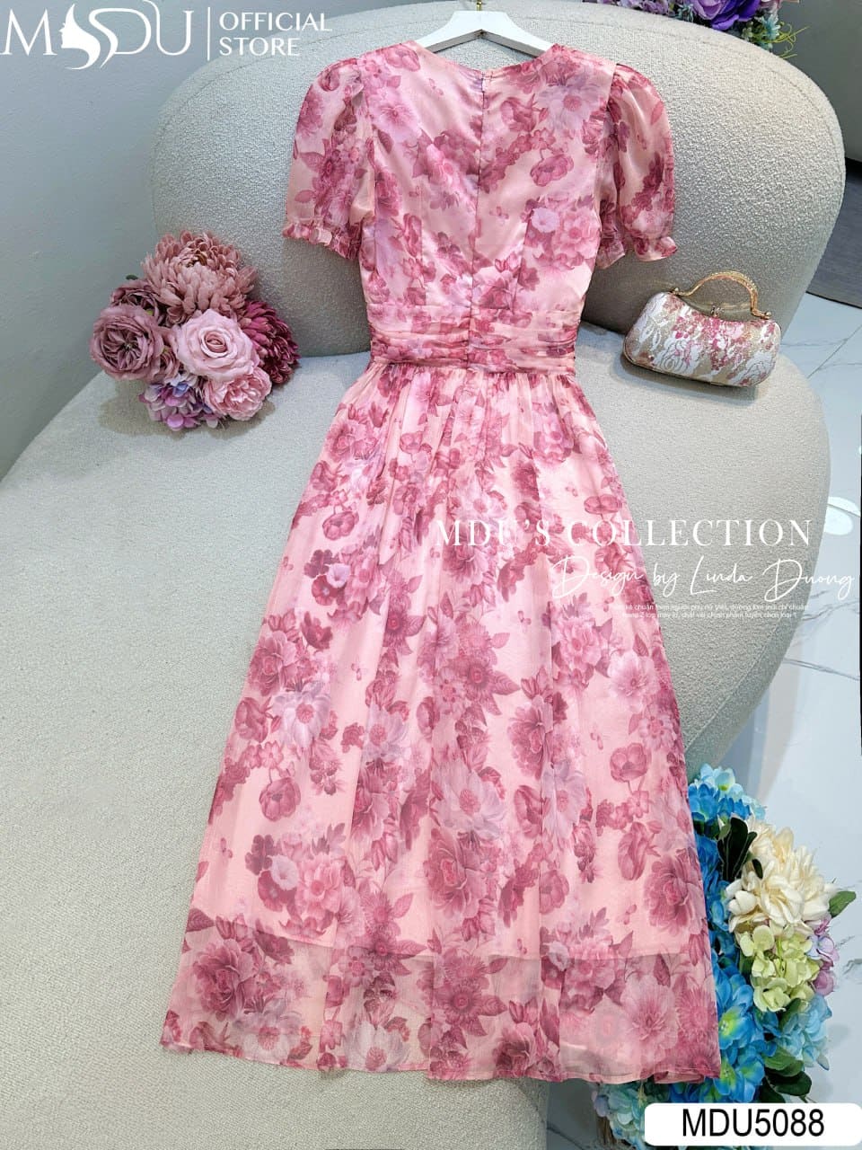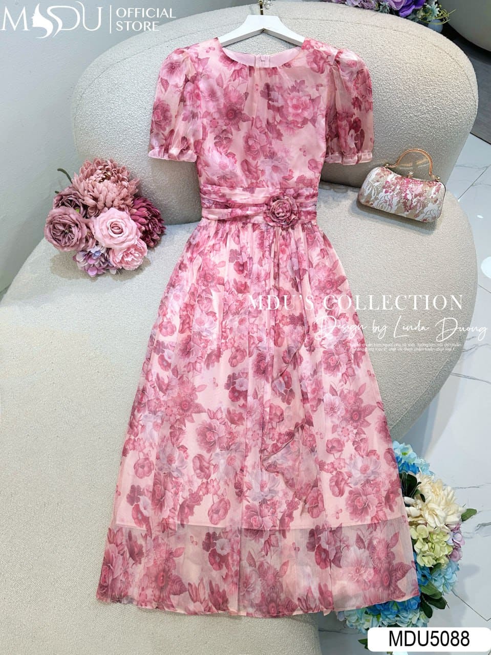 Váy Thiết Kế MDU5088 Tơ Xước Hồng Pastel Dáng Xòe Nhẹ Hoa Đính Eo Thanh Lịch