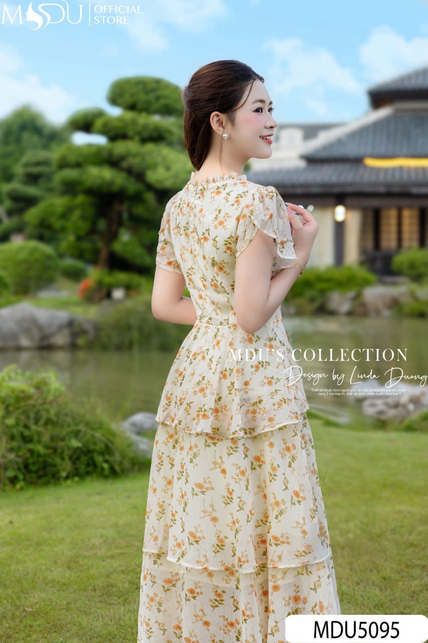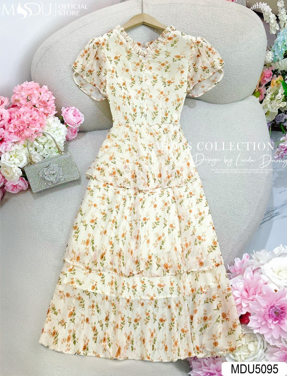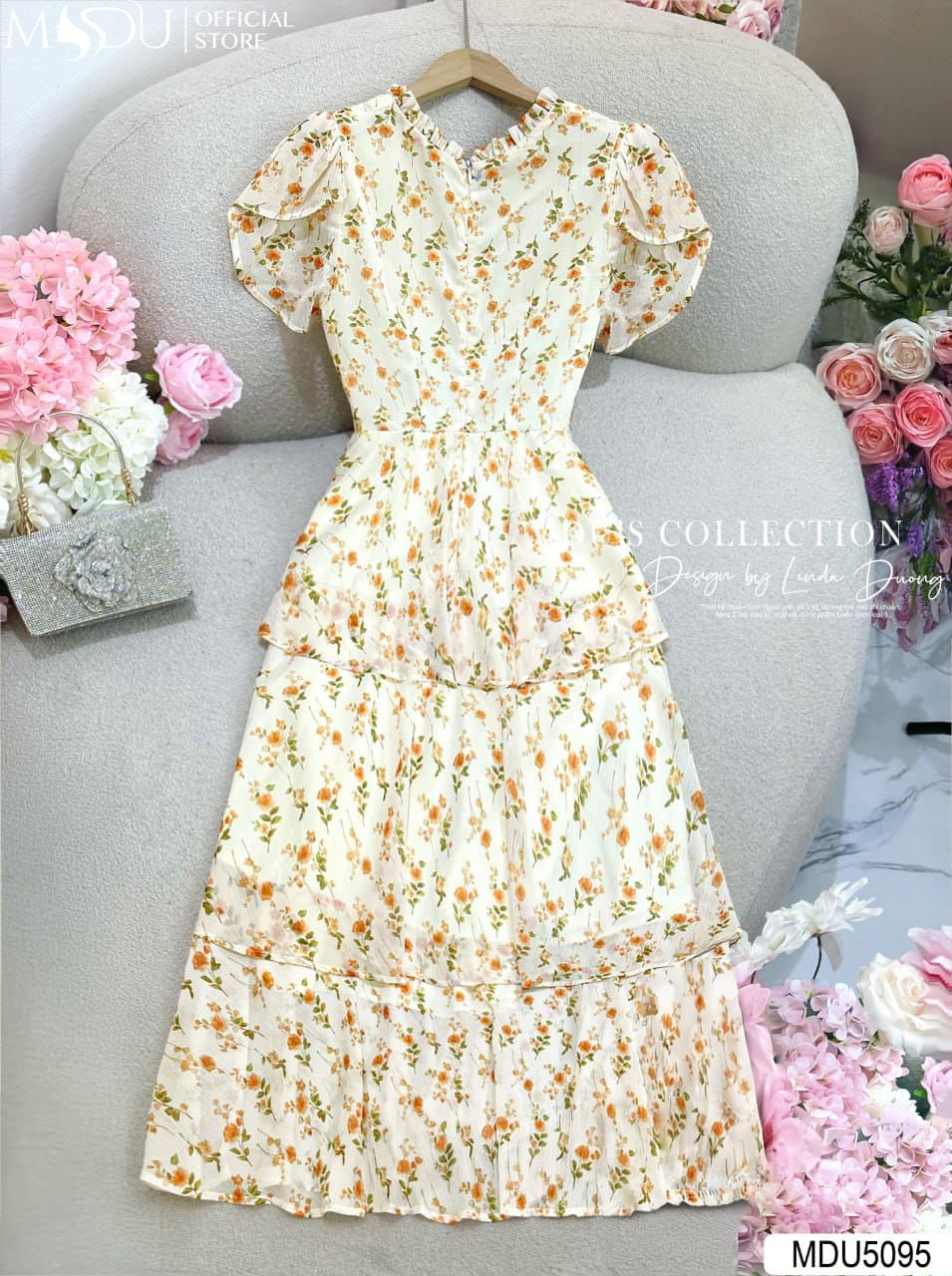 Váy Thiết Kế MDU5095 Tơ Xước Hoa Nhí Dáng Xòe Tầng Cổ V Voan Nhún Màu Kem Nữ Tính