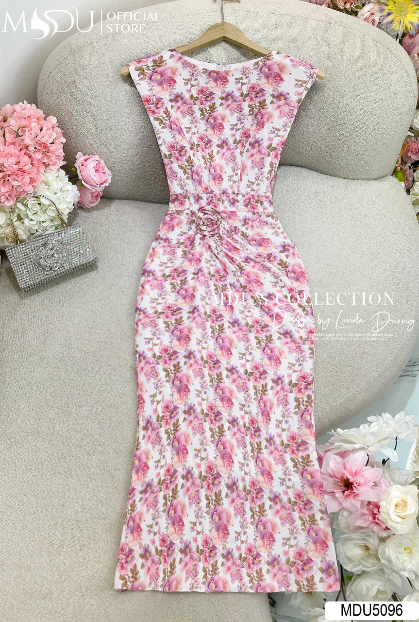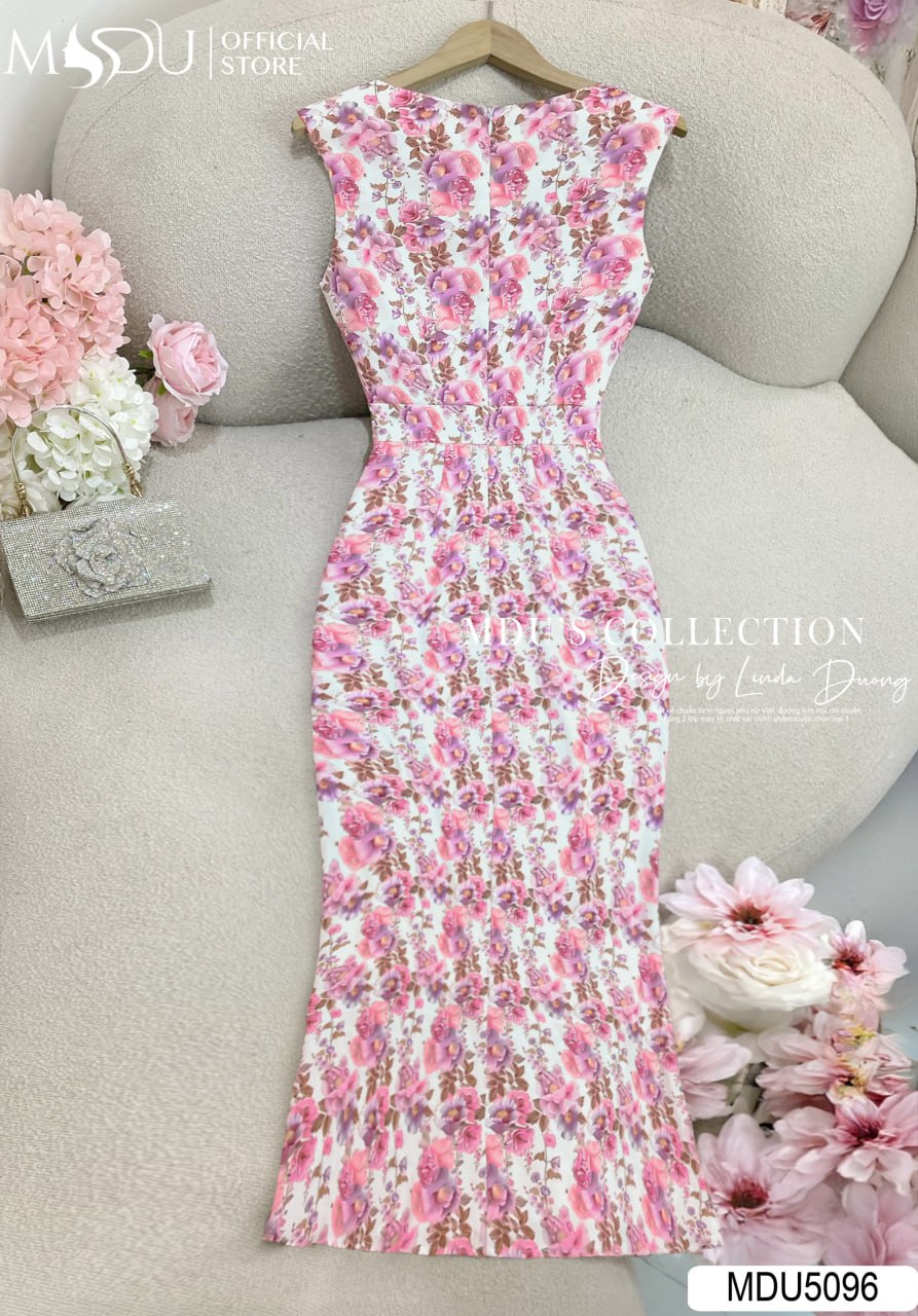 Váy Thiết Kế MDU5096 Lụa Mango Đuôi Cá Cổ Thuyền Hoa Nhí Hồng Trắng Ngà Nhún Eo Lệch Tôn Dáng