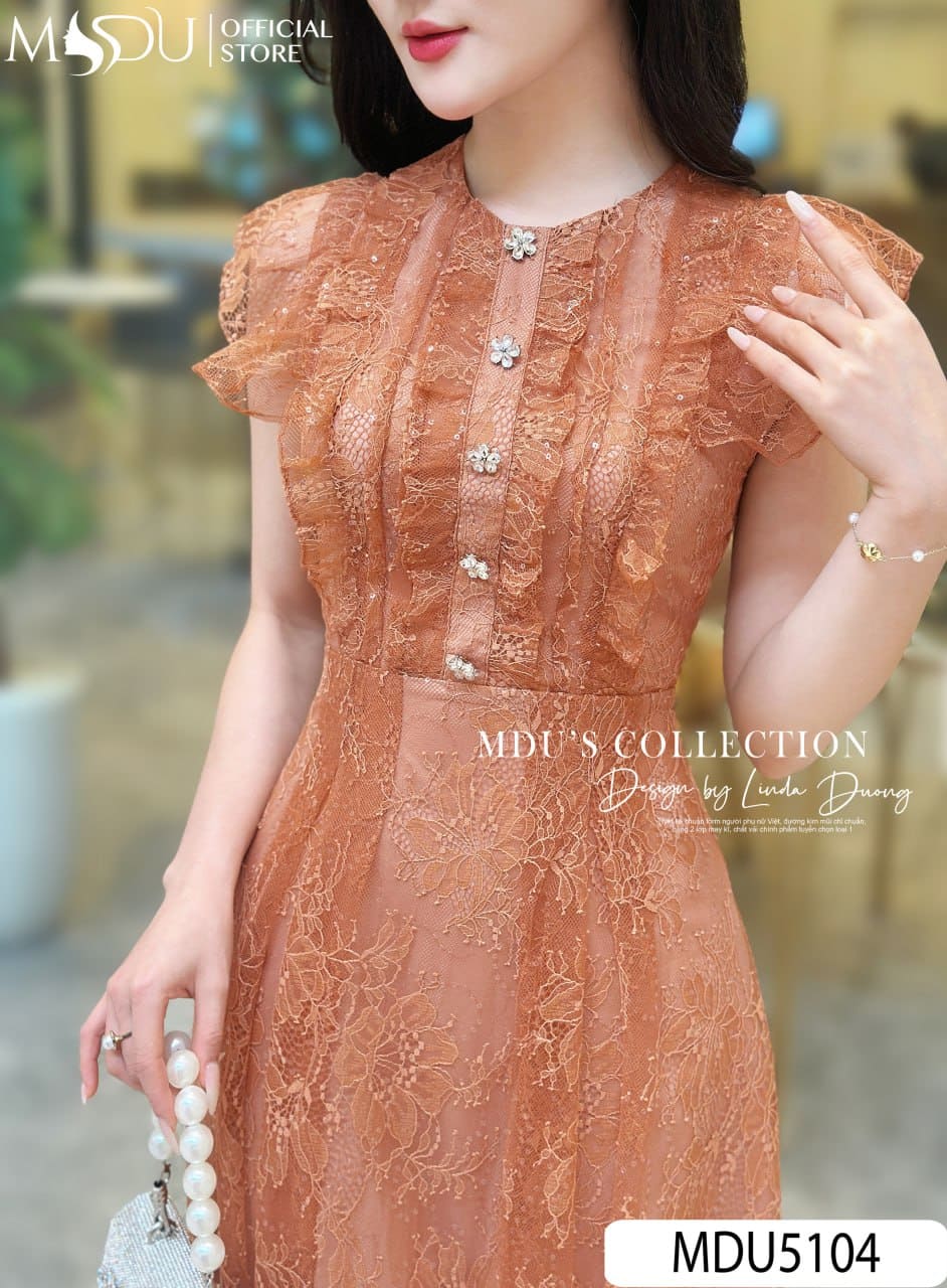 MDU Fashion trân trọng ra mắt thiết kế MDU5104 – một tuyệt tác dành cho những quý cô yêu thích sự nền nã, nhẹ nhàng mà vẫn nổi bật theo cách rất riêng. Thiết kế sử dụng chất liệu ren hoa cao cấp, bề mặt được nhấn nhá bằng ren hạt nổi đính kim sa lấp lánh, tạo nên hiệu ứng bắt sáng tinh tế mỗi khi chuyển động. Tông màu nâu cam đất trầm ấm vừa mang nét hiện đại, vừa gợi cảm giác cổ điển quyến rũ, phù hợp với nhiều tông da và khung cảnh trang trọng.