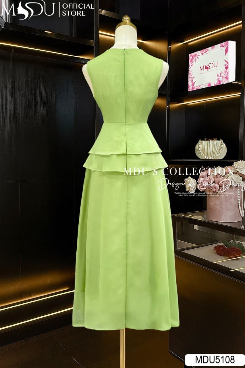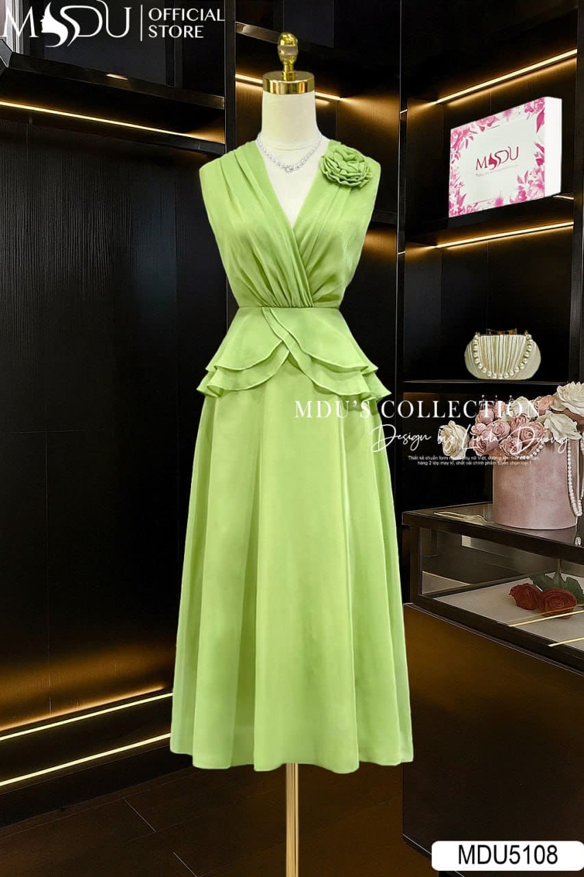 Váy Thiết Kế MDU5108 Tơ Nhũ Ánh Nhẹ Cổ V Đắp Chéo Eo Peplum Đính Hoa Vai – Thanh Lịch Và Dịu Dàng Mọi Góc Nhìn