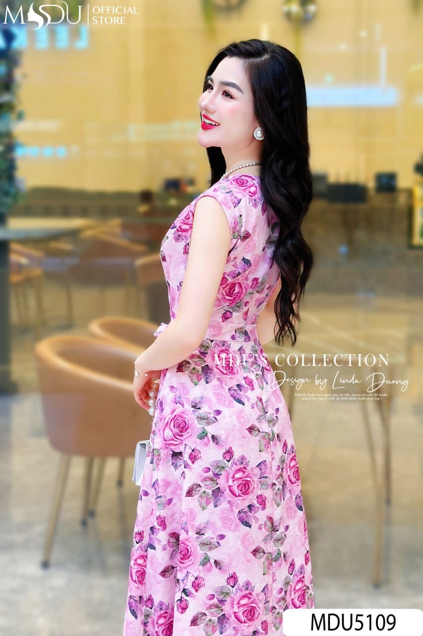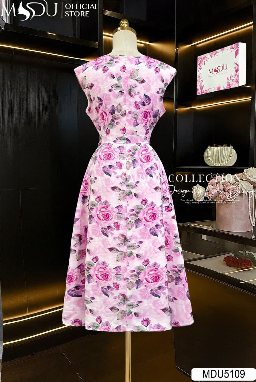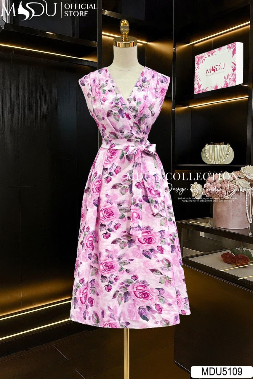 Váy Thiết Kế MDU5109 Lụa Hàn Mềm Mượt Cổ Đắp Chéo – Họa Tiết Hoa Hồng Ngọt Ngào Nền Hồng Dịu Mắt