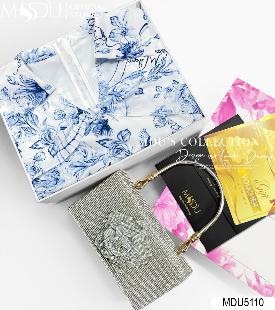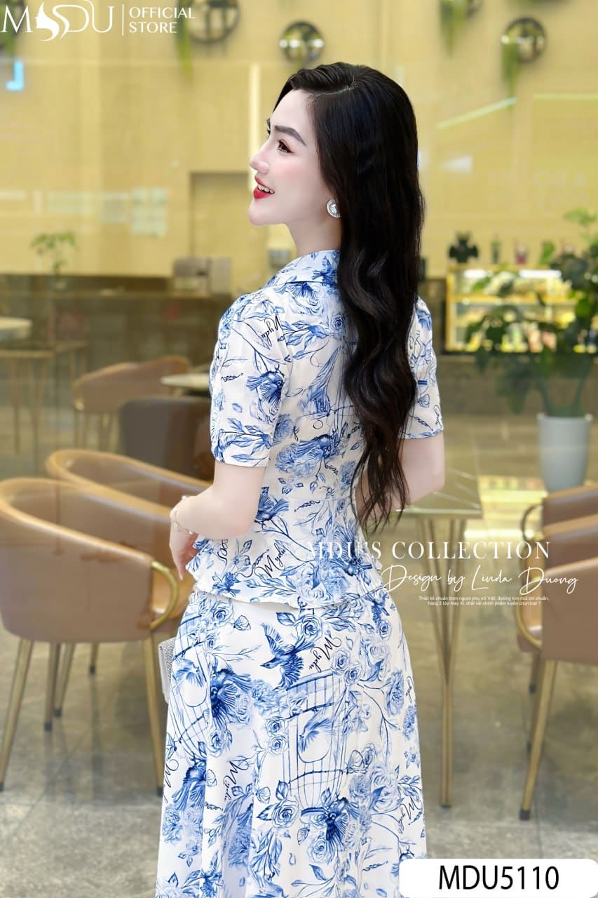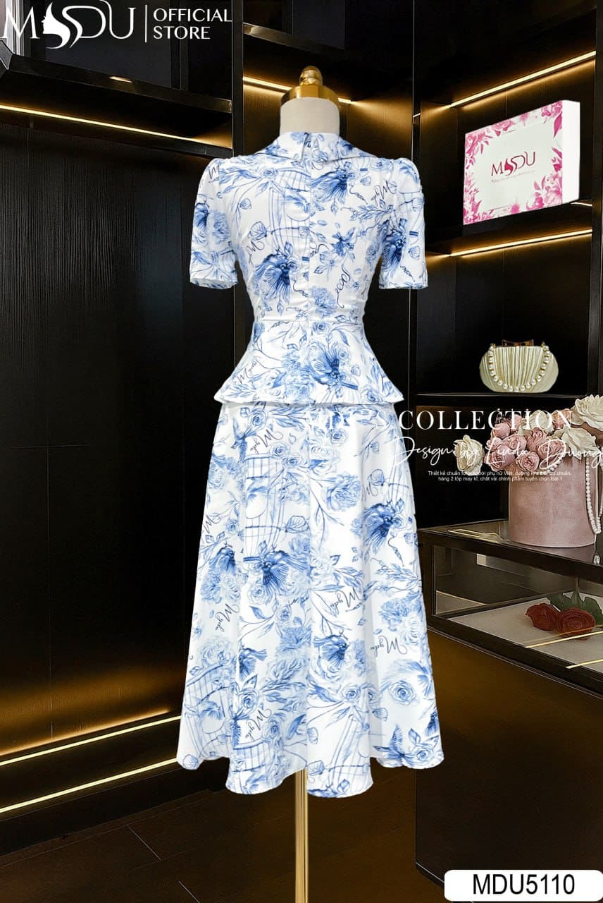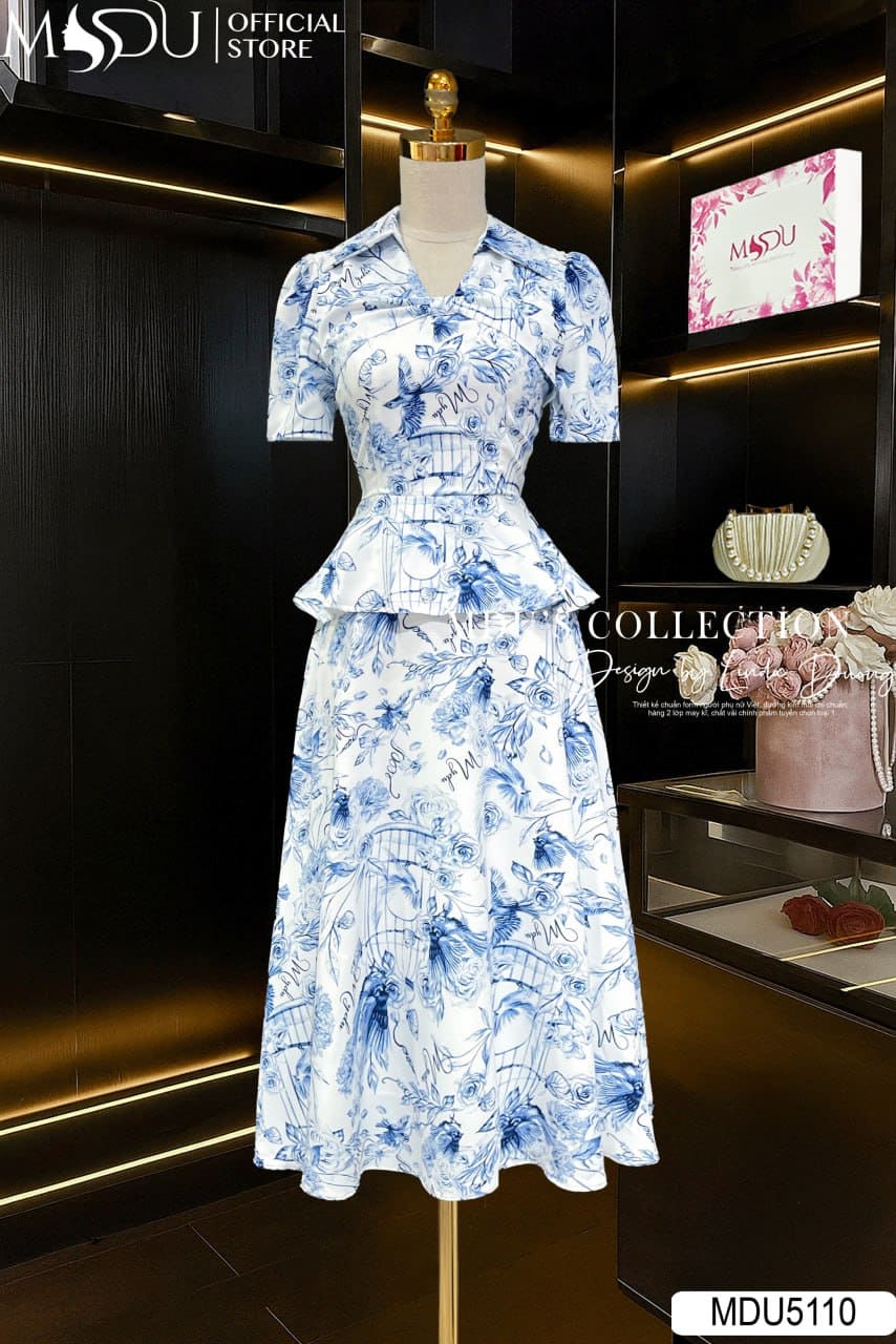 Váy Thiết Kế MDU5110 Lụa Mango Cổ V Sâu Peplum Hoa Xanh Thanh Lịch