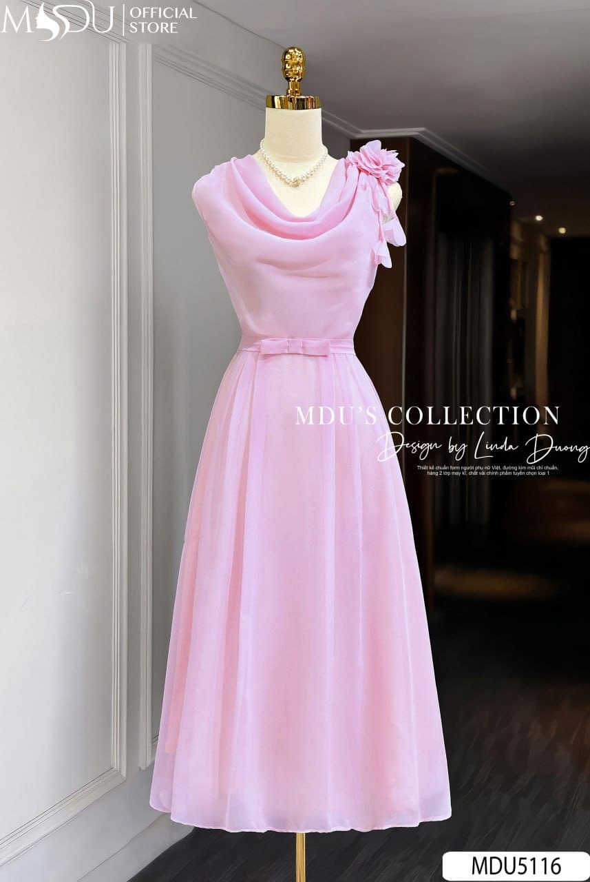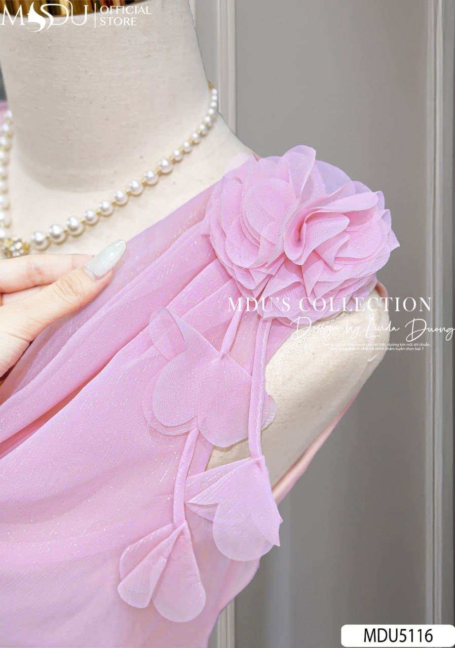 Váy Thiết Kế MDU5116 Tơ Tằm Ánh Nhũ Hồng Pastel Cổ Đổ Lệch Vai Hoa Vai Dáng Xòe Nhẹ