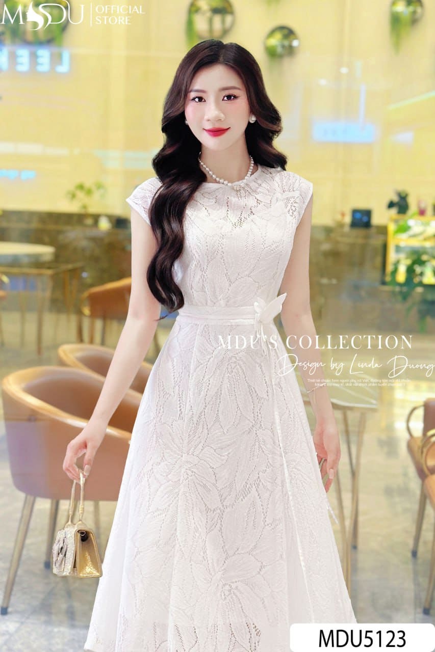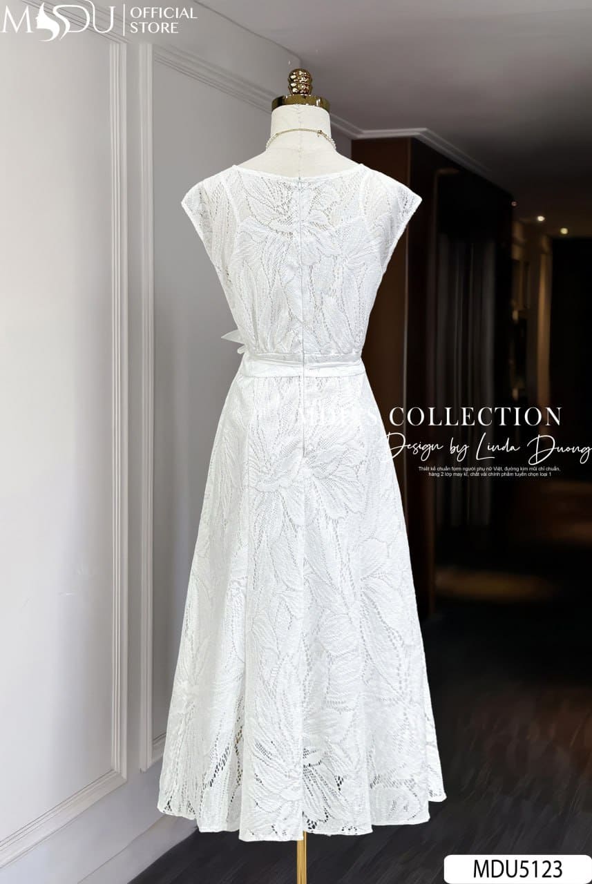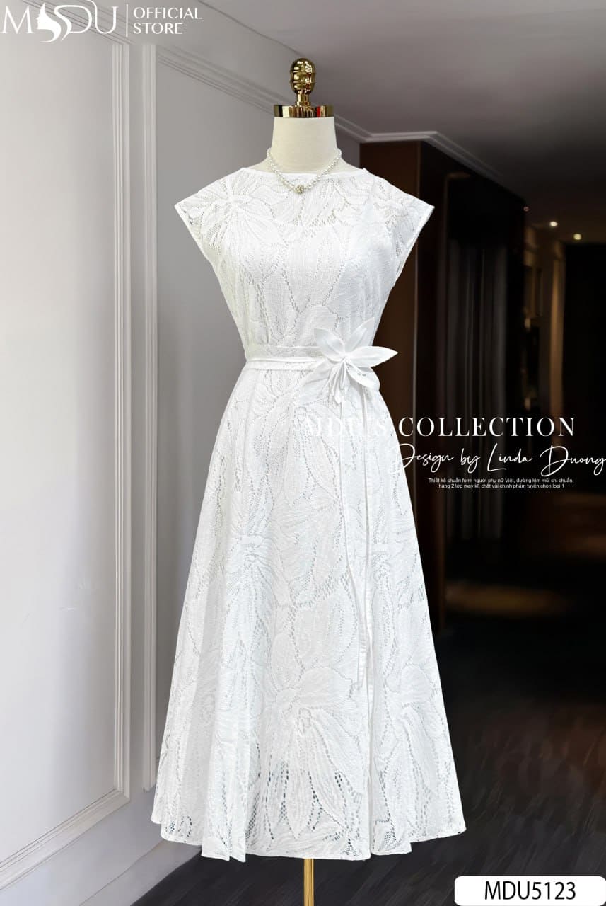 Váy Thiết Kế MDU5123 Ren Lá Nổi Trắng Kem Dáng Xòe Qua Gối – Kín Đáo, Nữ Tính, Sang Trọng