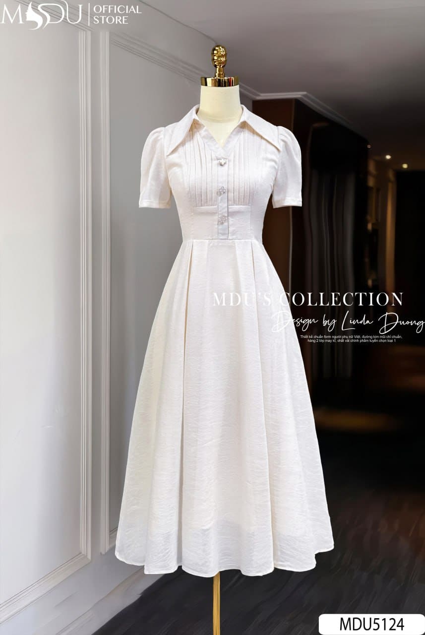 Váy Thiết Kế MDU5124 Tơ Cát Vân Đá Cao Cấp Dáng Dài Xòe Nhẹ Cổ Bẻ Xếp Ly Trước Ngực Thanh Lịch Và Nữ Tính