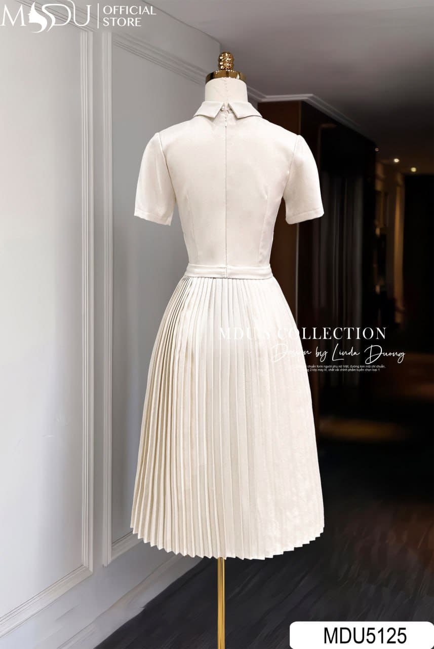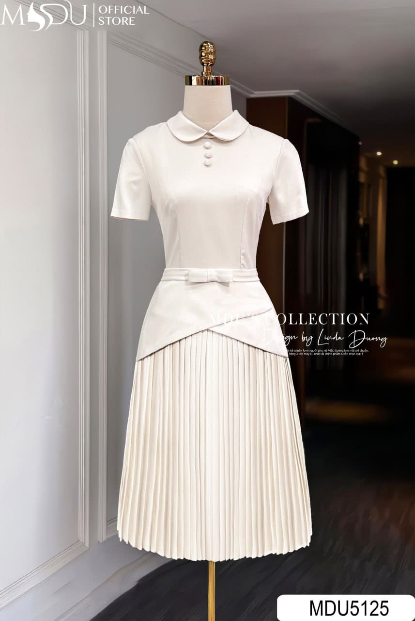 Váy Thiết Kế MDU5125 Lụa Mango Ý Cổ Peter Pan Peplum Giả Chân Váy Xếp Ly Màu Be Kem