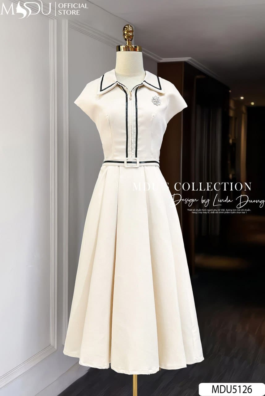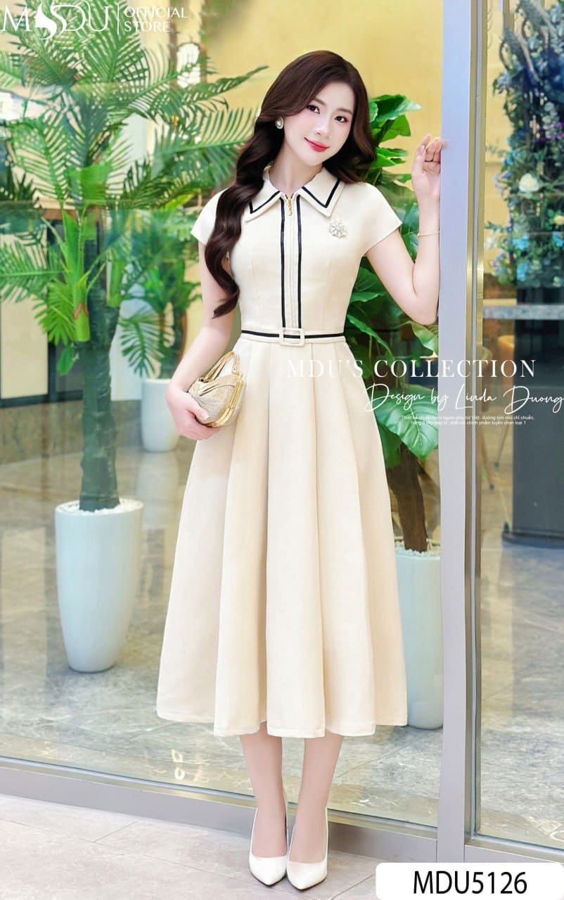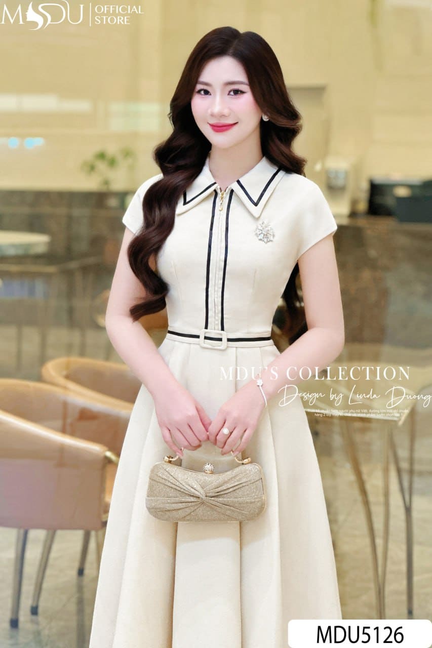 MDU Fashion trân trọng giới thiệu thiết kế MDU5126 – một sáng tạo thời trang mang đậm tinh thần thanh lịch hiện đại, được phát triển từ chất liệu mango Ý cao cấp mềm mịn, đứng dáng vừa phải. Thiết kế nổi bật với sắc kem nhã nhặn phối viền đen tinh tế, tạo điểm nhấn thị giác duyên dáng mà vẫn giữ được sự tối giản cần thiết. Dáng váy dài xòe nhẹ với tùng xếp ly mềm mại giúp mỗi bước chân trở nên uyển chuyển và duyên dáng hơn bao giờ hết.