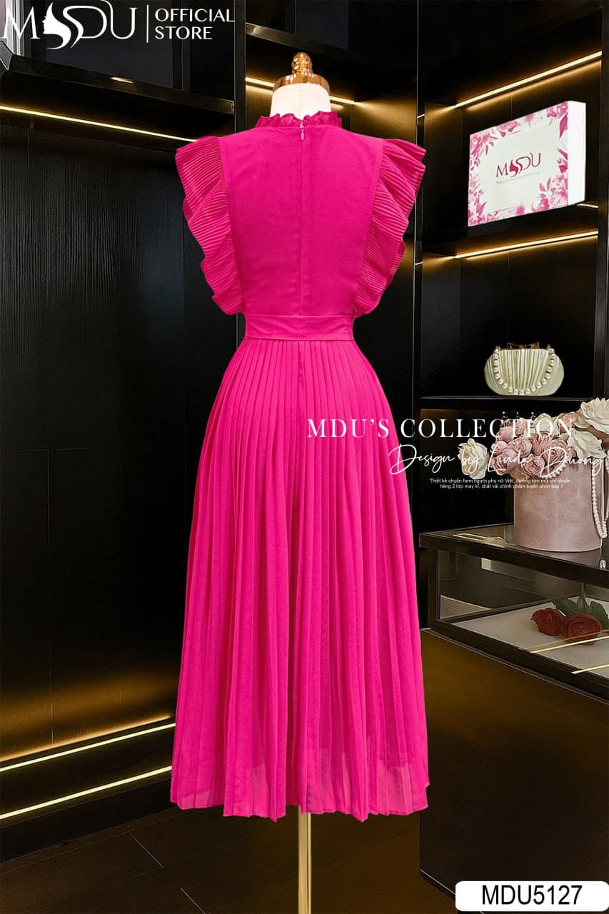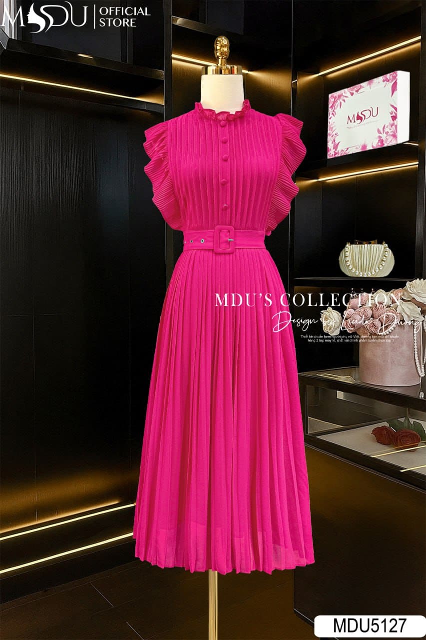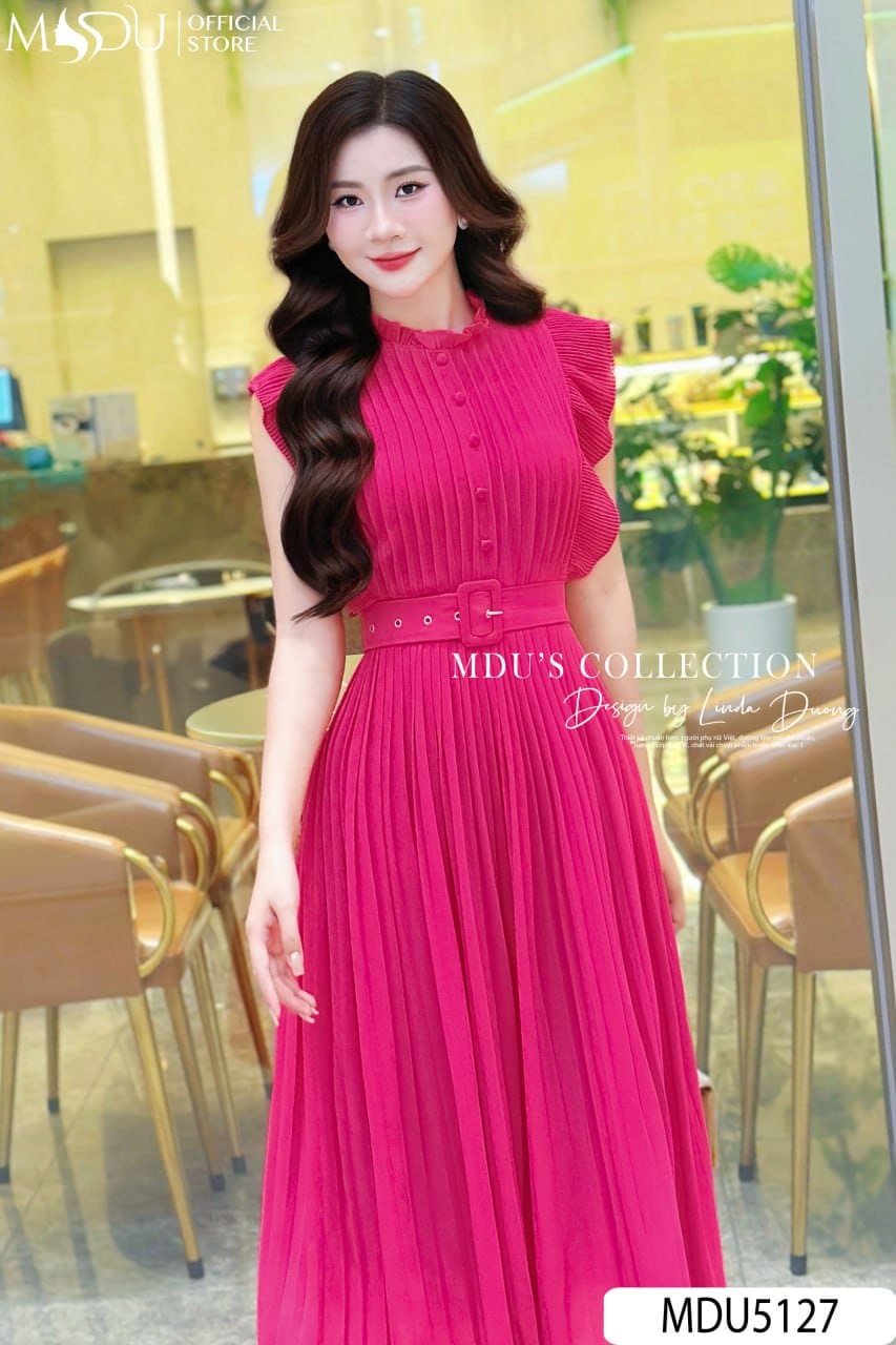 Váy Thiết Kế MDU5127 Voan Cát Hàn Xếp Ly Hồng Đậm – Dịu Dàng Bay Bổng, Tôn Vẻ Nữ Tính Tinh Tế