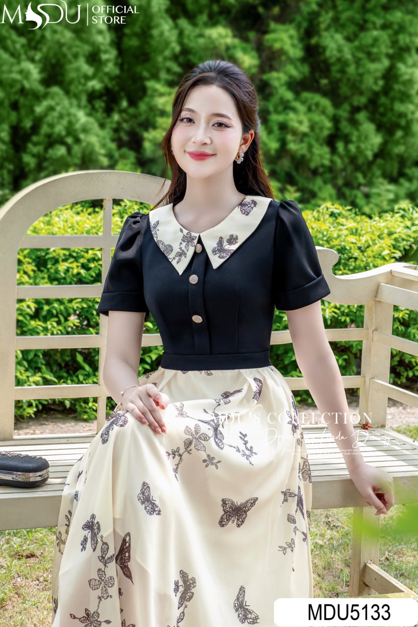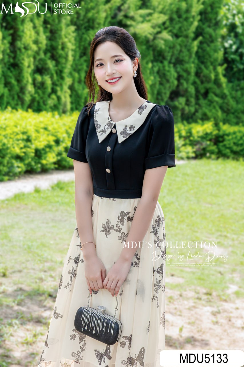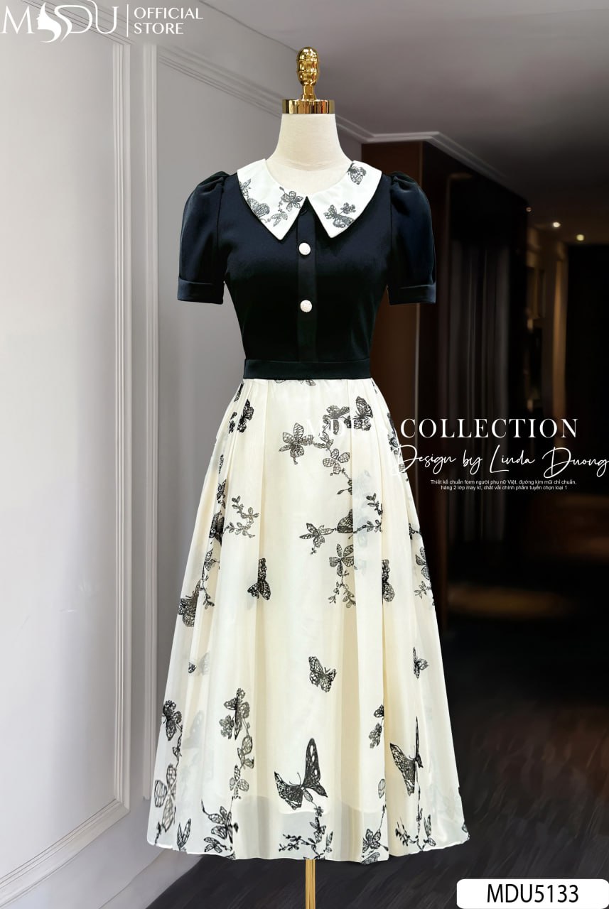 Váy Thiết Kế MDU5133 Lụa Mango Đen Phối Tơ Óng Trắng Họa Tiết Hoa Bướm – Cổ Peter Pan Thêu Hoa Tinh Tế, Ngọt Ngào Và Cổ Điển