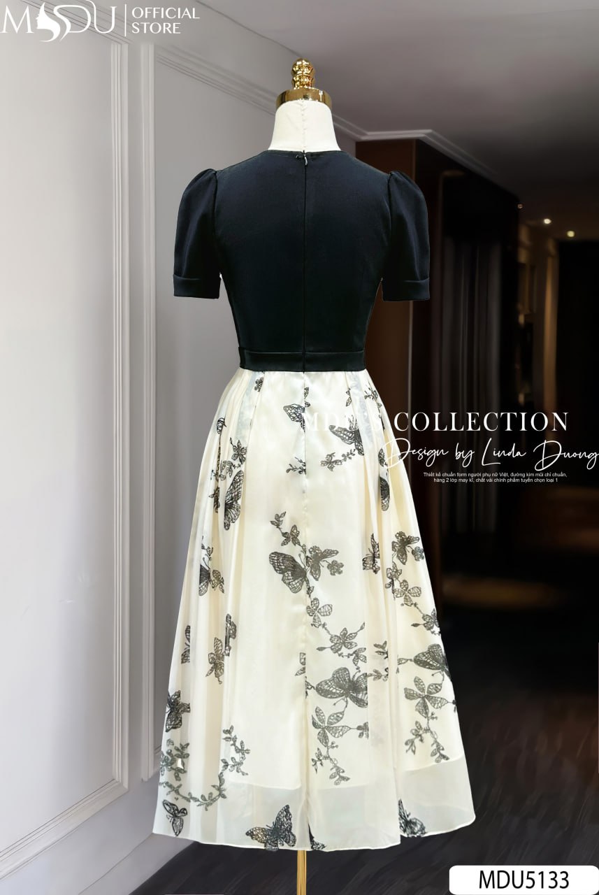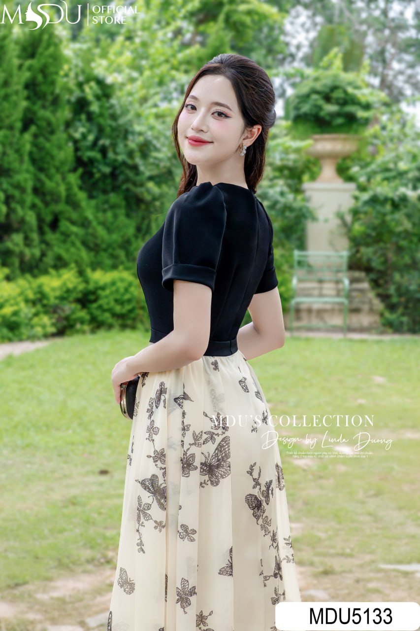 MDU Fashion hân hạnh giới thiệu thiết kế MDU5133 – một tuyệt phẩm váy liền dáng xòe kết hợp hoàn hảo giữa vẻ đẹp cổ điển và nét hiện đại, mang đến diện mạo đầy cuốn hút cho người mặc. Phần thân trên được may từ lụa mango đen mềm mại, ôm nhẹ cơ thể, đối lập hài hòa với chân váy tơ óng trắng tinh khôi, tạo nên hiệu ứng tương phản duyên dáng. Nổi bật hơn cả là họa tiết hoa bướm đen in nổi trên nền trắng ngà – điểm nhấn nghệ thuật thể hiện gu thẩm mỹ tinh tế và độc đáo.