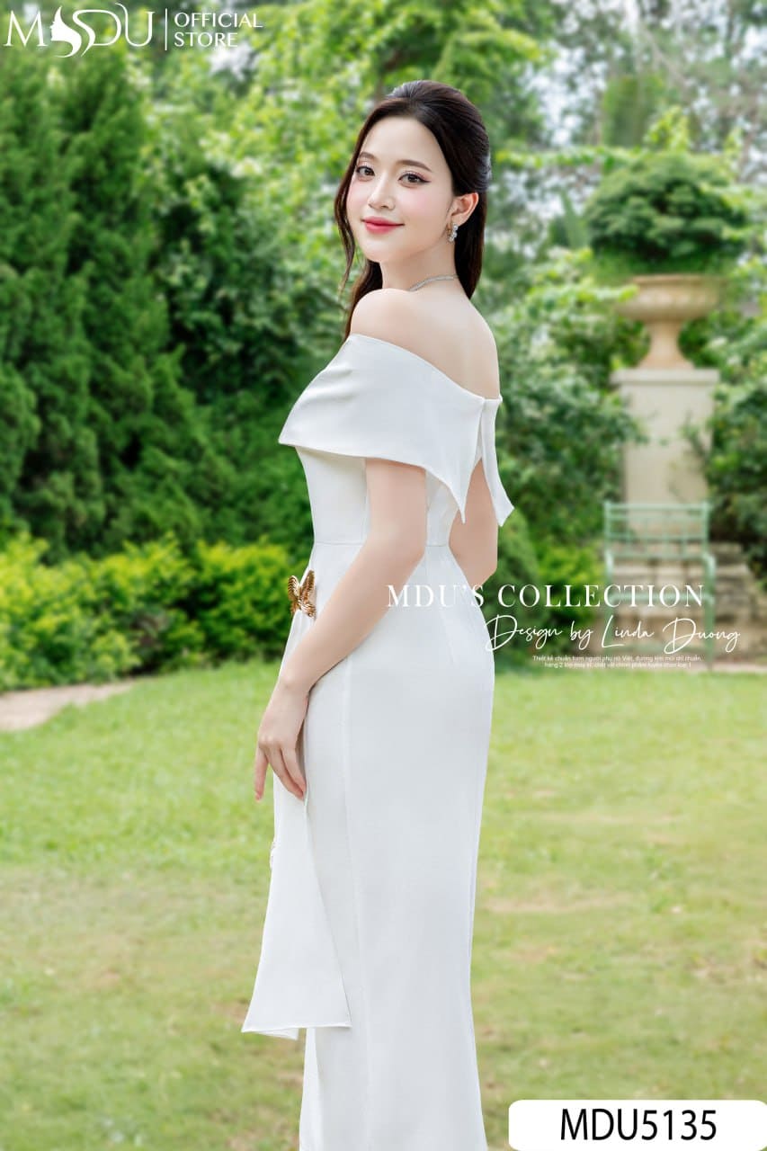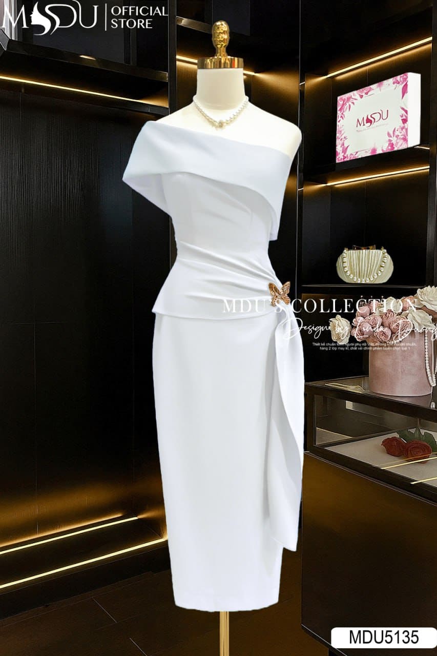 Váy Thiết Kế MDU5135 Lụa Mango Trắng Dáng Ôm Trễ Vai Đính Bướm Ánh Vàng Drape Eo Tinh Tế