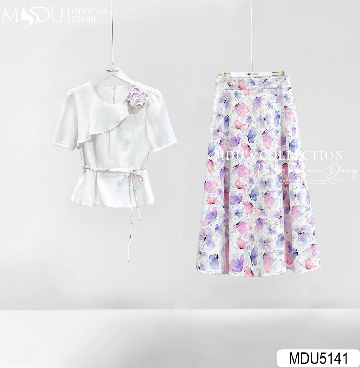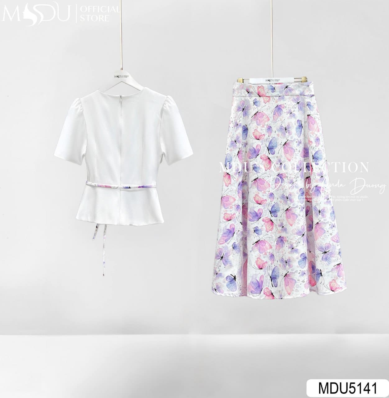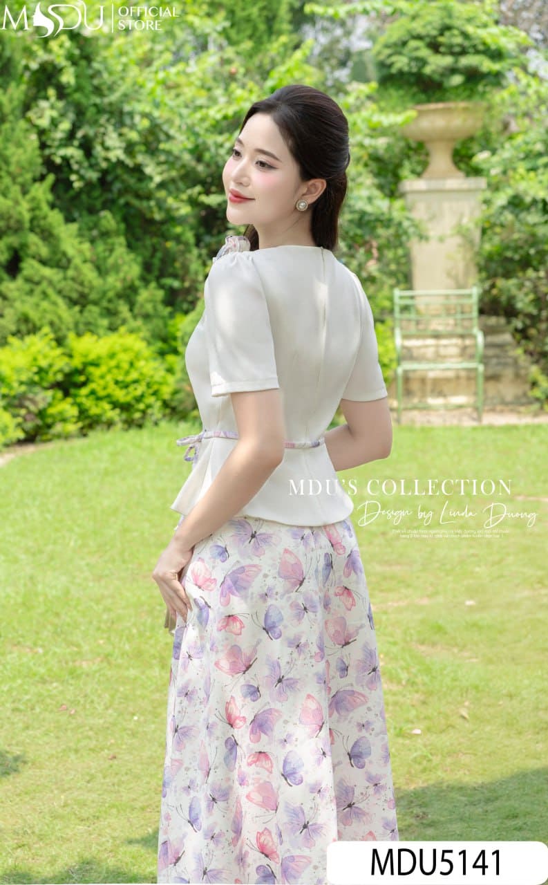 Set Thiết Kế MDU5141 Lụa Vân Cổ Tròn Hoa Vai Áo Trắng Kem & Chân Váy A Họa Tiết Bướm Thơ Mộng
