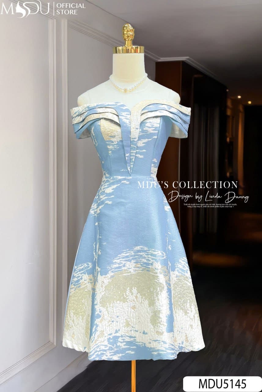 Váy Thiết Kế MDU5145 Gấm Xanh Ngọc Ánh Bạc Dáng Xòe Vai Trễ Cổ Tim – Quý Phái, Tinh Tế Và Tôn Dáng Tuyệt Đối
