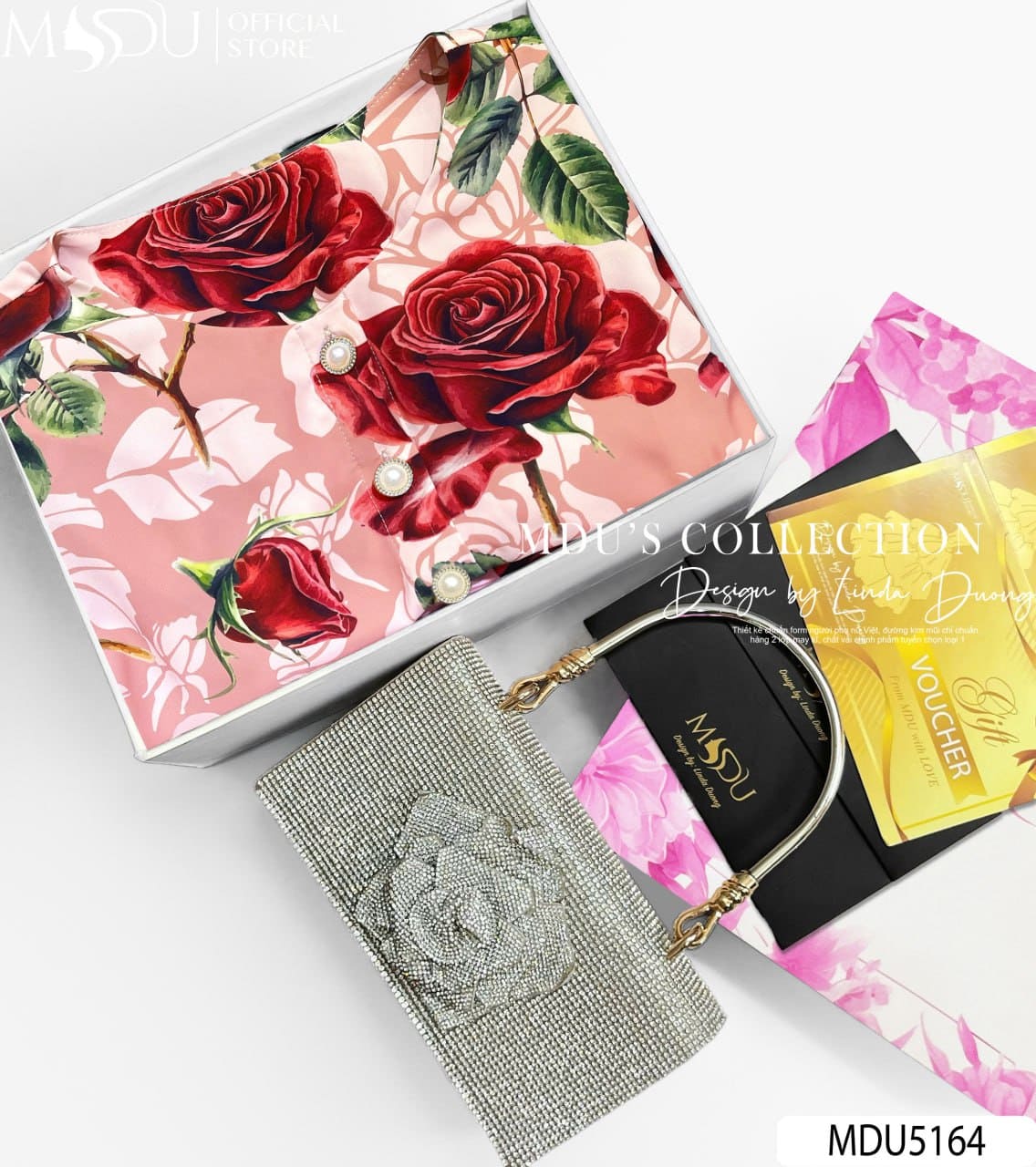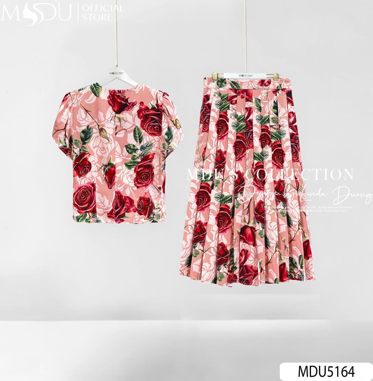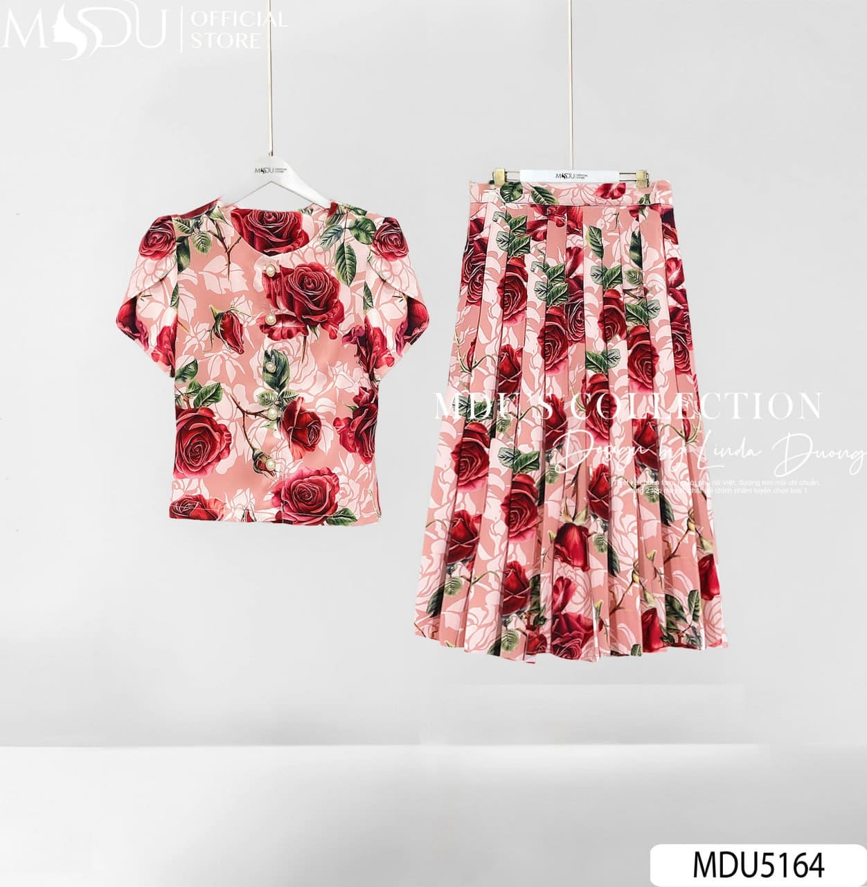 Với sự kết hợp hoàn hảo giữa sắc hồng pastel ngọt ngào, hoa hồng đỏ quyến rũ và chi tiết nút ngọc sang trọng, MDU5164 là lựa chọn lý tưởng cho những buổi dạo phố, hẹn hò hay tiệc nhẹ. Bộ trang phục không chỉ mang đến vẻ ngoài duyên dáng, trẻ trung mà còn giúp người mặc tự tin tỏa sáng theo phong cách riêng.