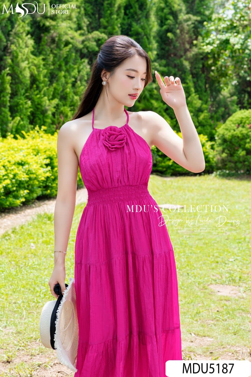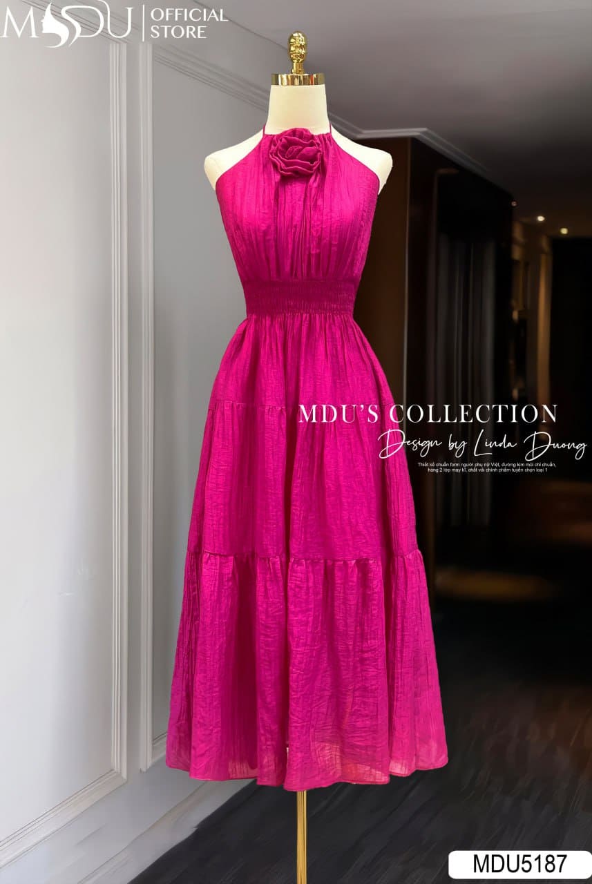 Váy Thiết Kế MDU5187 Tơ Xốp Nhăn Cao Cấp – Dáng Maxi Cổ Yếm Buộc Dây – Hoa Trang Trí Bản Lớn – Sắc Hồng Fuchsia Nổi Bật