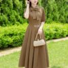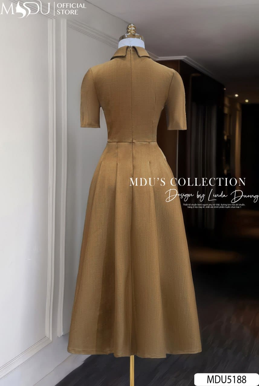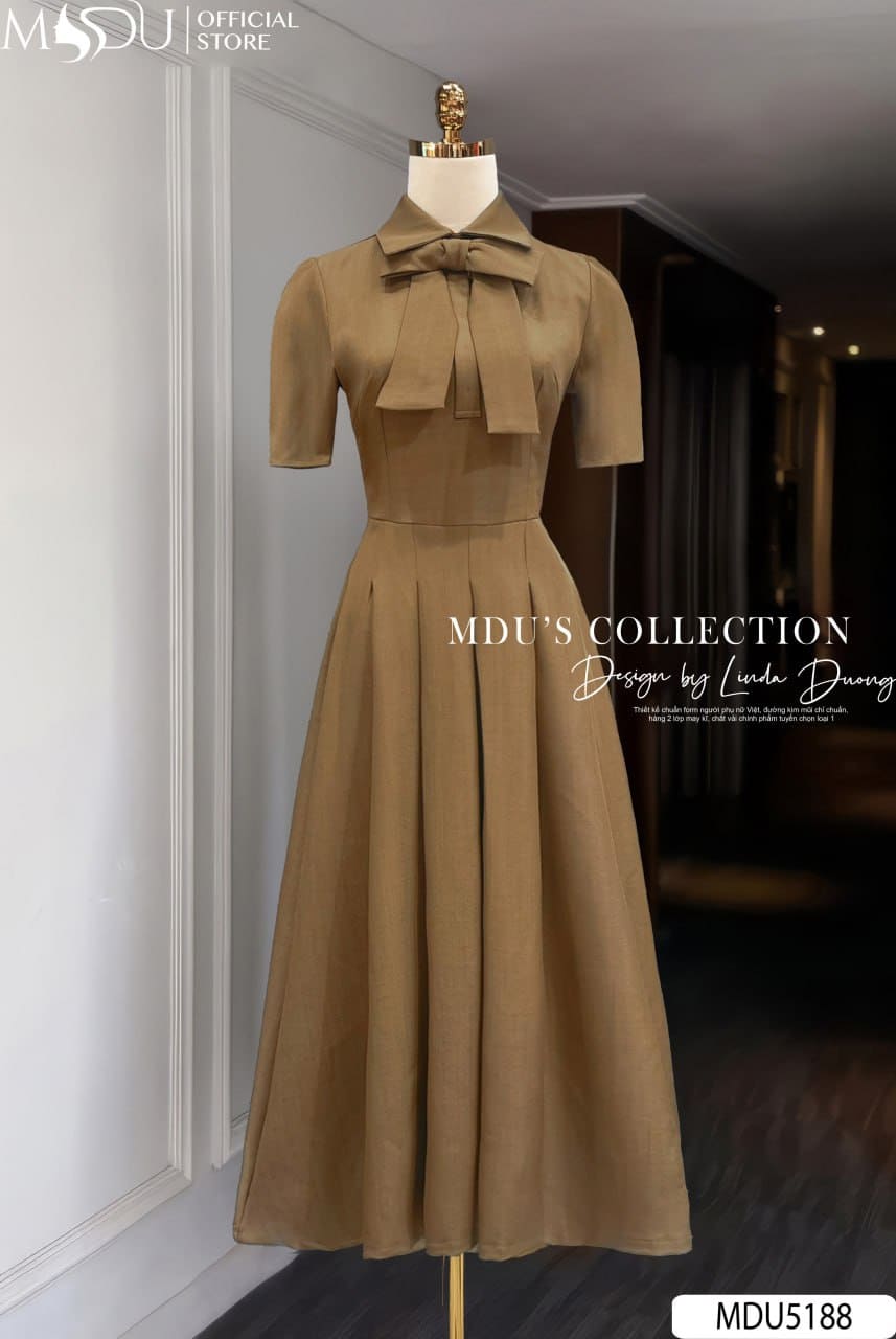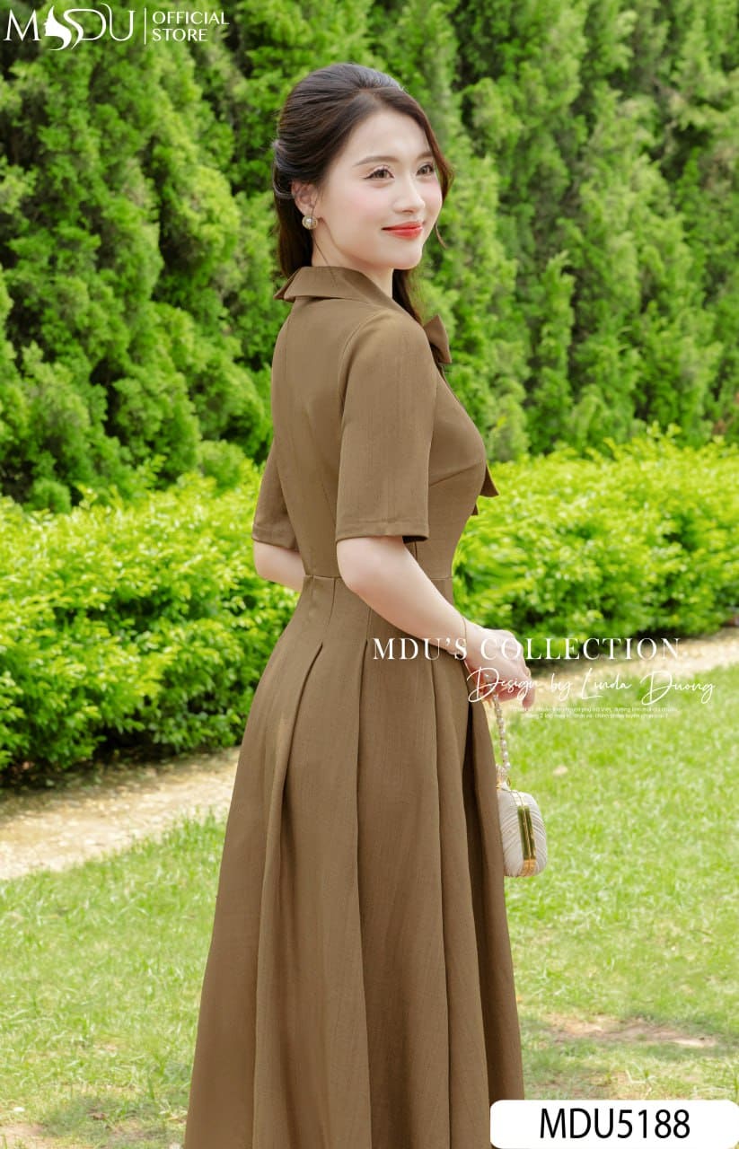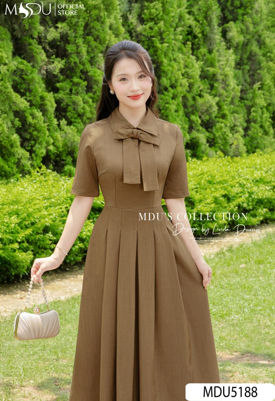Váy Thiết Kế MDU5188 Xước Thái Nâu Dáng Xòe Dài Cổ Bẻ Nơ To Xếp Ly Tôn Dáng