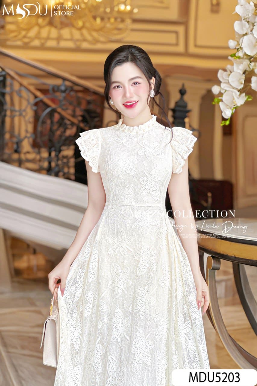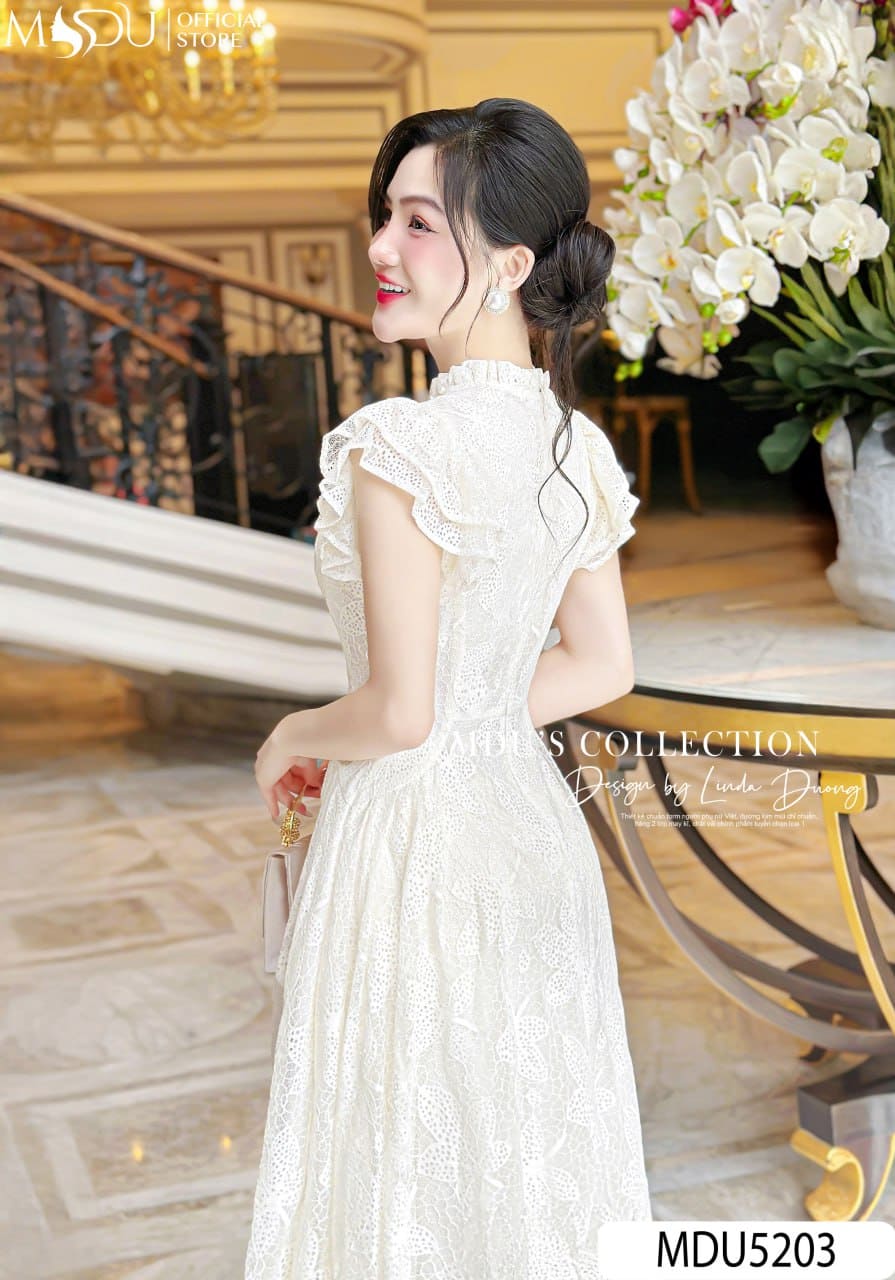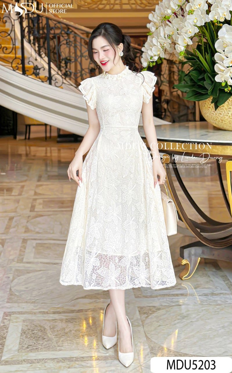 Sắc trắng kem nhẹ nhàng kết hợp với ren hoa lớn tạo nên một tổng thể tinh khôi, sang trọng và vô cùng nổi bật. Mẫu váy MDU5203 phù hợp cho nhiều dịp: từ dự tiệc, sự kiện, buổi hẹn hò lãng mạn cho đến những buổi dạo phố thanh lịch. Đây là lựa chọn hoàn hảo dành cho nàng yêu thích vẻ đẹp hiện đại pha chút cổ điển, vừa nữ tính vừa cuốn hút.