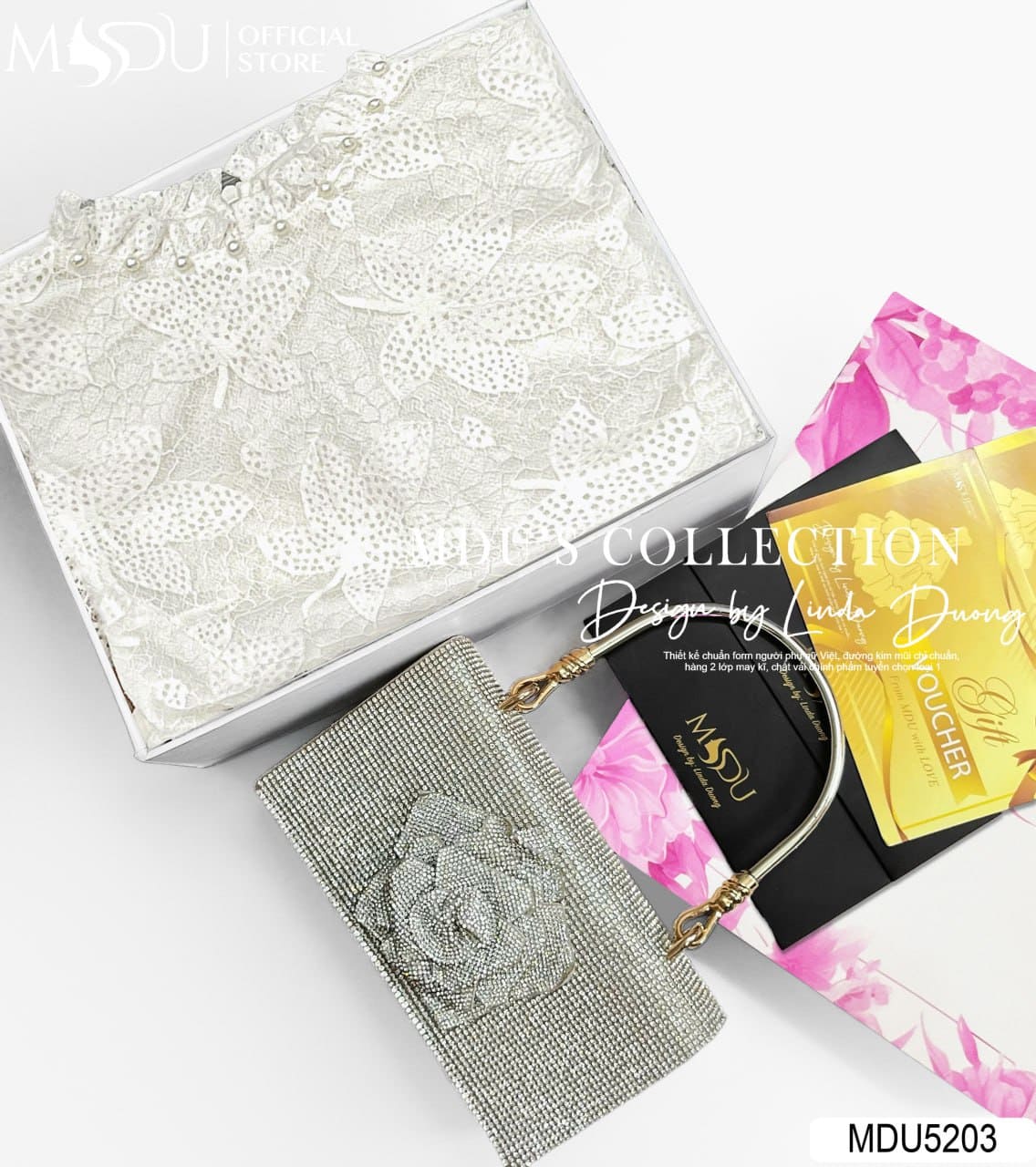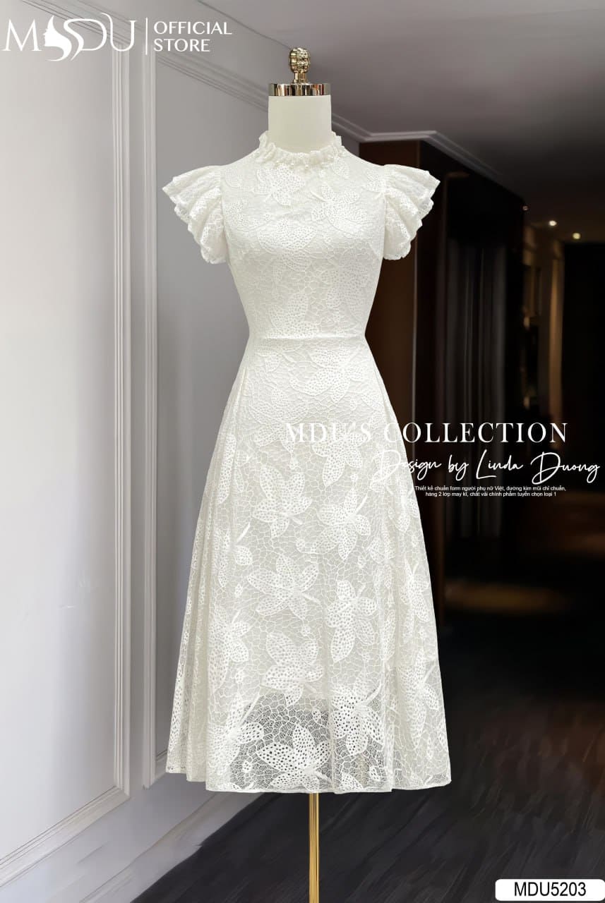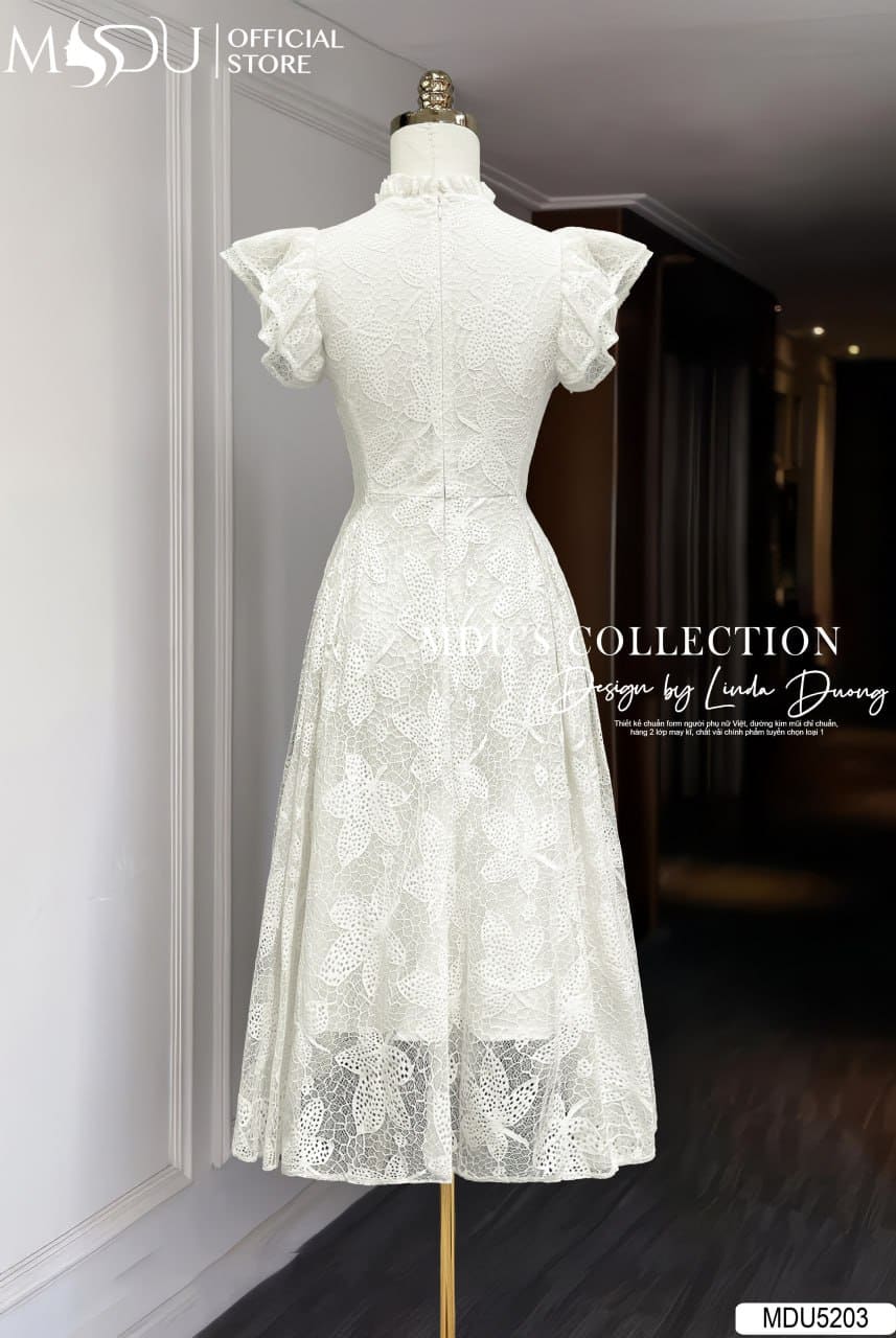 Sắc trắng kem nhẹ nhàng kết hợp với ren hoa lớn tạo nên một tổng thể tinh khôi, sang trọng và vô cùng nổi bật. Mẫu váy MDU5203 phù hợp cho nhiều dịp: từ dự tiệc, sự kiện, buổi hẹn hò lãng mạn cho đến những buổi dạo phố thanh lịch. Đây là lựa chọn hoàn hảo dành cho nàng yêu thích vẻ đẹp hiện đại pha chút cổ điển, vừa nữ tính vừa cuốn hút.
