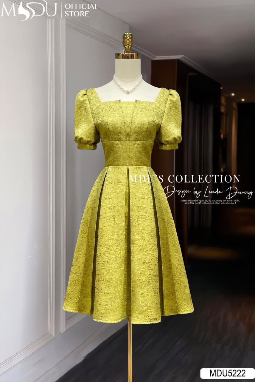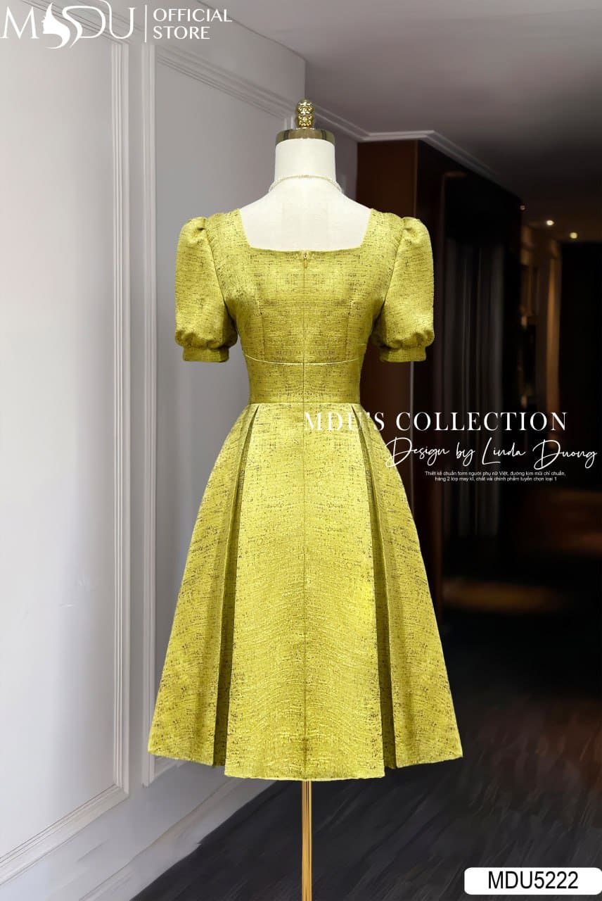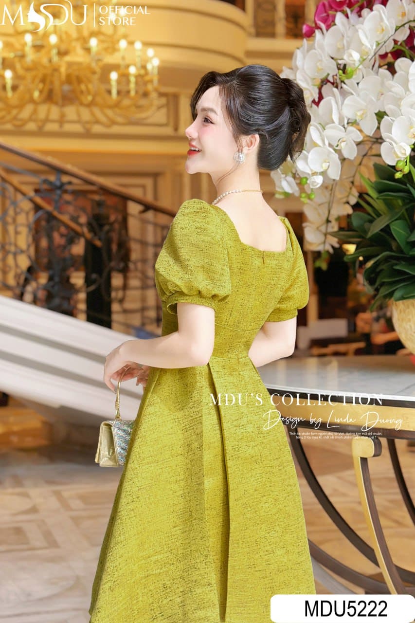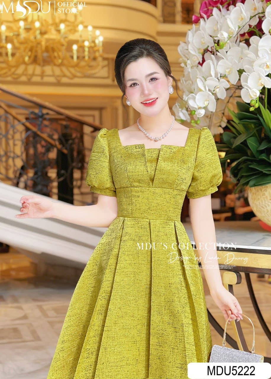 Điểm nhấn nổi bật của MDU5222 chính là phần cổ vuông cách điệu – vừa tôn dáng cổ vai, vừa mang hơi thở hiện đại. Tay bồng ngắn tạo sự cân đối, tăng thêm vẻ nữ tính và trẻ trung. Form váy chữ A xoè nhẹ kết hợp cùng độ dài váy vừa phải, mang lại cảm giác duyên dáng, năng động nhưng vẫn đầy khí chất quý phái.