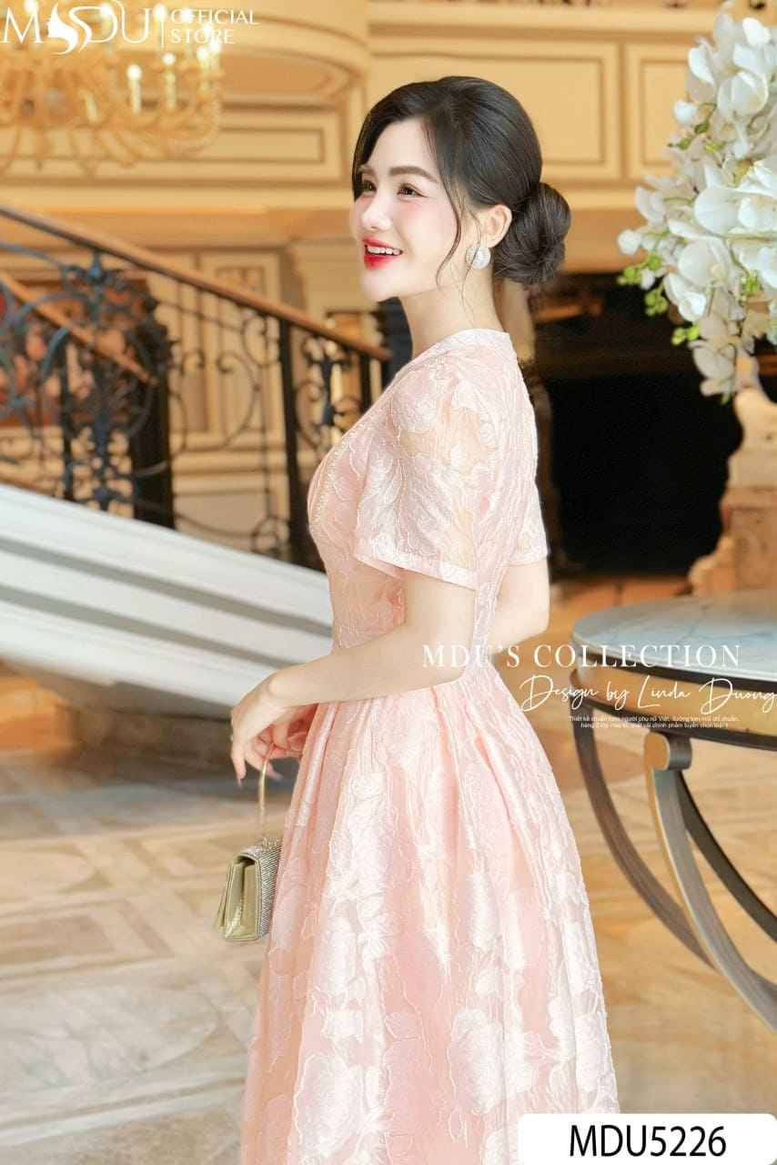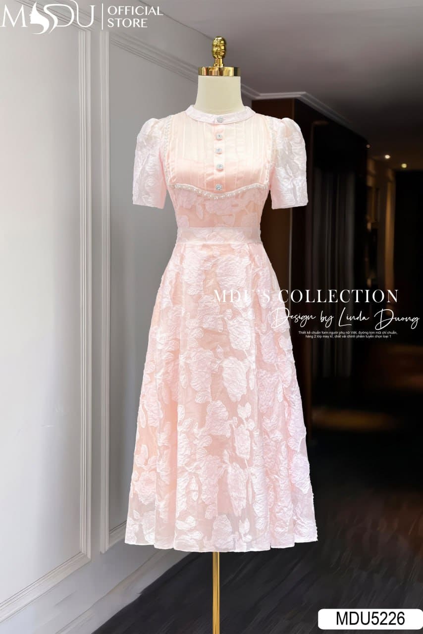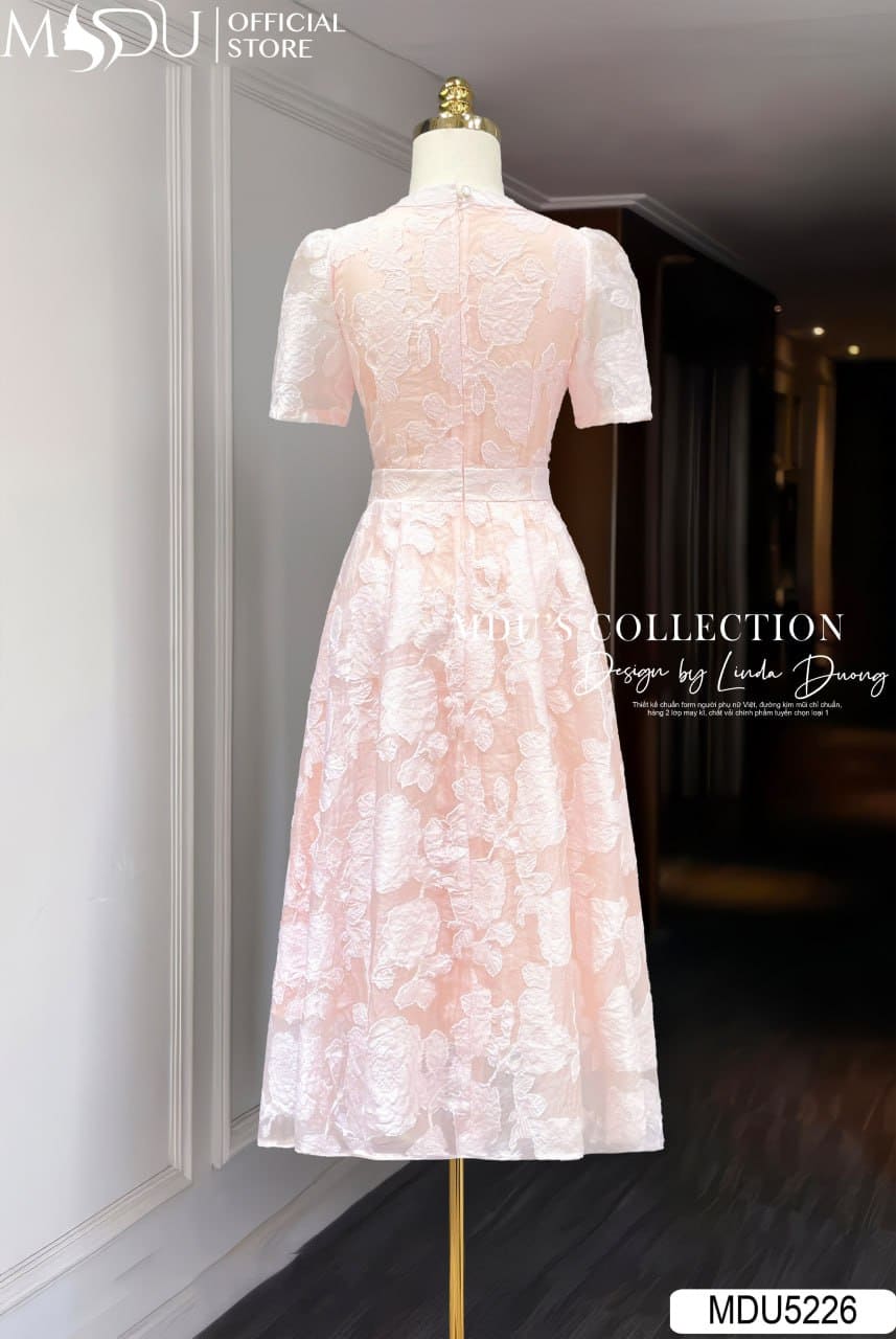 Váy Thiết Kế MDU5226 Tơ Ép Hoa Nổi Cao Cấp Dáng Xòe Qua Gối Hồng Pastel Dịu Dàng Và Nữ Tính