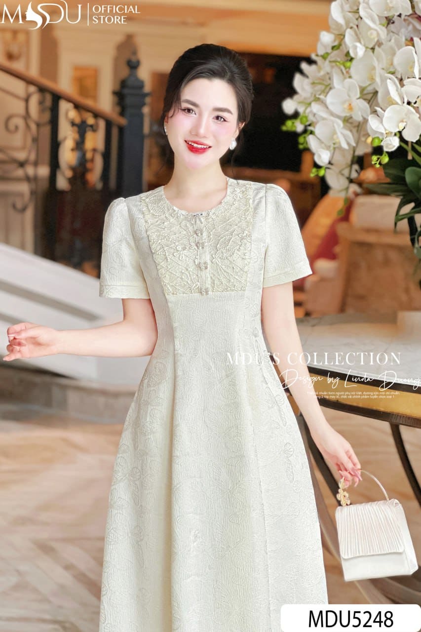 Váy Thiết Kế MDU5248 Gấm Cao Cấp Họa Tiết Nổi Phối Ren Ngực Duyên Dáng Và Quý Phái